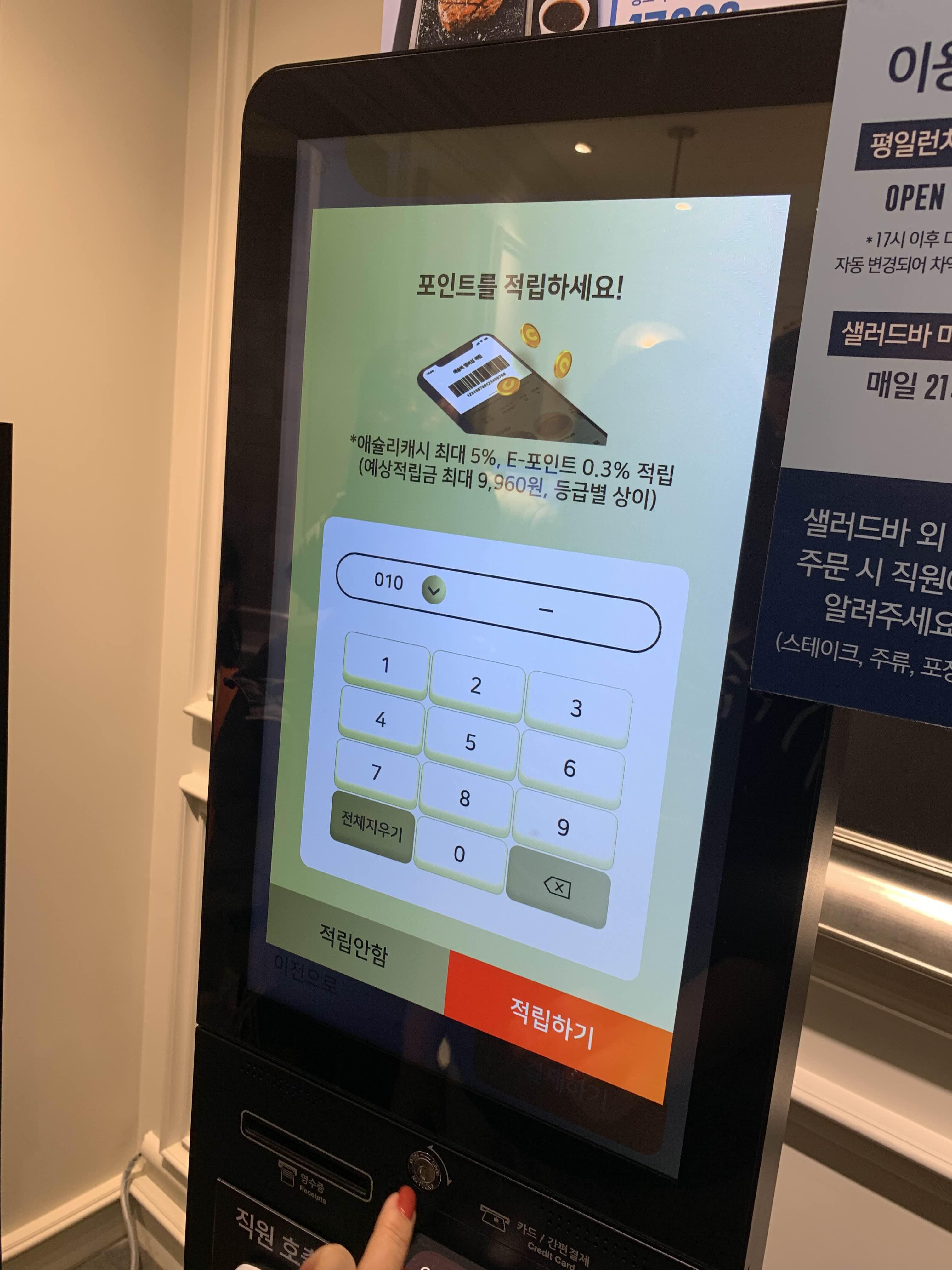 인원수를 입력하고 키오스크에서 결재를 누르면 끝!