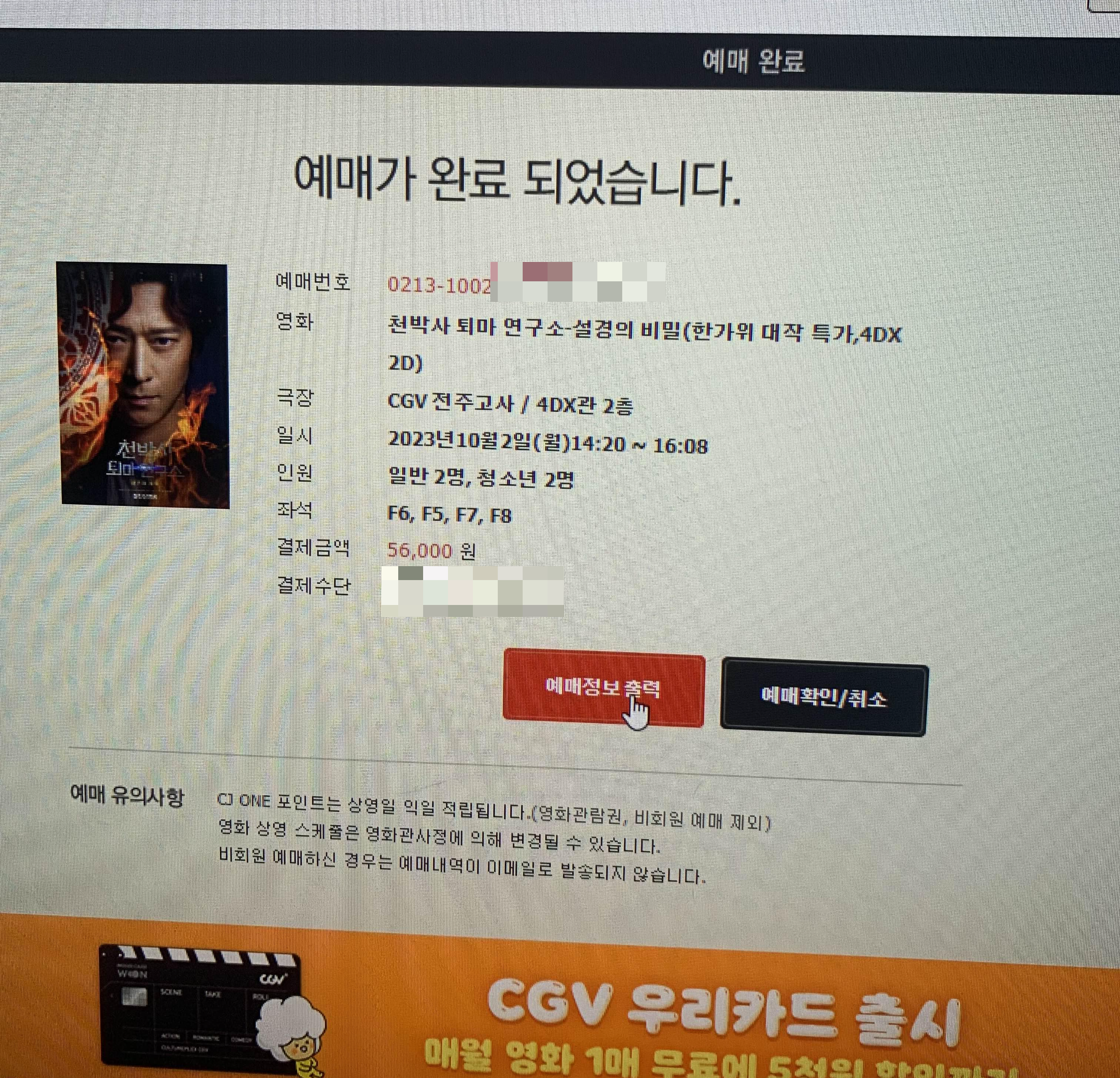성인 2명, 청소년 2명이 4dx 영화관람 요금은 56,000원!!!