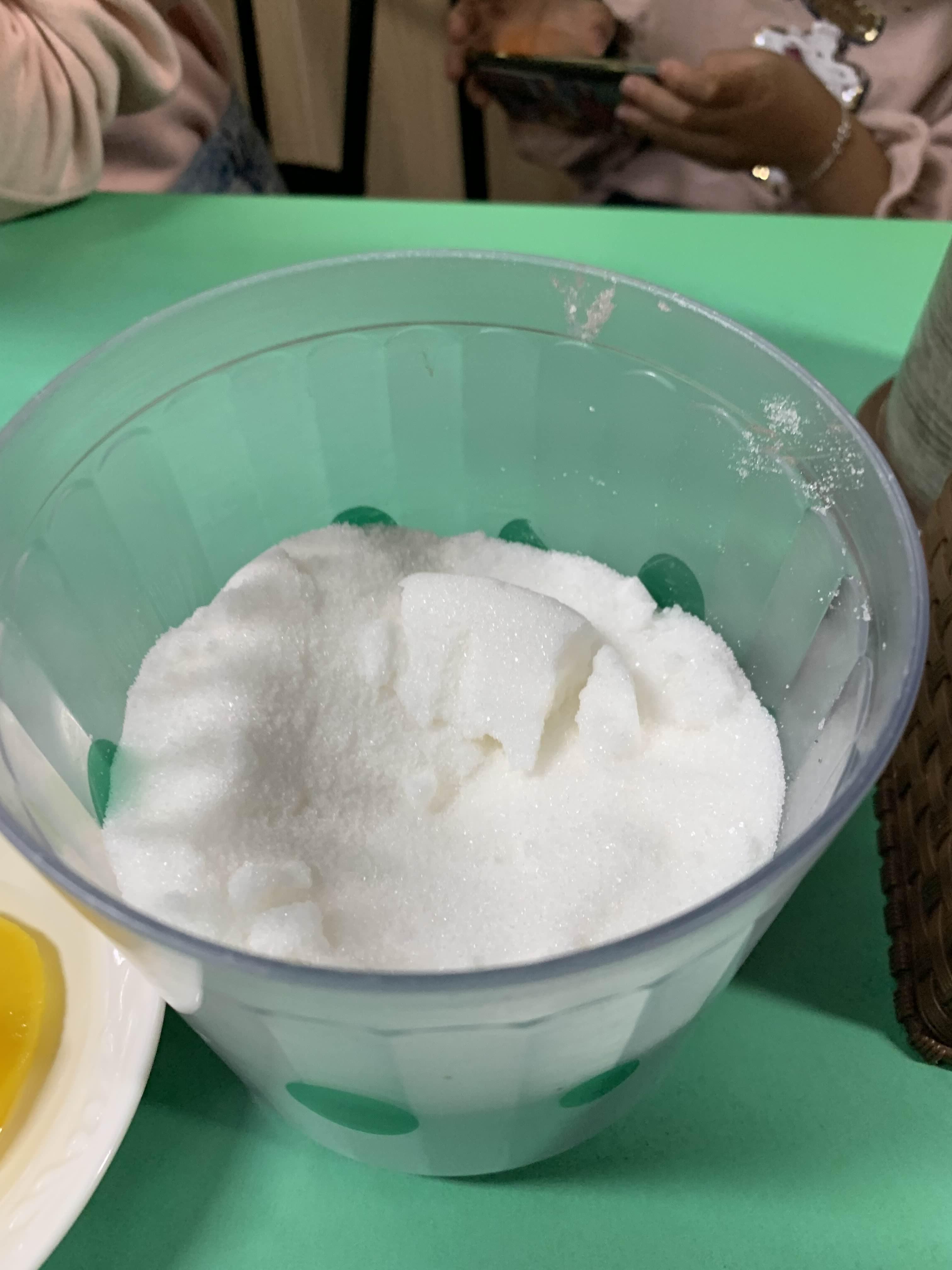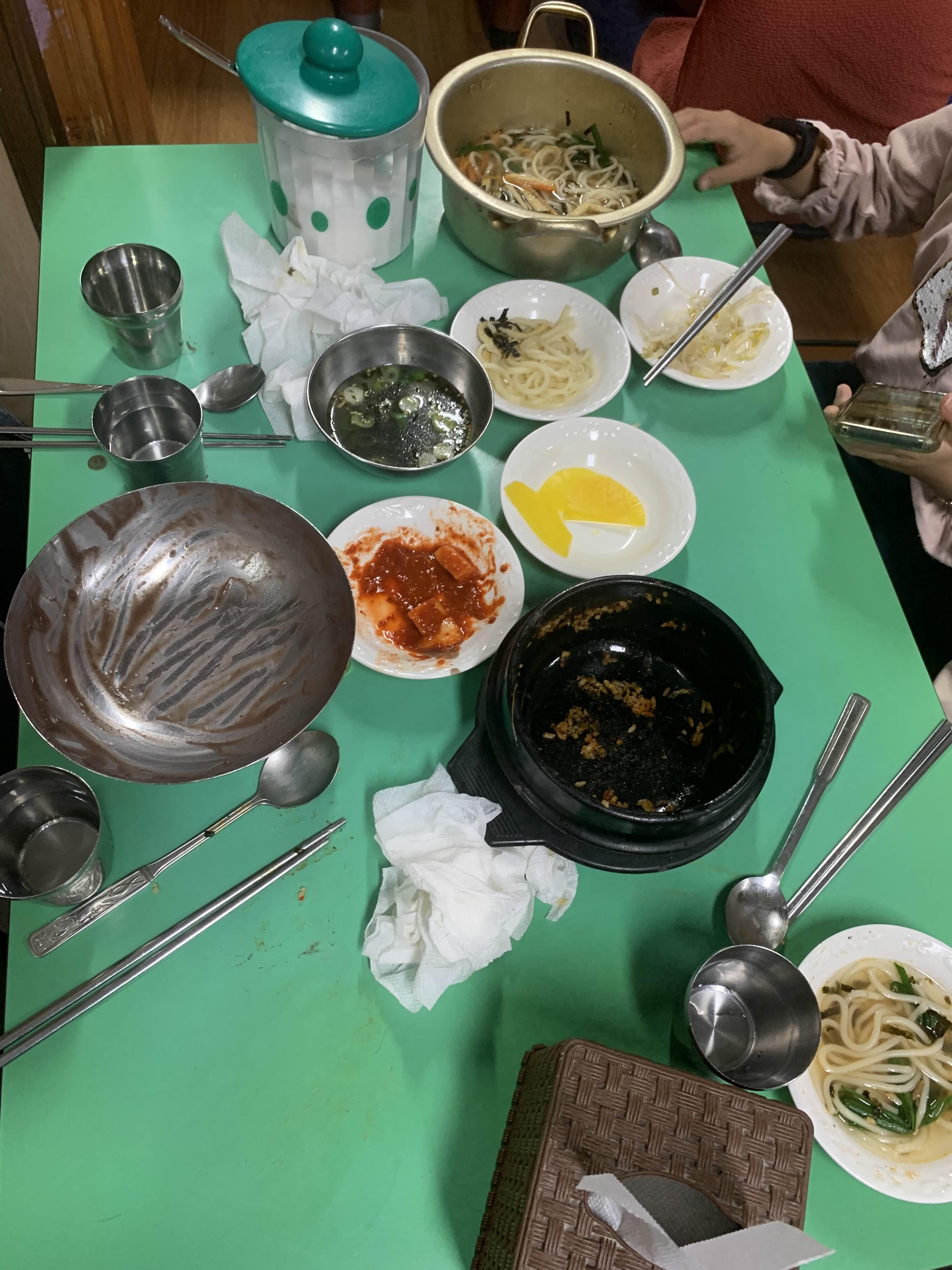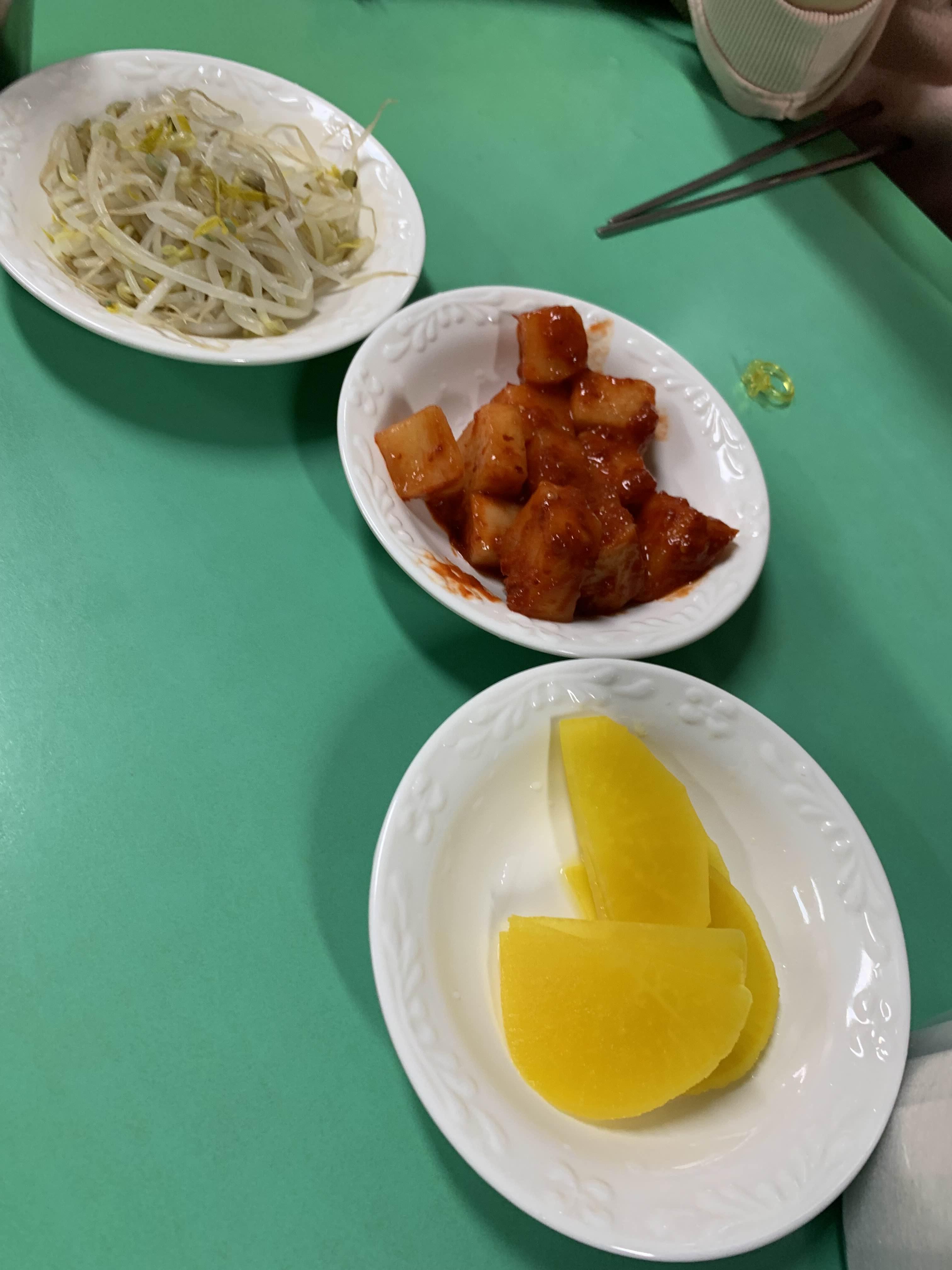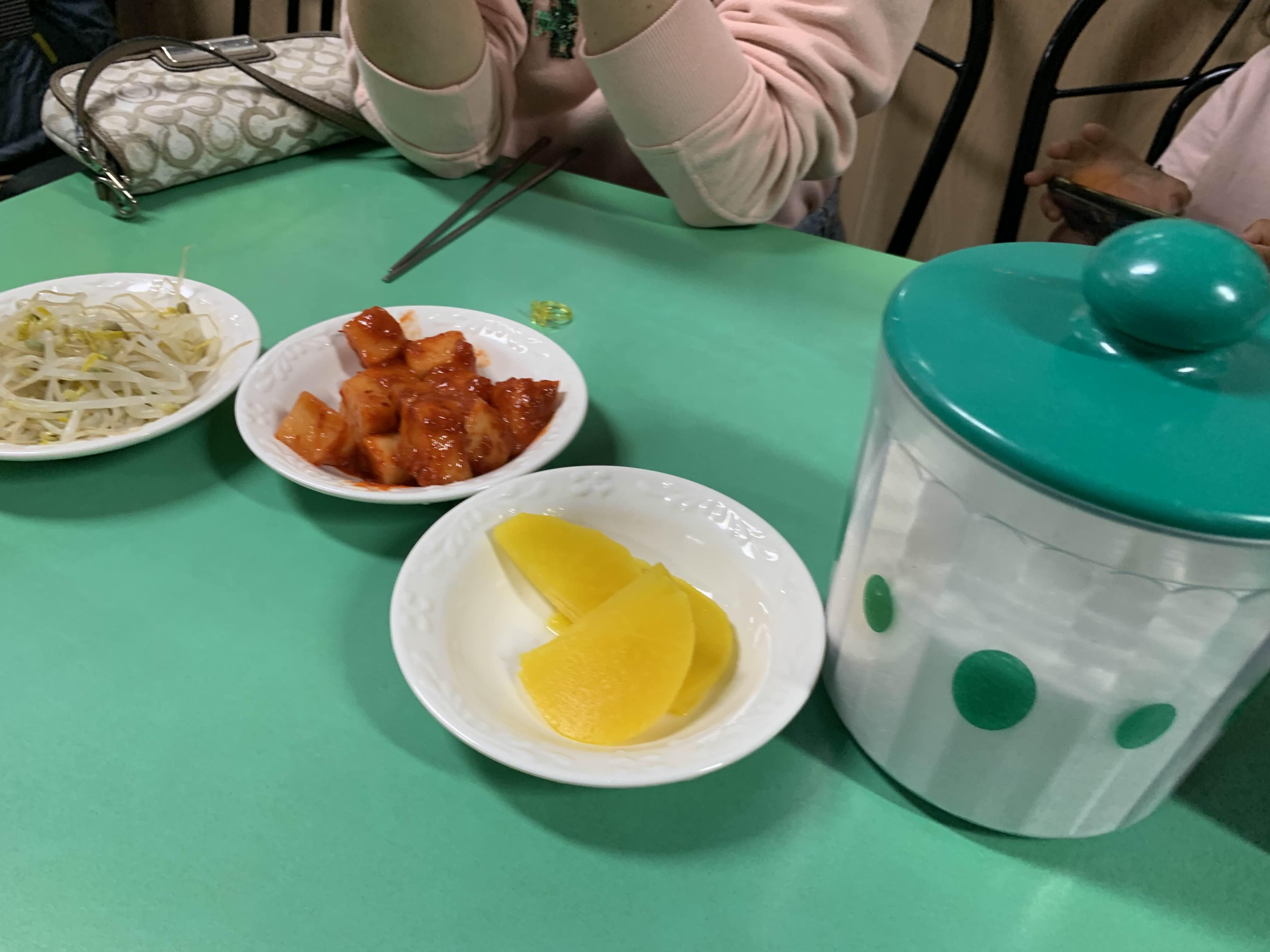음식을 주문하면.... 밑반찬으로 깍두기, 단무지, 숙주무침이 나옵니다. 그리고..... 큰 통에 설탕이 가득!!