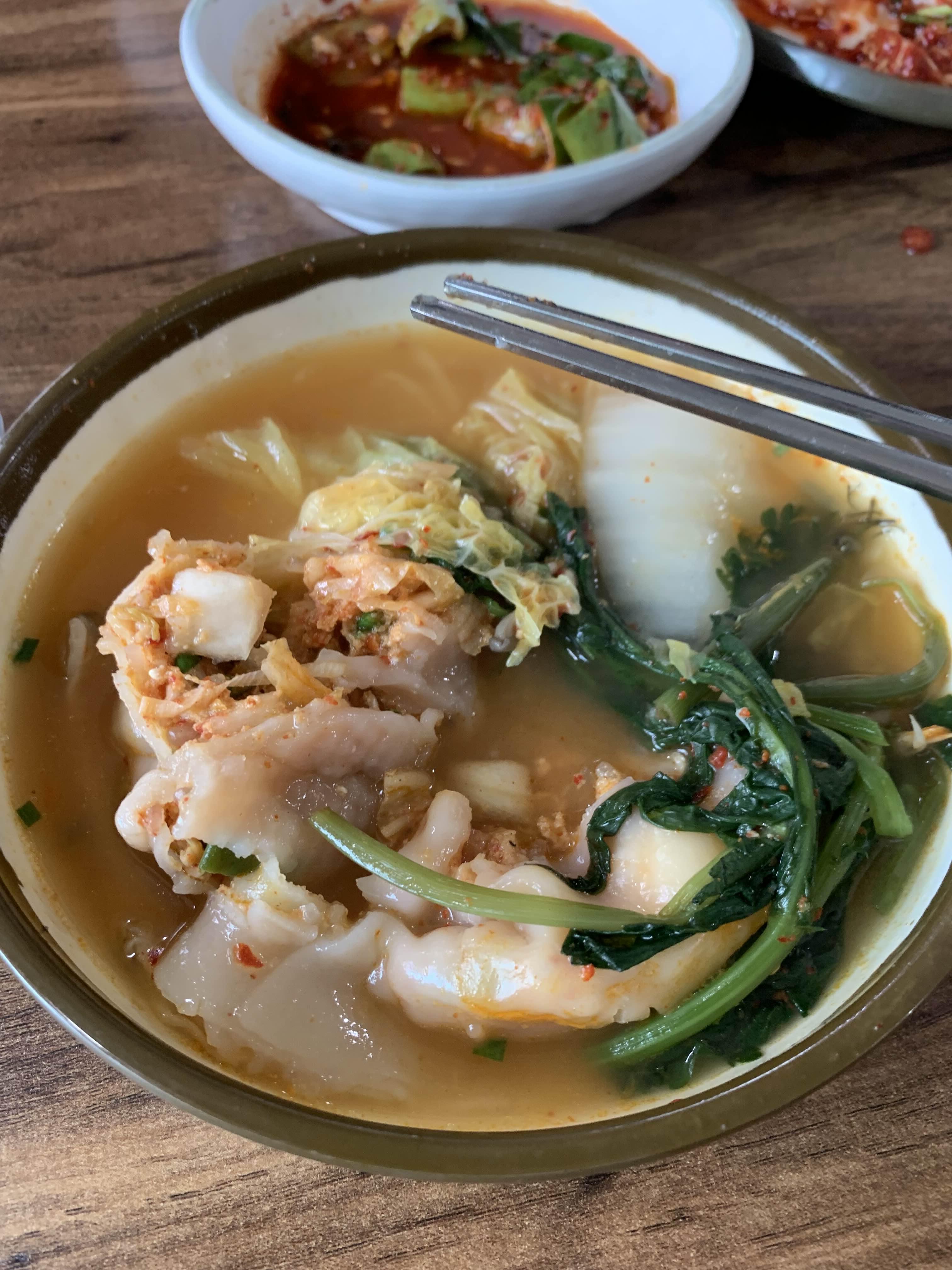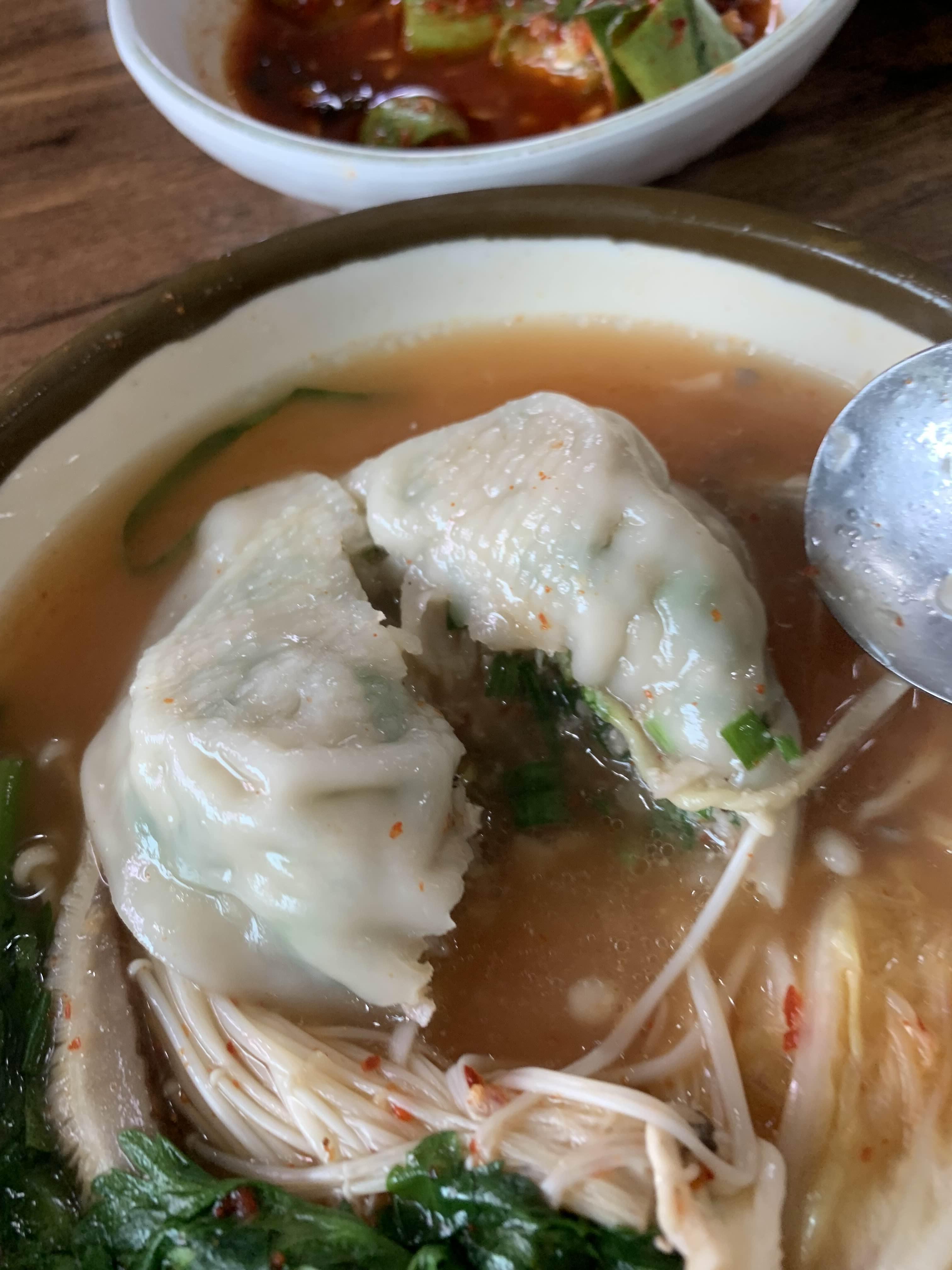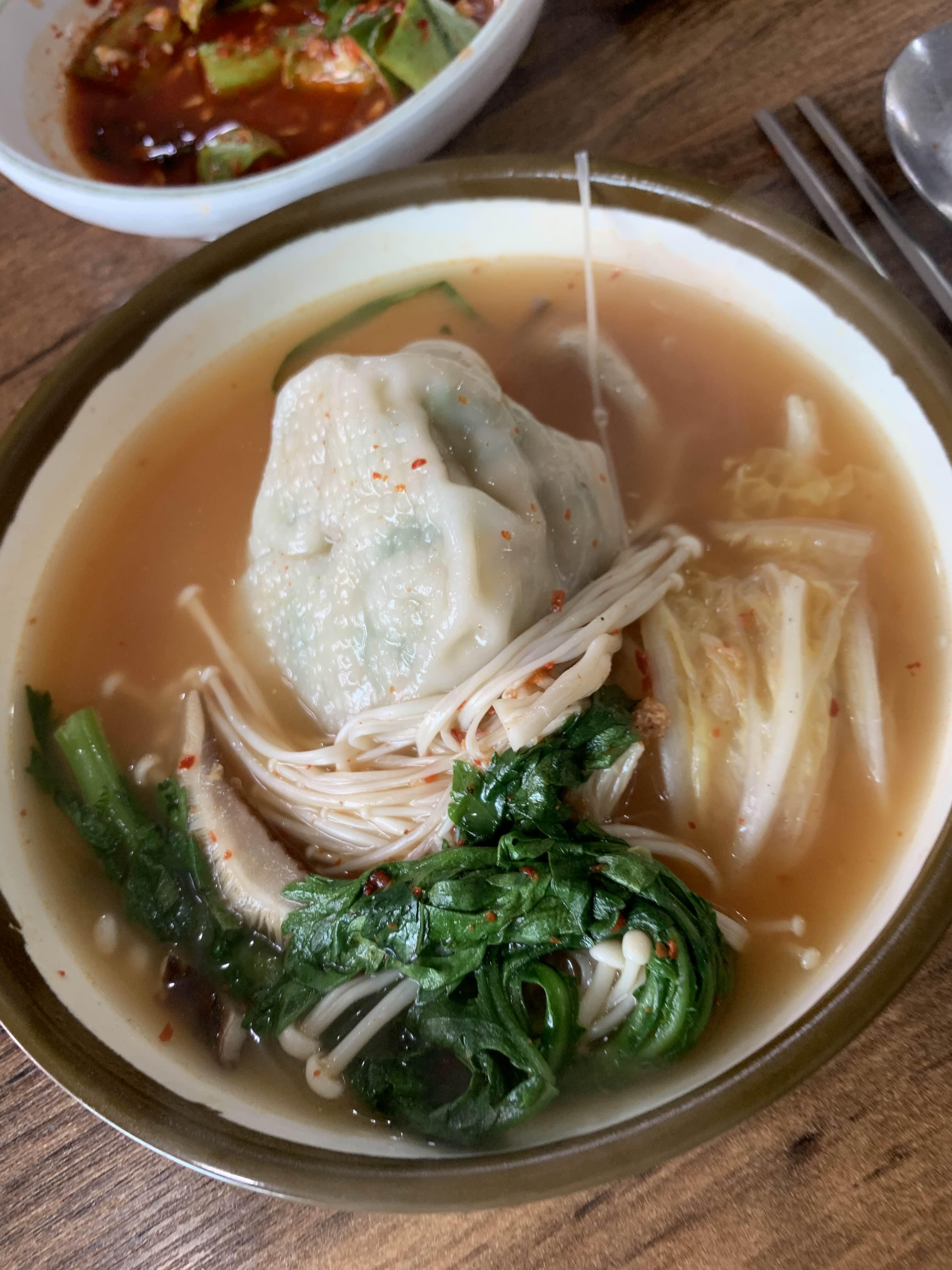 담백한 국물에... 만두 속을 풀어서 국물과 함께 맛보면... 묵진한 담백함이 느껴지도, 겉절이 김치를 올려서 먹으면....
