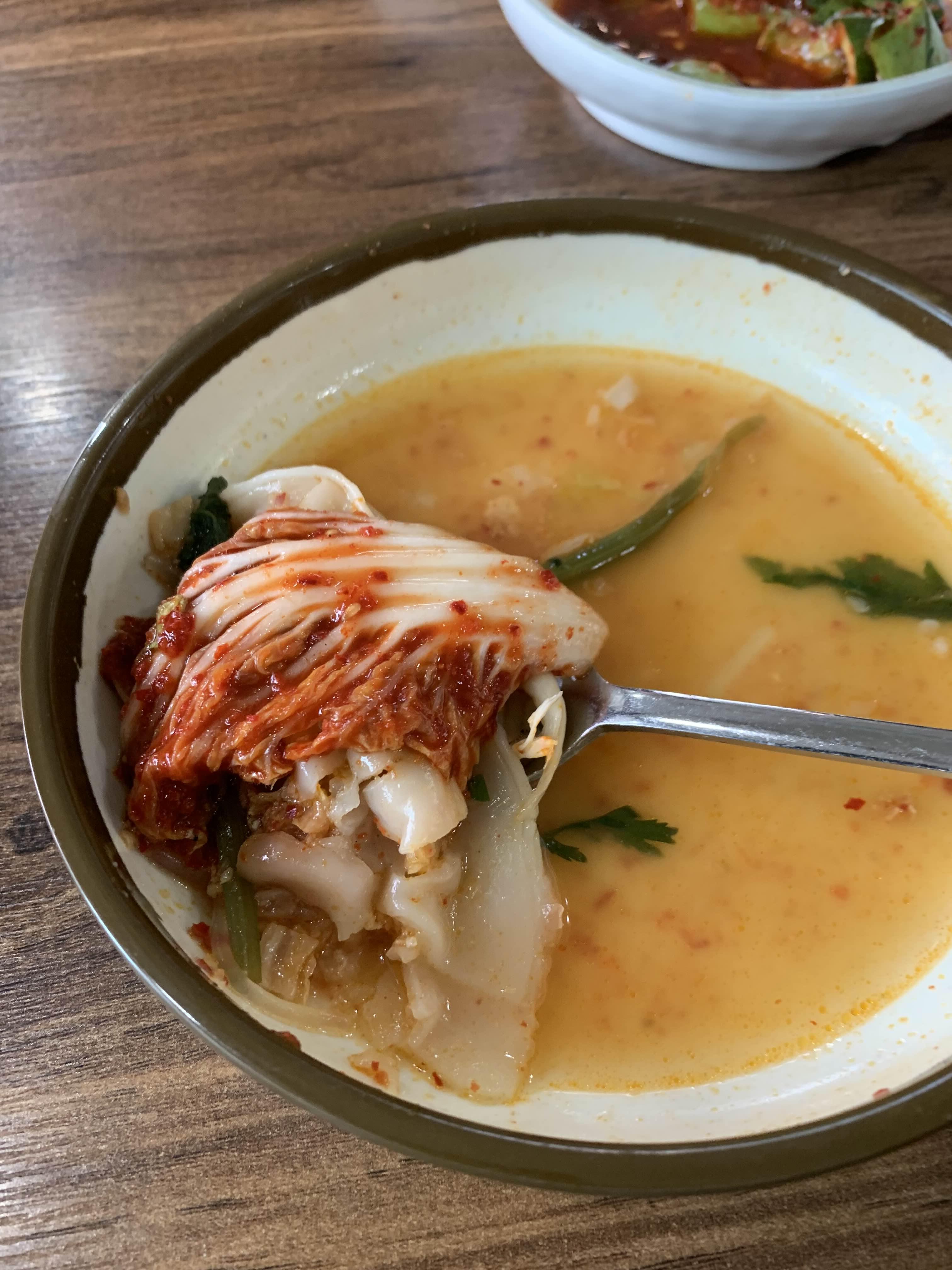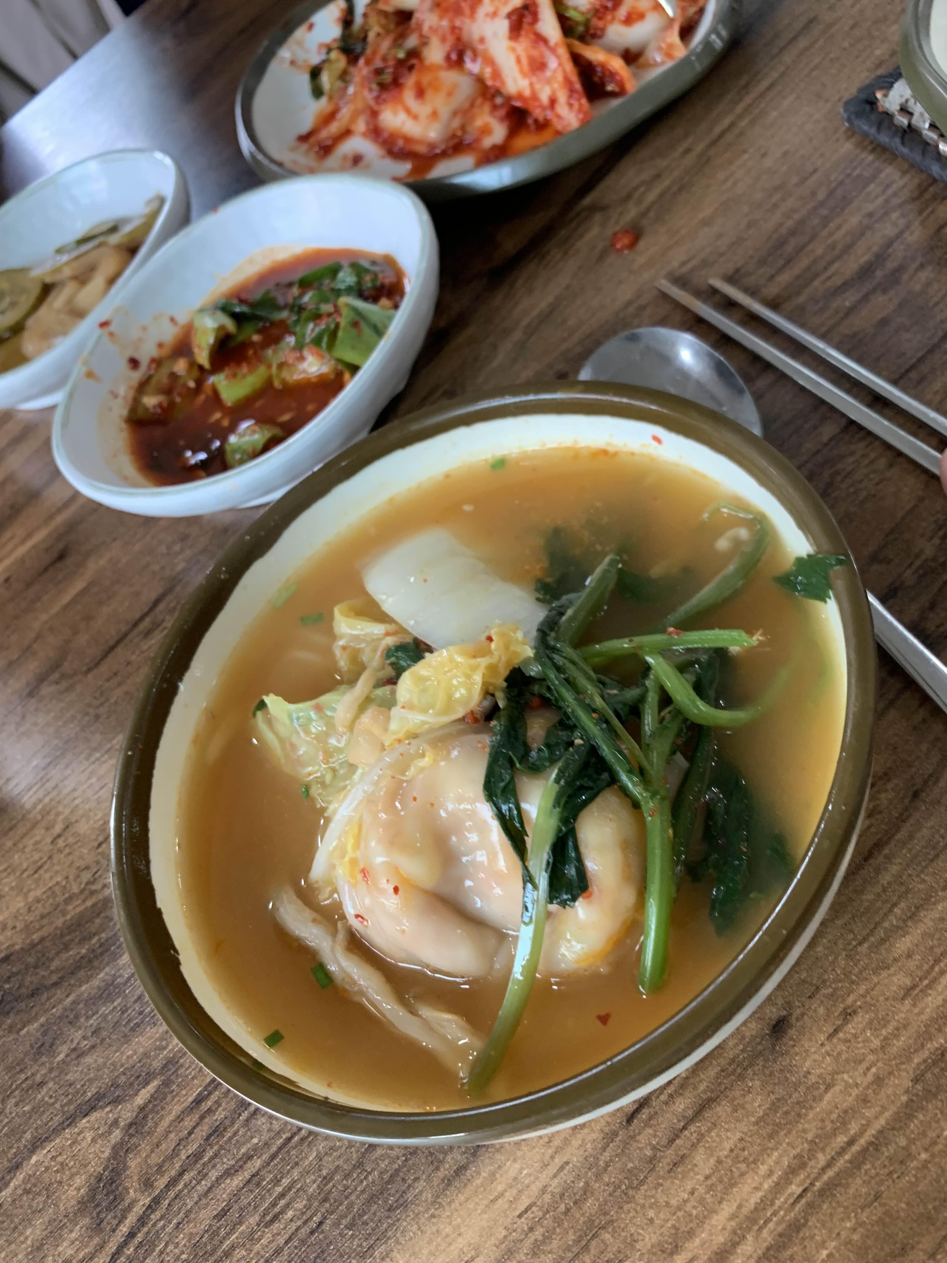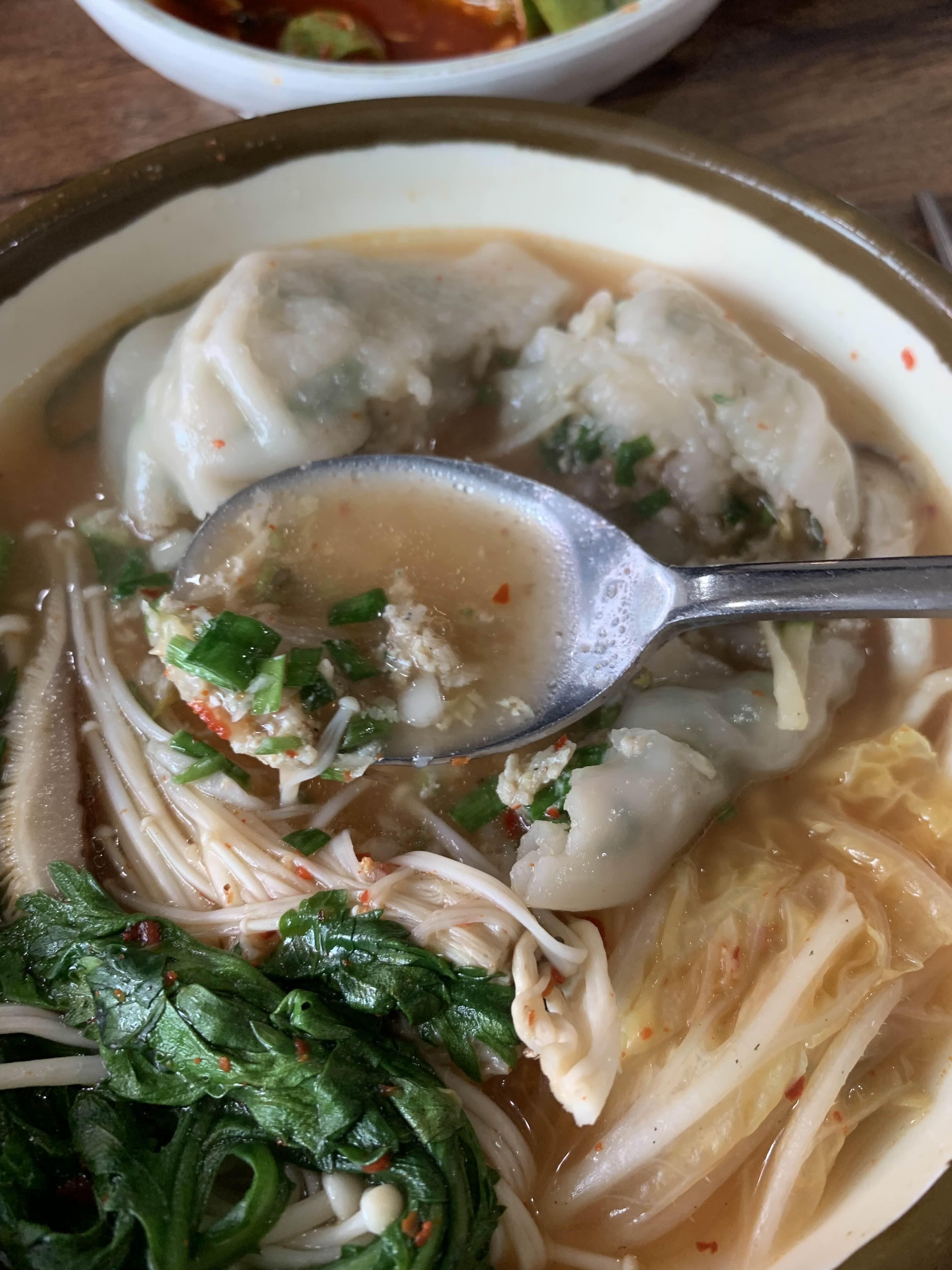 담백한 국물에... 만두 속을 풀어서 국물과 함께 맛보면... 묵진한 담백함이 느껴지도, 겉절이 김치를 올려서 먹으면....