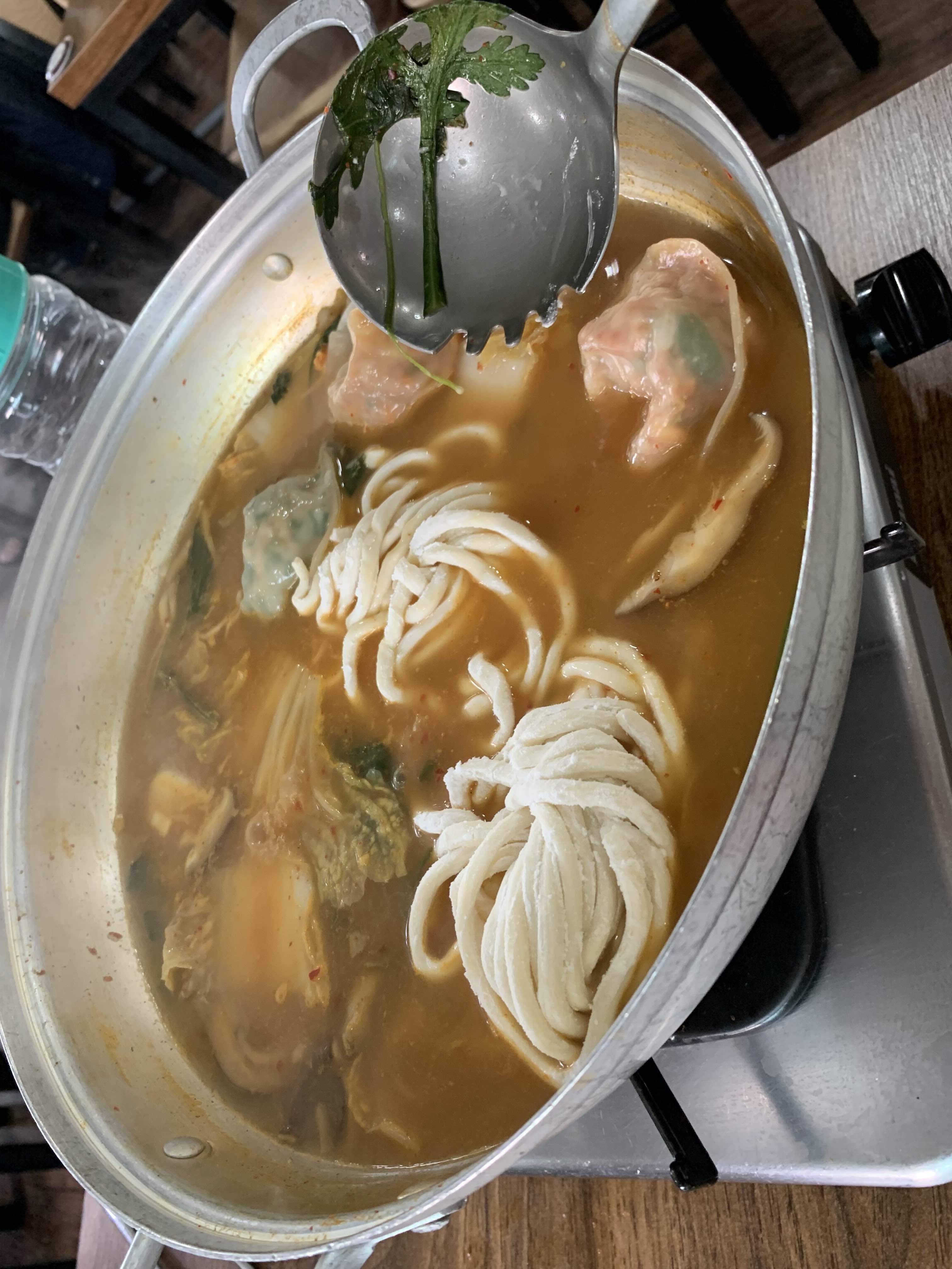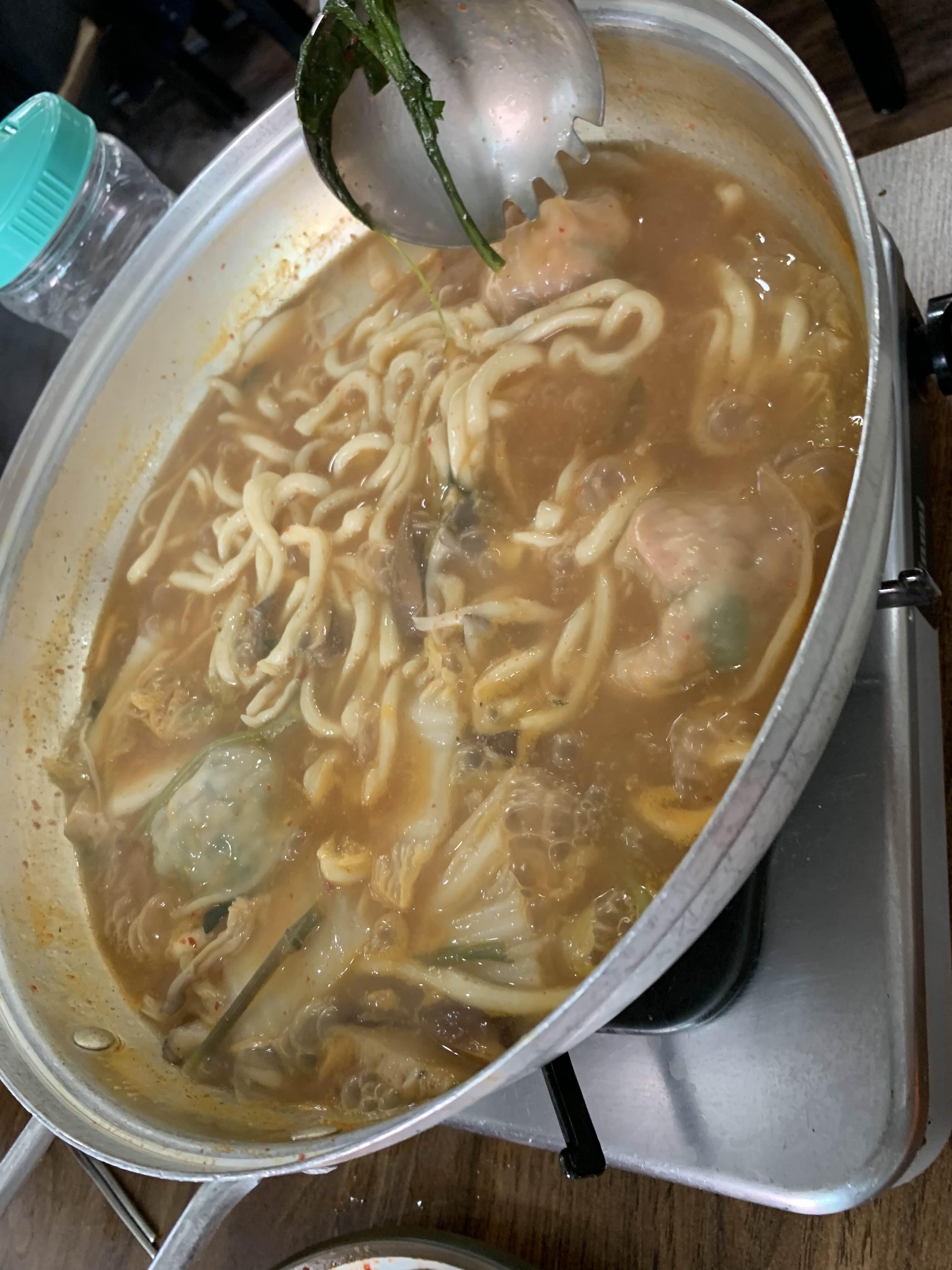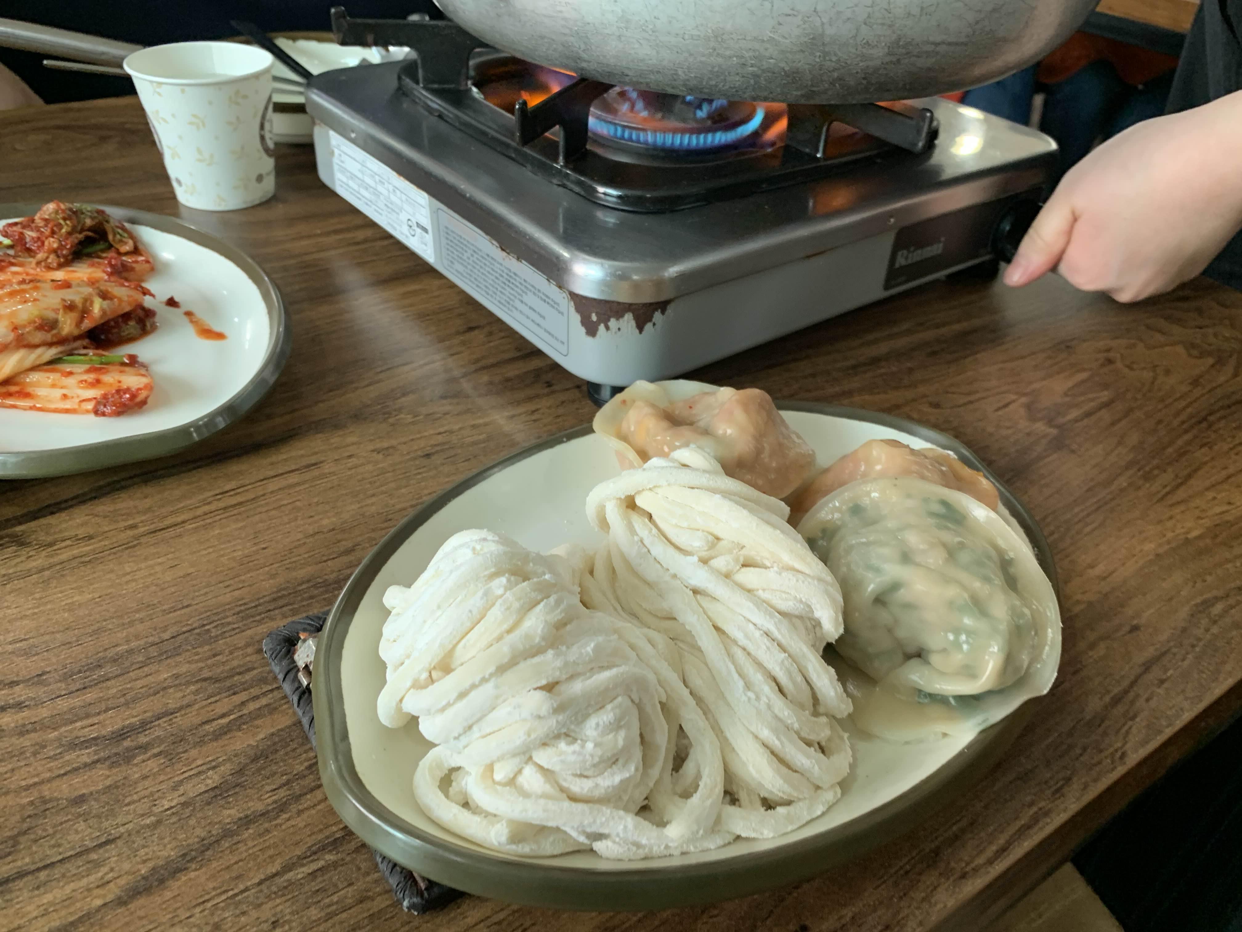 만두전골의 건더기를 어느 정도 맛보았다면... 다음으로 칼국수 투입!