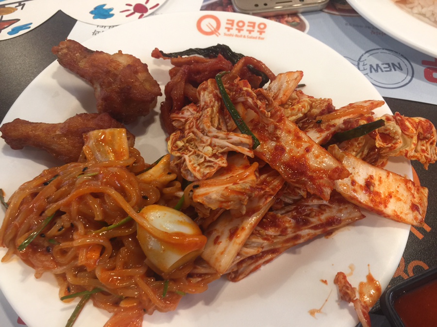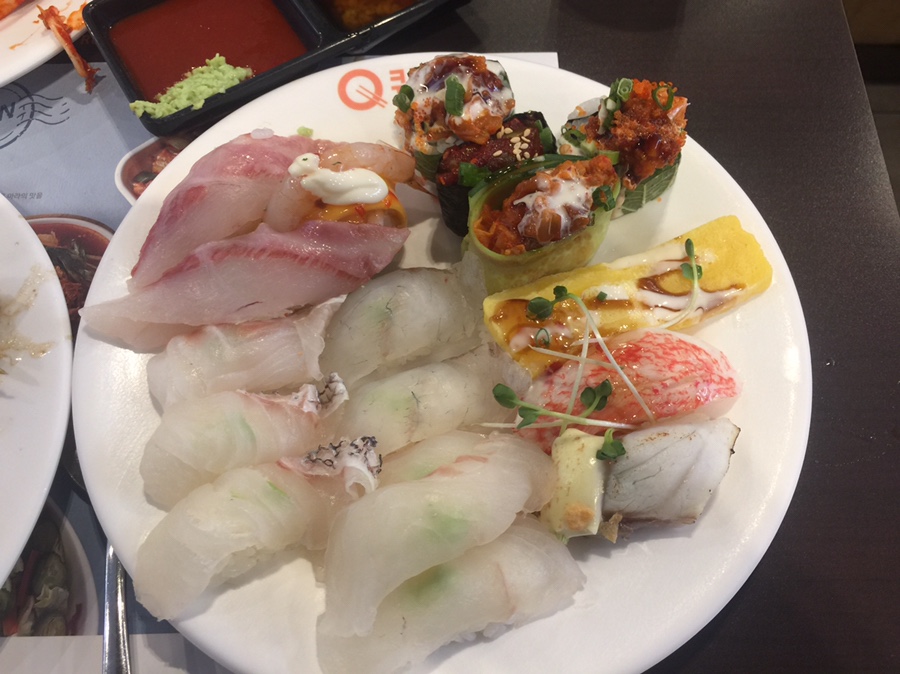 초밥과 샐러드바를 스캔해주고.... 그동안 먹고 싶었던 초밥과 샐러드바에서 LA갈비와 우동볶음? 담아왔네요. 초밥은 대체로 무난한 맛이네요. 아무래도 뷔페다 보니 초밥점문 점보다 좀 떨어지지만... 일반 결혼식장 뷔페와 비교했을 때 상당히 괜찮은 정도입니다. 초밥에는 좀 비릿한 냄새가 나는 거 같은데... 좀 속이 비렸네요. 그래서 초밥은 한 접시만 먹고 샐러드를 주로 공략했네요.