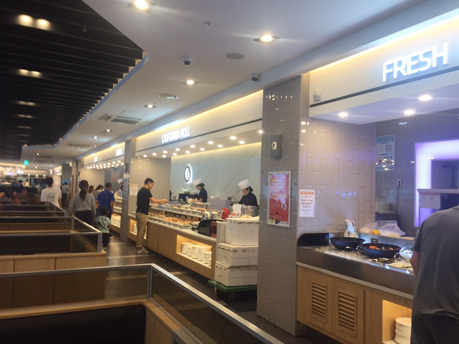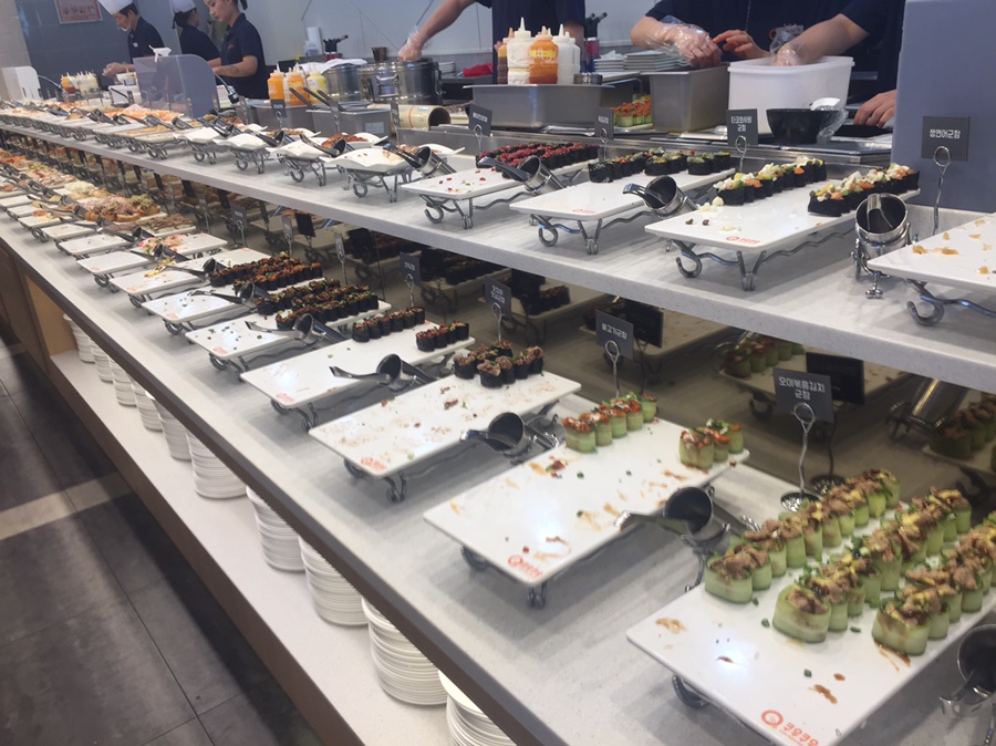 아이들이 쿠우쿠우를 좋아하는 이유는 바로 키즈카페에서 마음껏 놀 수 있어서 좋아하는 거 같네요. 키즈카페에 오락기 2대가 있는데.... 큰 아이는 요즘 오락기에 빠져서ㅡㅡ; 해어 나오질 못하네요. 아이들은 바로 키즈카페로 들어가고 본격적으로 식사를 시작하게 되었네요. 쿠우쿠우 전주 송천점 매장 내부가 상당이 넓습니다. 우선 초밥부터 먹어야지 했으나.... 예전에 방문했을 때 없었던 음식을 먹어보기 위해 샐러드바에 들렀습니다.