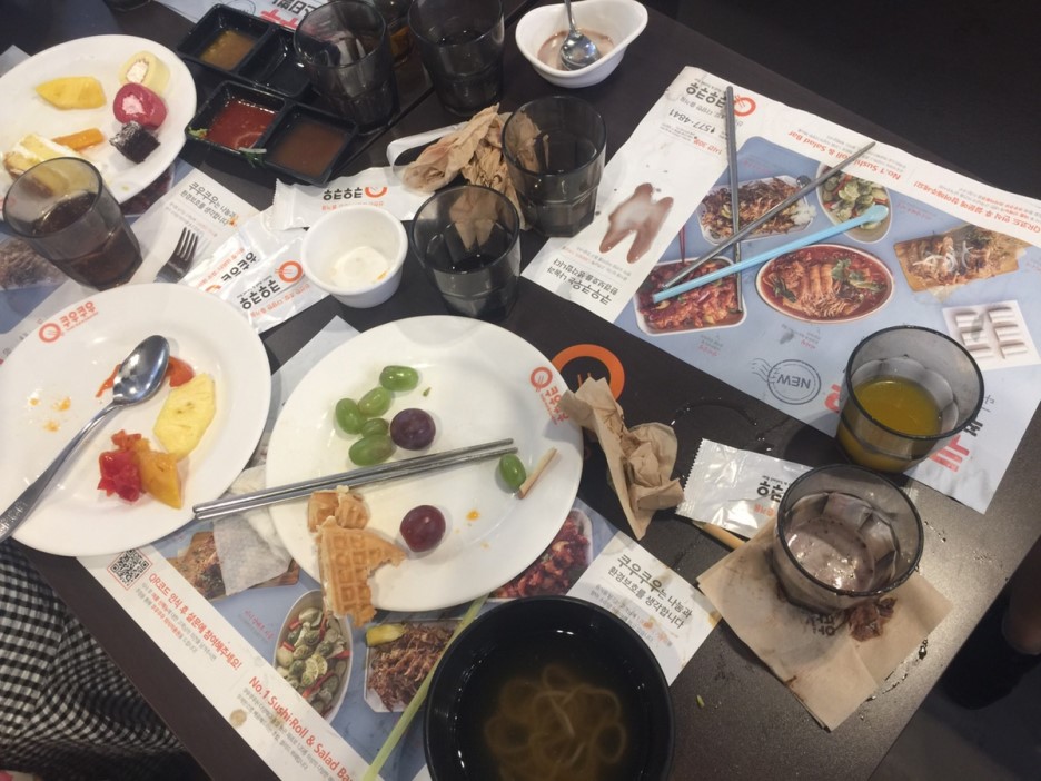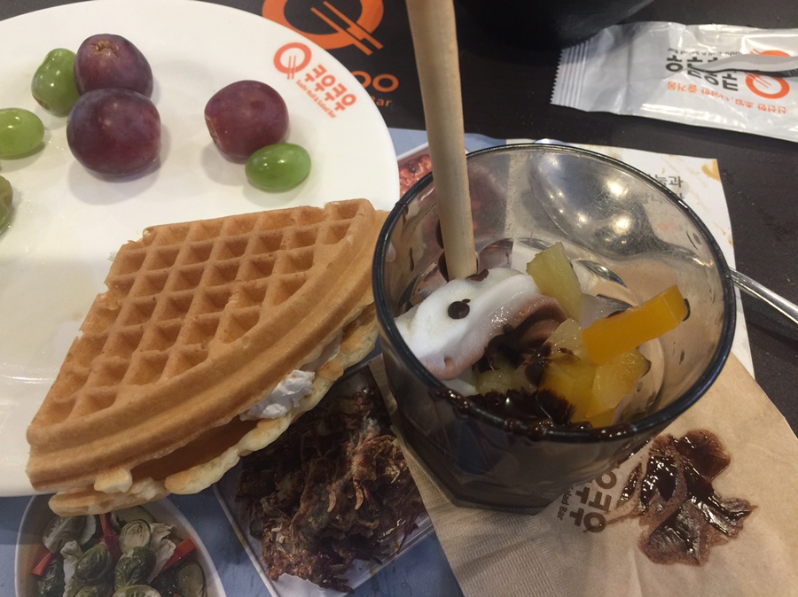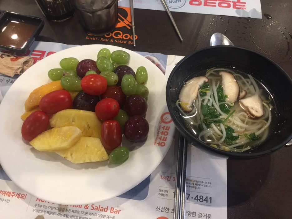 좀 얼큰한 국물이 생각나서 짬뽕과 젤리를 가져왔네요. 여기 젤리가 색상별로 다양하게 있어서 먹는 재미가 있었네요. 짬뽕은 느끼한 거 먹고 개운하게 먹기 좋았네요. 그리고 과일과 쌀국수.... 최근 핫한 메뉴 베트남 쌀국수..... 맛은 별로였네요. 베트남 쌀국수 전문점에서 4,000원 쌀국수가 생각나네요. 아이들은 겨자 없는 초밥과 아이스크림, 피자 위주로 공략하네요.ㅎㅎ