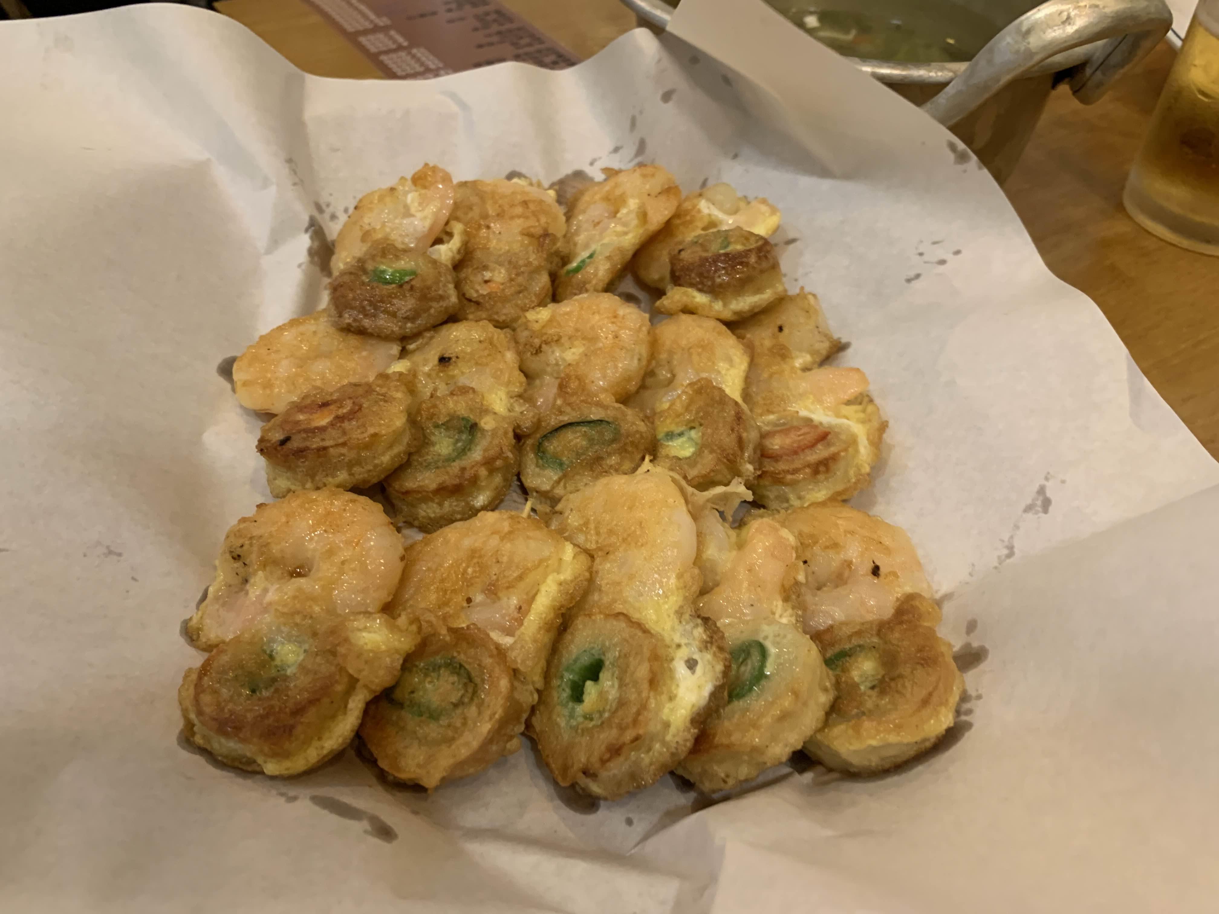 건새우와 청양고추로 둥그렇게 만든 전이라 생각했었는데.... 탱글한 새우와 어묵에 고추룰 꼽은 전이 나왔다.