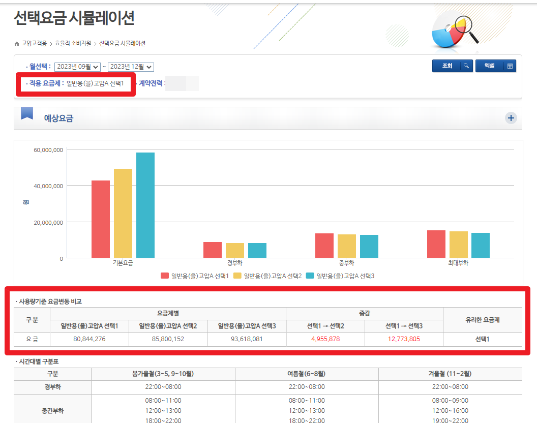 선택요금제는 해당 시뮬레이션을 통해서 무작정 바꾸는 방법도 좋을 수 있지만... 지속적인 관찰이 필요하다. 그 이유는 사업장의 전기사용량이 월별로 다를 수 있기 때문이다. 겨울절에 많이 사용하는 사업장인데, 여름철에는 적게 사용하기도 하니... 월별로 조회하였을 경우 유리한 요금제가 변경될 수도 있다. 매달 선택요금제 변경이 가능하다면... 매달 변경하여 사업장의 최적의 요금제를 변경하며 요금을 납부하면 좋겠지만! 한전에서는 선택요금제 변경 1년에 1회만 변경이 가능하기 때문이다.