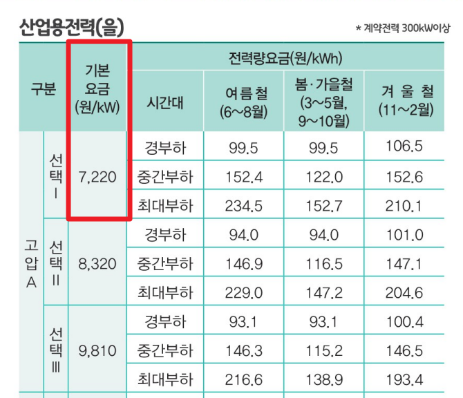 기본요금은 계약전력에 대하여 부과하는 방식이다. 계약전력이 그리 크지 않은 사업장의 경우(대략 1,000kW 기준), 기본요금이 크지 않지만... 계약전력이 1,000kW 초과하는 사업장은 계약전력이 전기요금의 많은 비중을 차지한다.