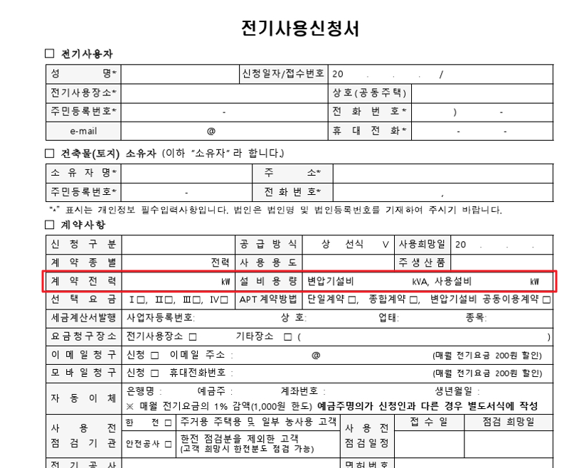 한전 전기사용신청서를 보시면, 계약전력의 산정 방법은 2가지(변압기설비 또는 사용설비)를 선택하여 계약전력을 맺을 수 있다. 신축 건축물의 경우 사용설비(부하계산서에 따른 용량)의 합산한 용량이 변압기설비 용량과 동일하다.