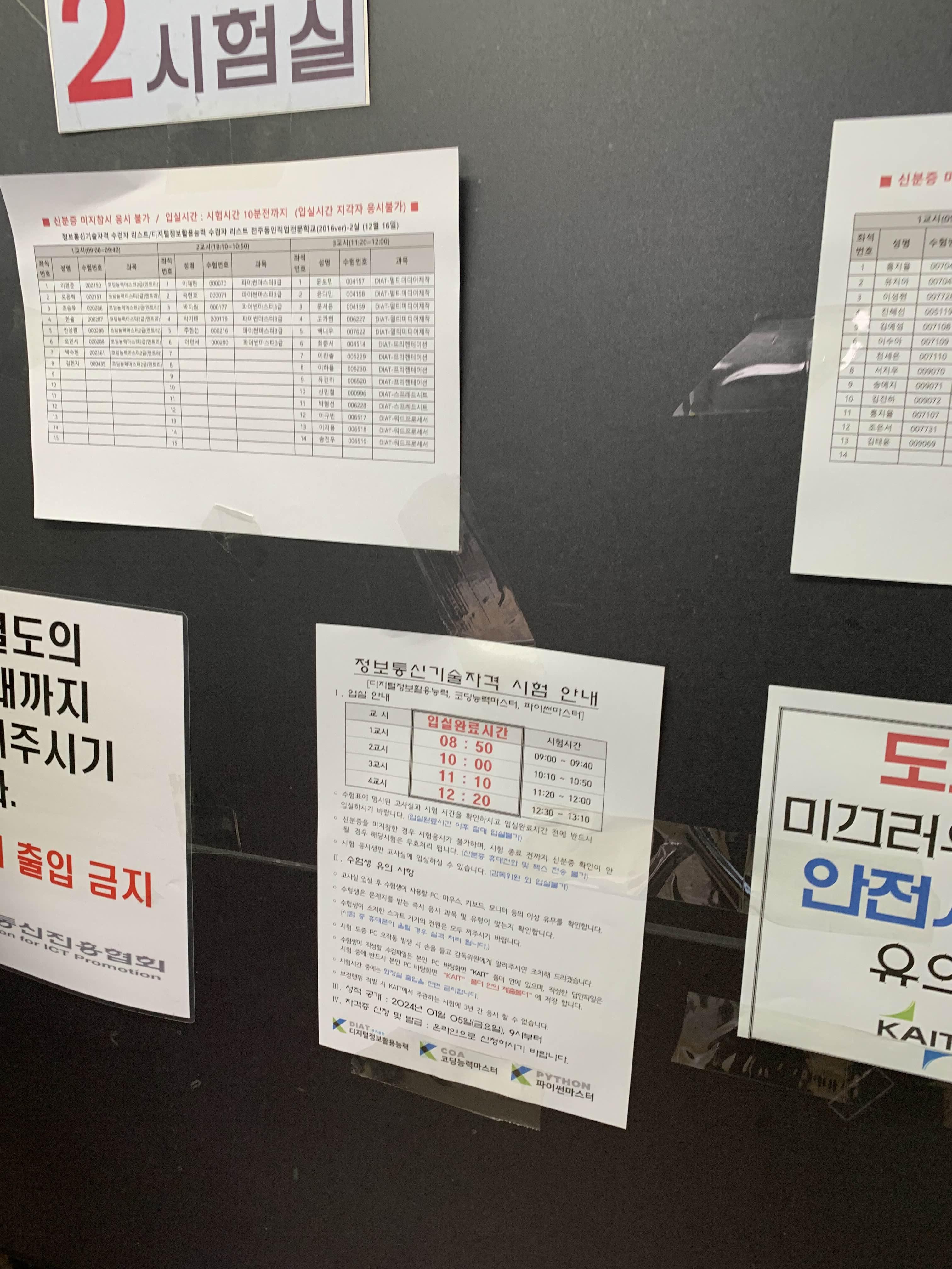 고사장 1층에서 안내해 주고... 부모님은 시험이 끝나는 시간에 오시라고 한다.