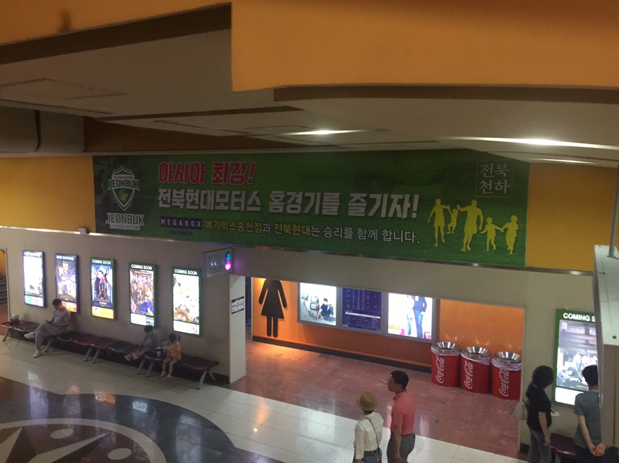 상영시간이 거의 되어서 6관으로 출발하였습니다. 송천 메가박스는 상영관으로 가기 위해서는 에스컬레이터를 타고 한층 올라가서 각각의 상영관으로 구분되어 있습니다. 에스컬레이터 올라가며... 전북 현대 플랜카드가 눈에 들어왔습니다. 송천 메가박스는 전북 현대 후원의 집으로 등록되어 있었네요. 통로에는 앞으로 상영될 영화 포스터가 전시되어 있었습니다.