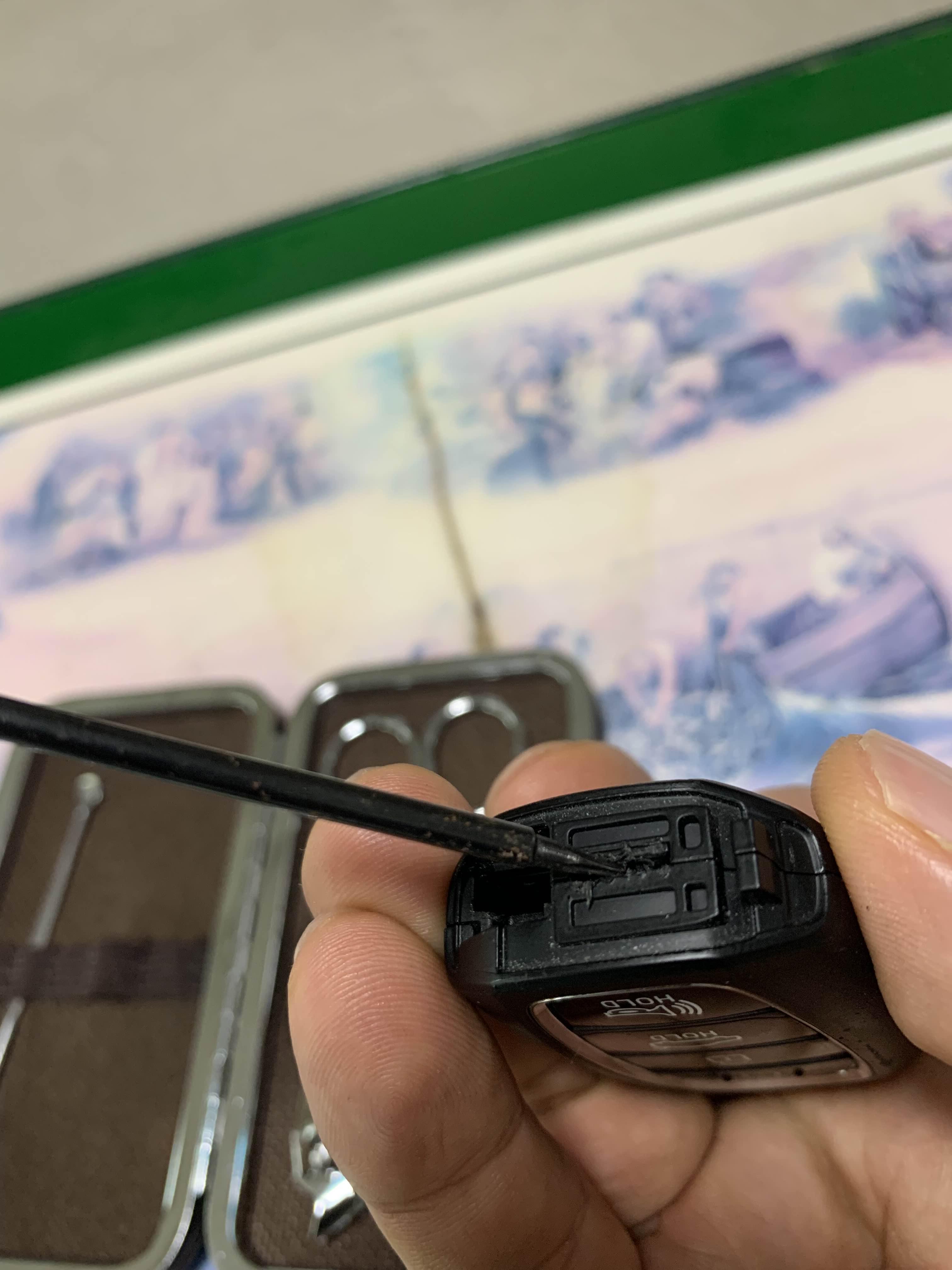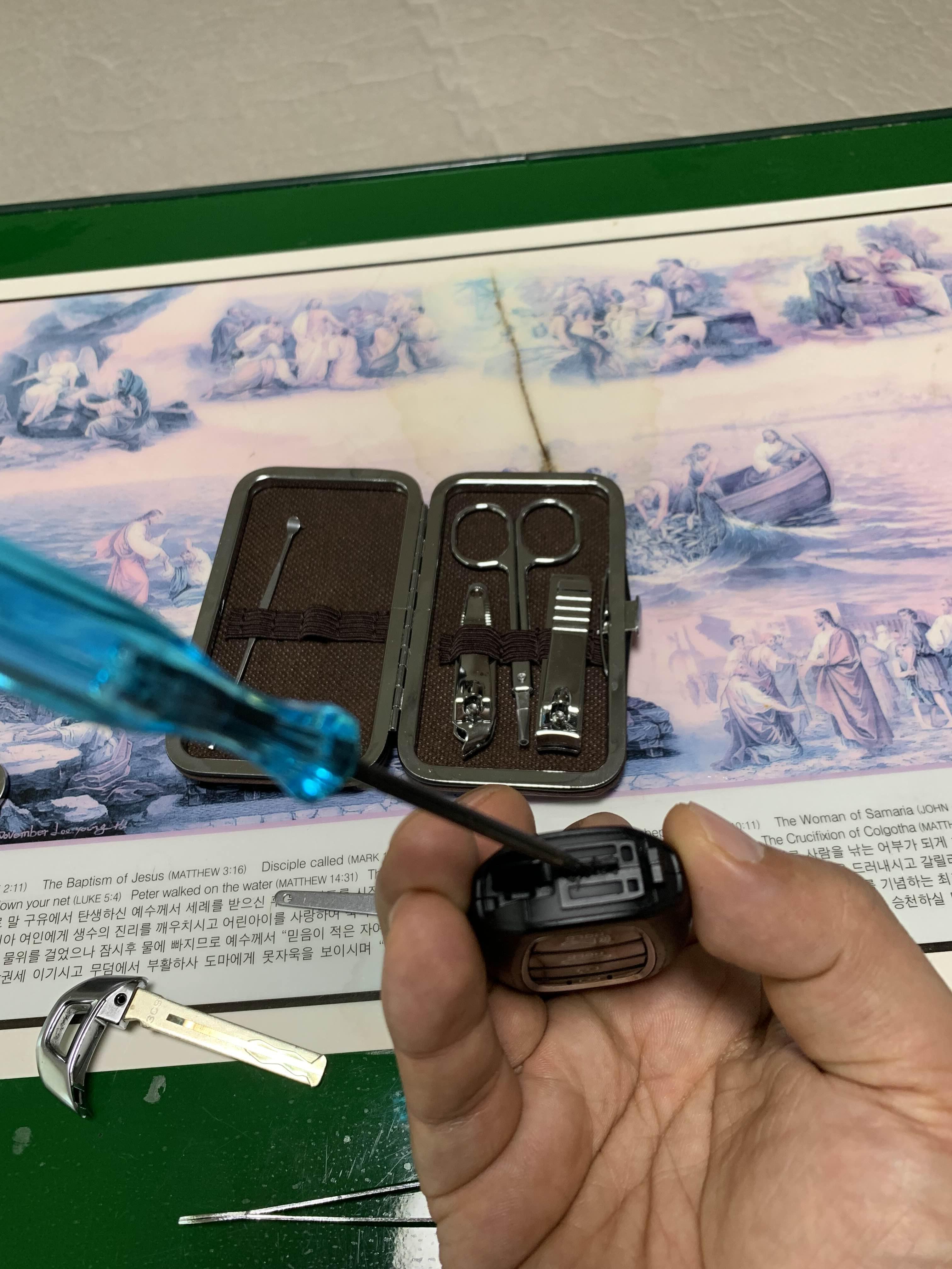 스마트키에 꼽혀있는 수동열쇠를 제거하고, 중앙 부분에 뾰족한 걸 이용하여 사이를 벌려 줍니다.