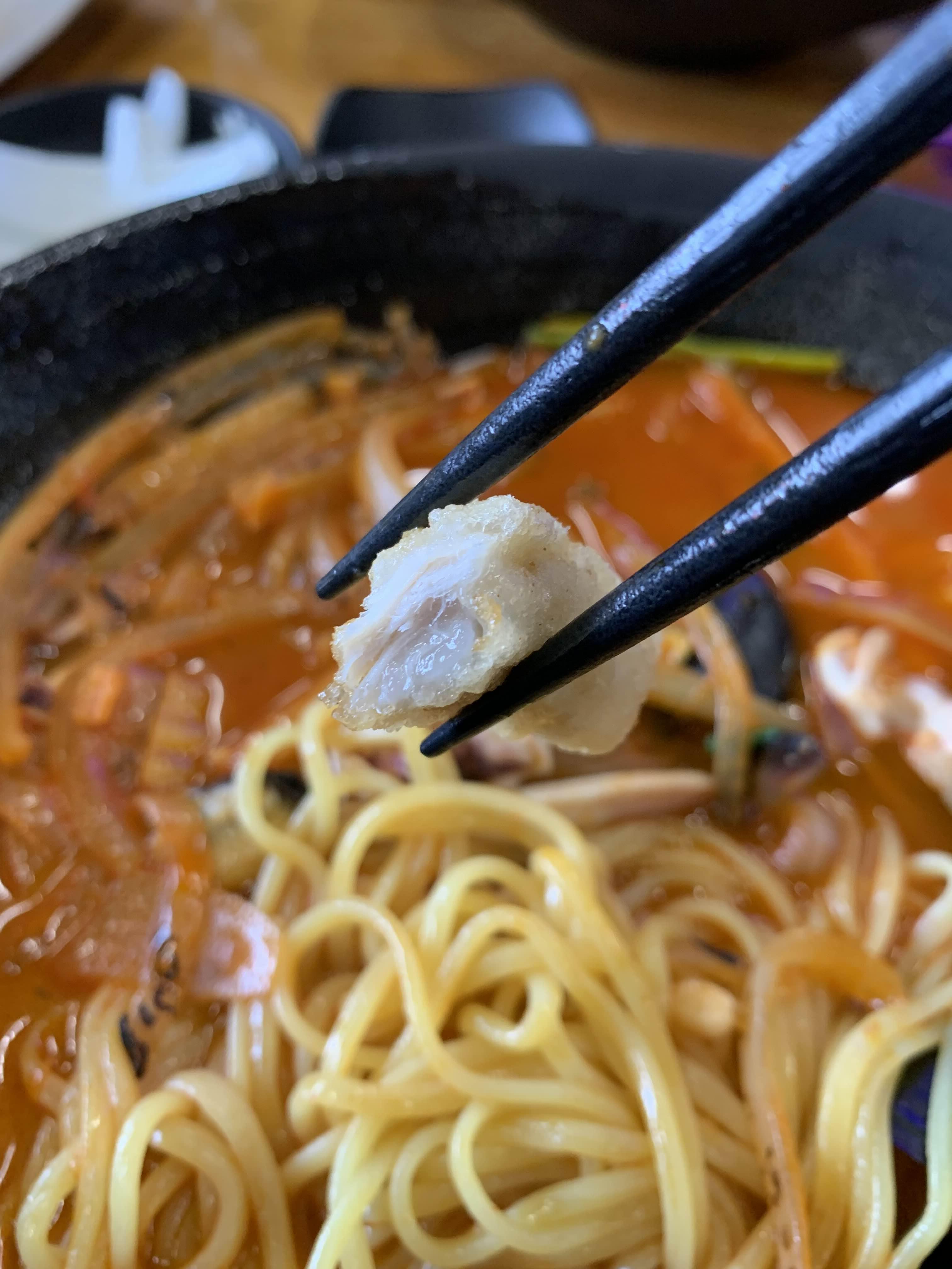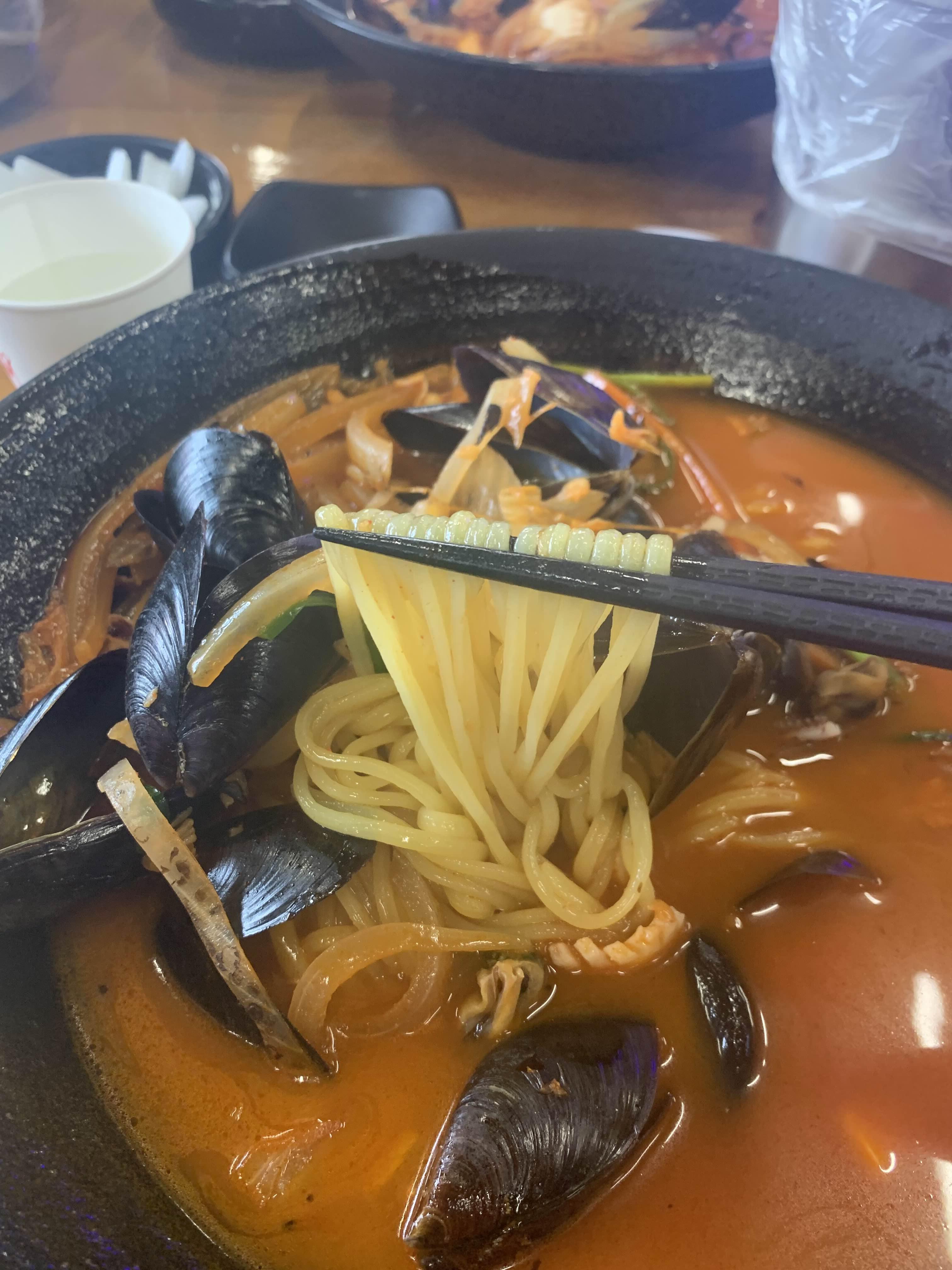 짬뽕 면발이 좀 가느다란 한 면발이고... 홍합과 양파는 오랫동안 볶거나 끊인 느낌이고...