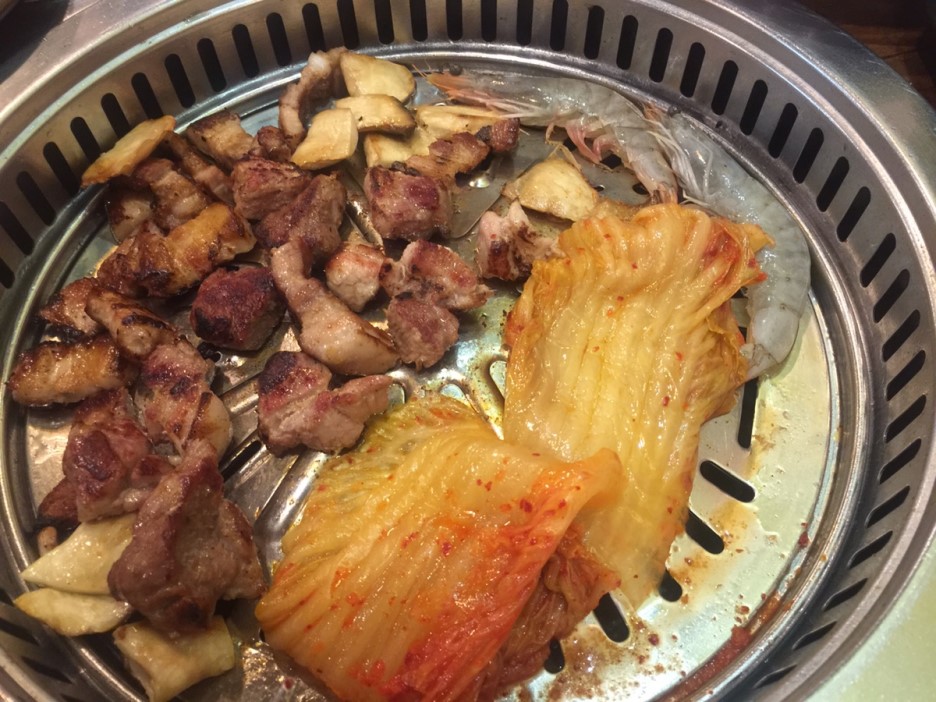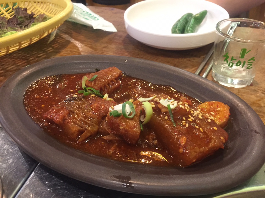 고기가 한쪽은 바삭하게 익고, 다른 한쪽은 아예 생고기로 구워졌네요. 고기 2인분 구웠는데.. 불판 한쪽은 시커멓게 되어버렸네요. 그래서 불판 교체를 요청하여.... 고기가 어느 정도 익을 즘 묶은지를 올려서 살짝 익혀줍니다. ㅎㅎ 고기가 어느 정도 익을 즘... 코다리찜을 서비스로 조금 주셨네요. 코다리 양념이 꽤? 괜찮았습니다. 매콤하면서 달짝지근한 맛? 암튼 코다리를 별로 좋아하지 않아서 패스!! 목살과 삼겹살 맛은 보통~