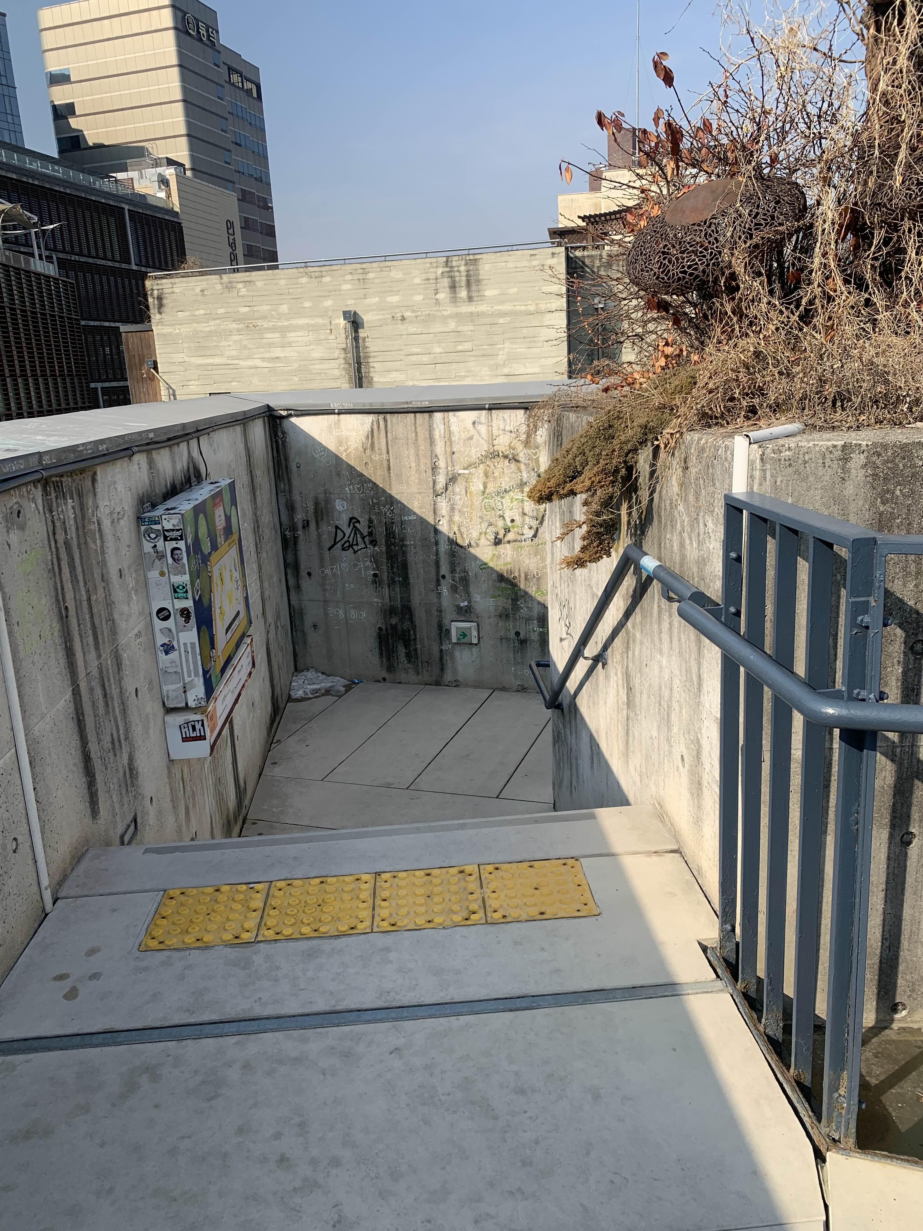 쌈지길의 마지막은 계단으로 연결!! 마지막을 계단이 아닌, 경사로로 구성하면 어떨지?라는 생각이 들었다. 무한의 경사로의 쇼핑몰~! 마지막이 경사로가 아닌, 계단실이라..... 쌈지길은 막다를 길이라는 느낌이랄까?