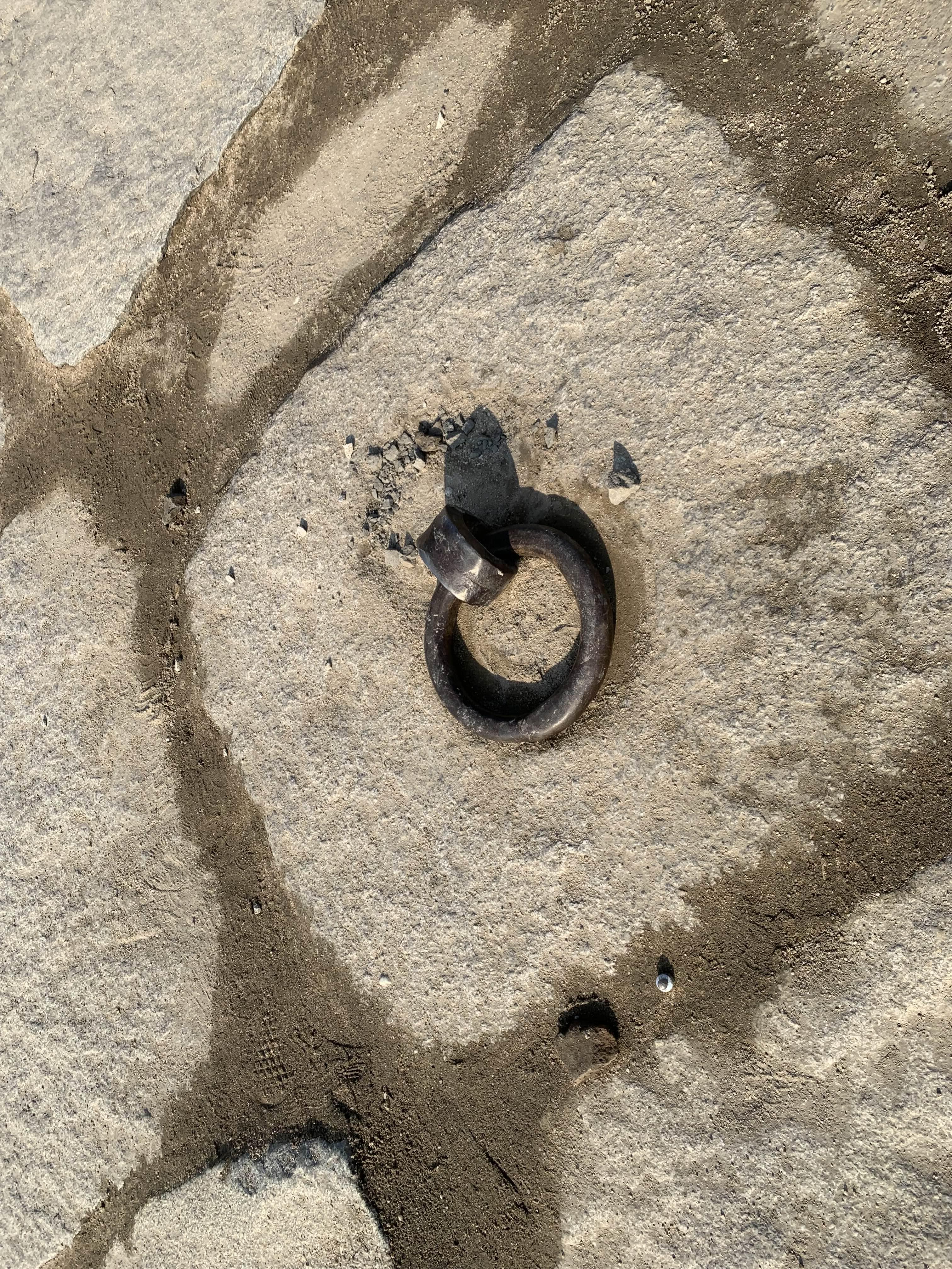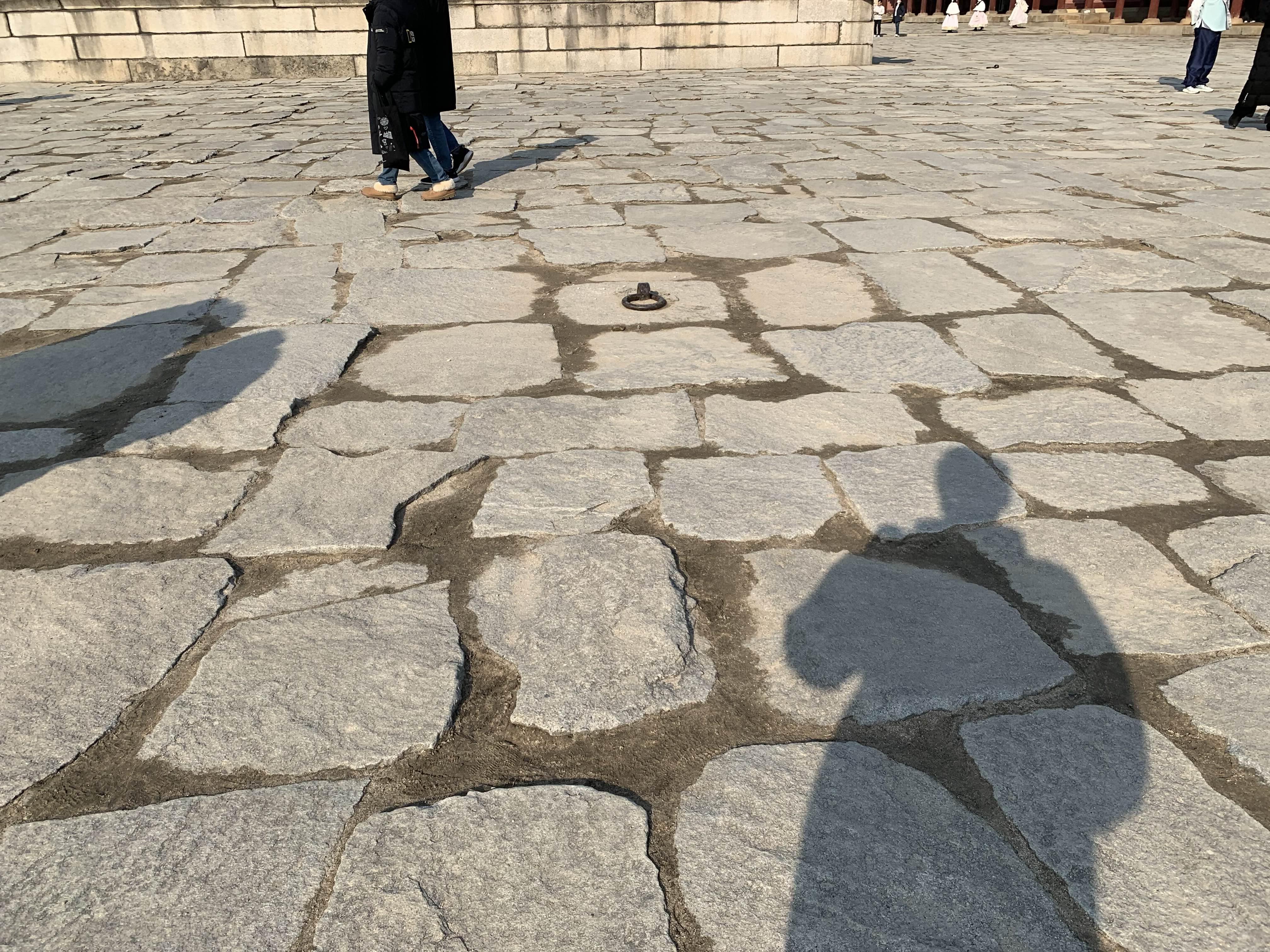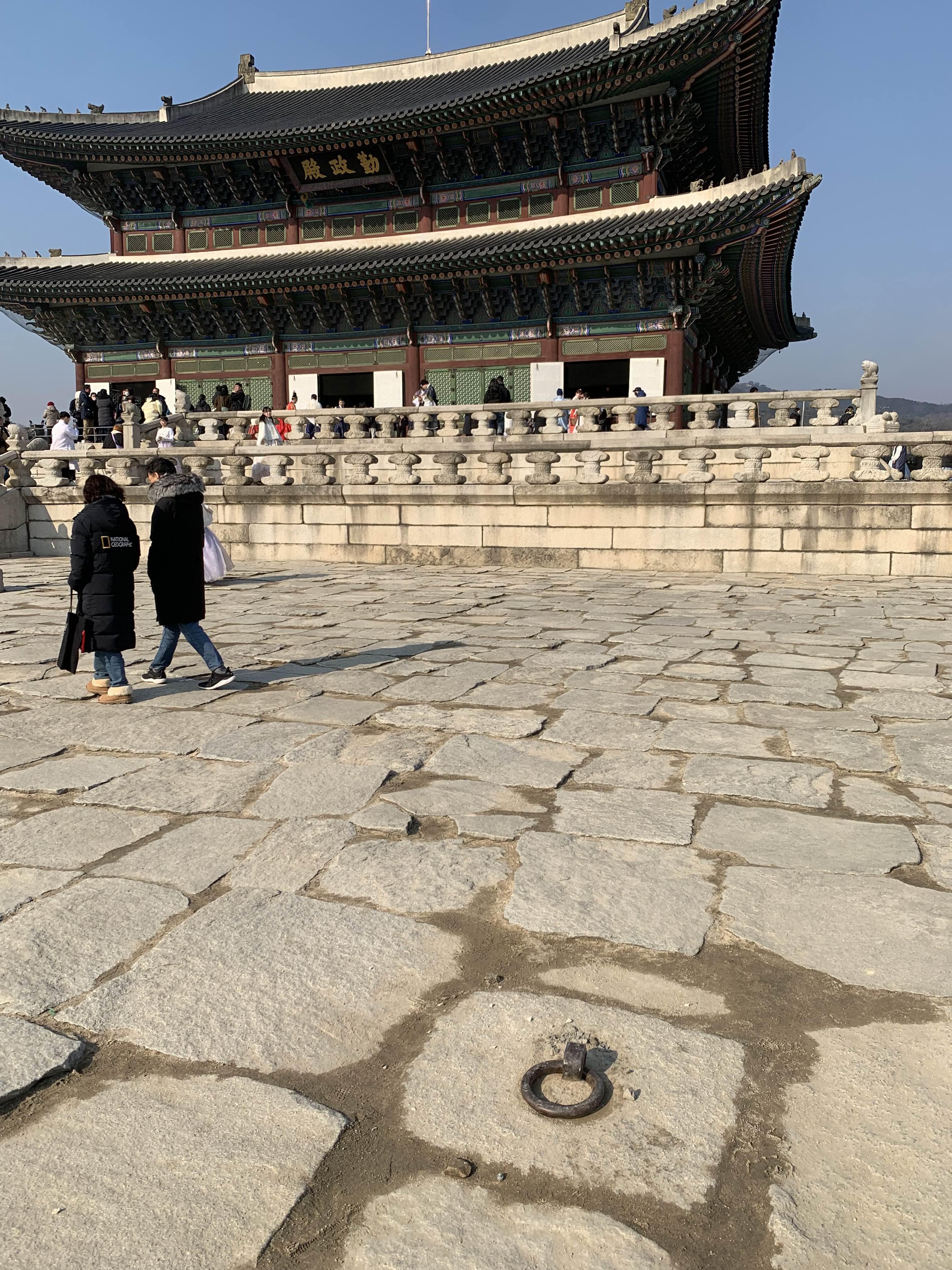 근정전 바닥에 설치된 동그란 고리는? 차일고리인데.... 차양시설을 설치하기 위한 시설이다.