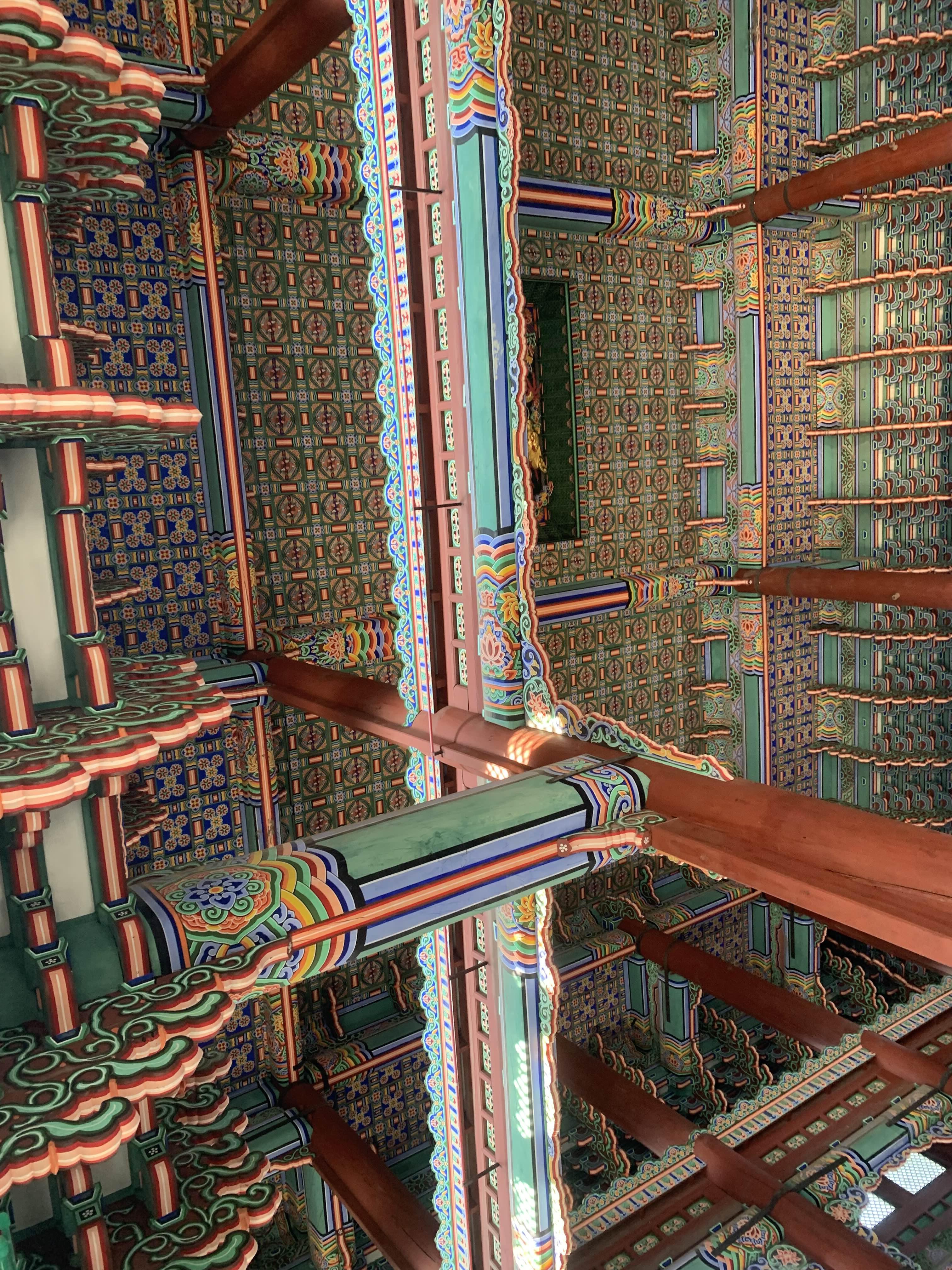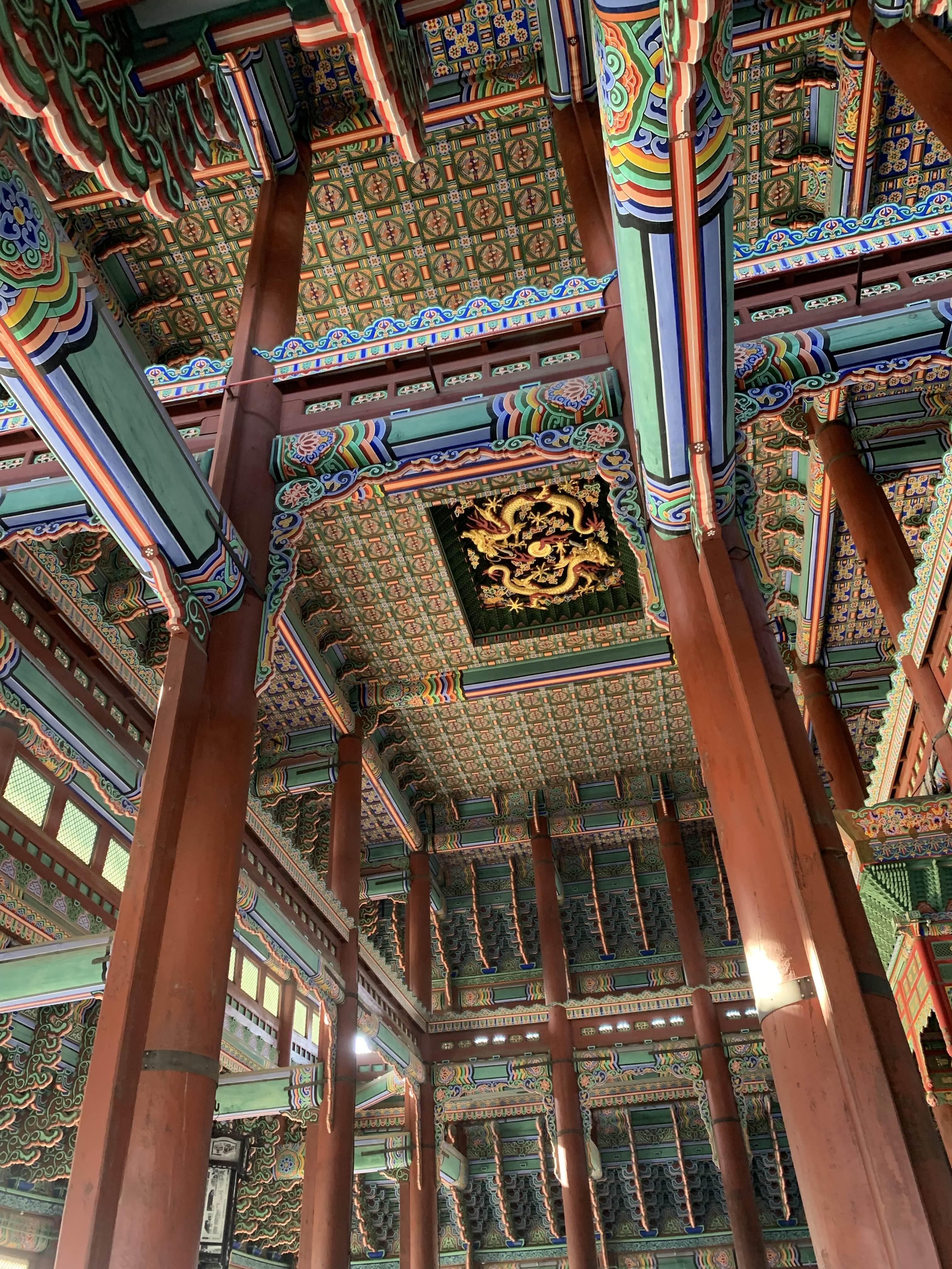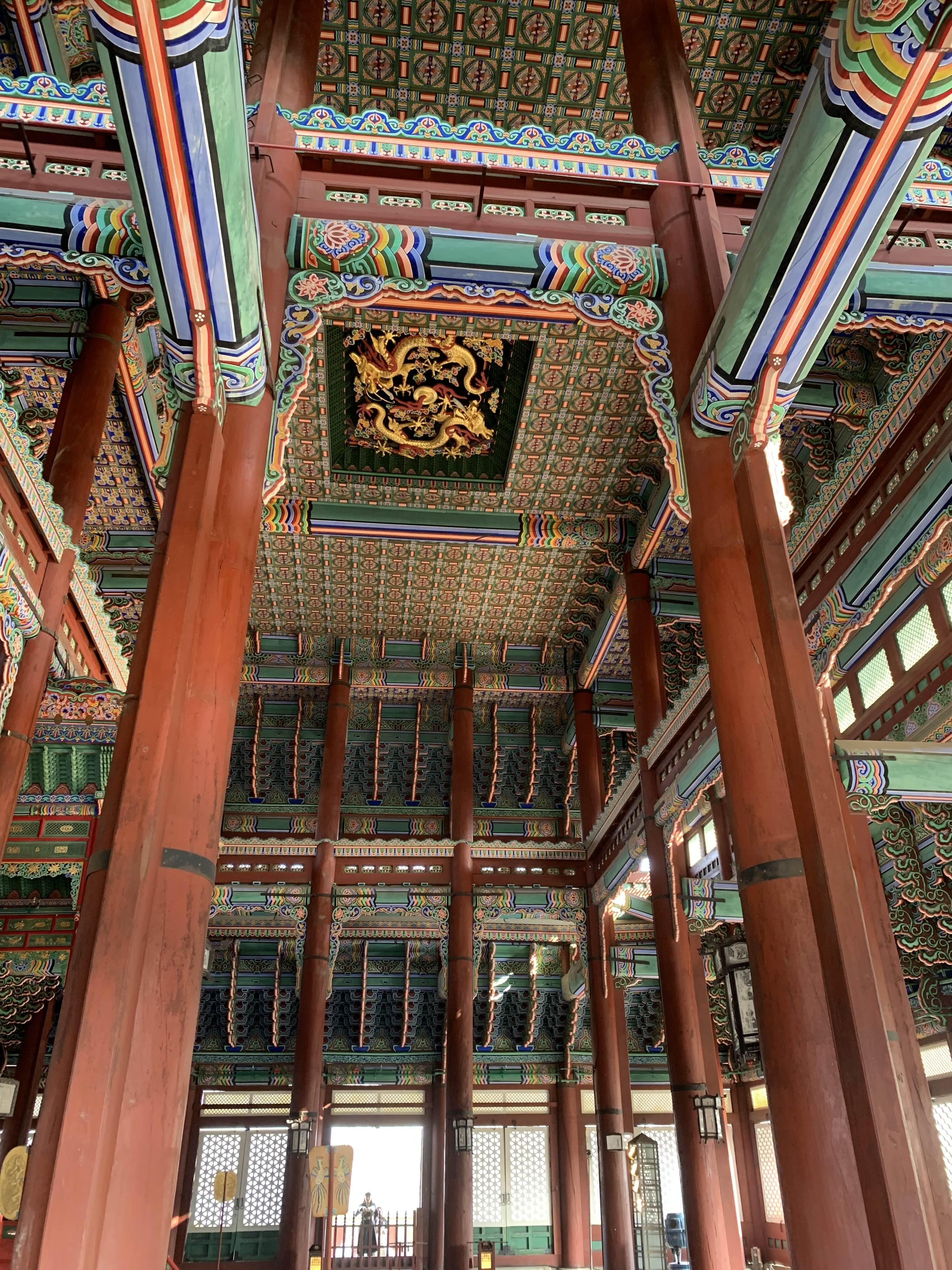 근정전 중앙의 우물천장의 중앙 부분이 상당시 기둥과 기둥사이(SPAN) 간격이 상당히 넓어 보인다. 대략 7M 정도 보이는데... 이러한 간격을 목조로 된 보(대들보)를 이용하여 지지하고 있다니... 목재가 상당히 튼튼하게 가공했구나 라는 생각이 들었다.