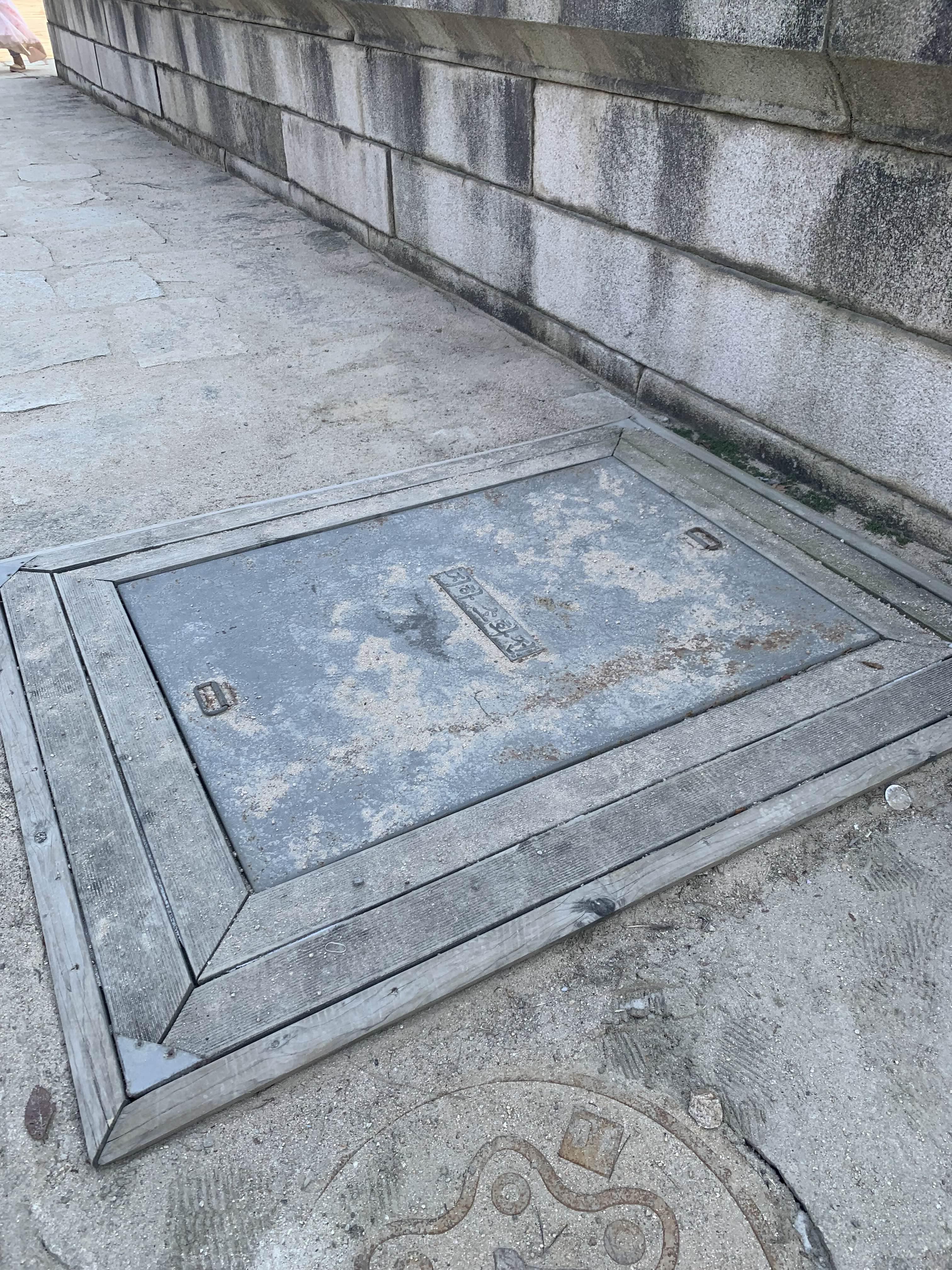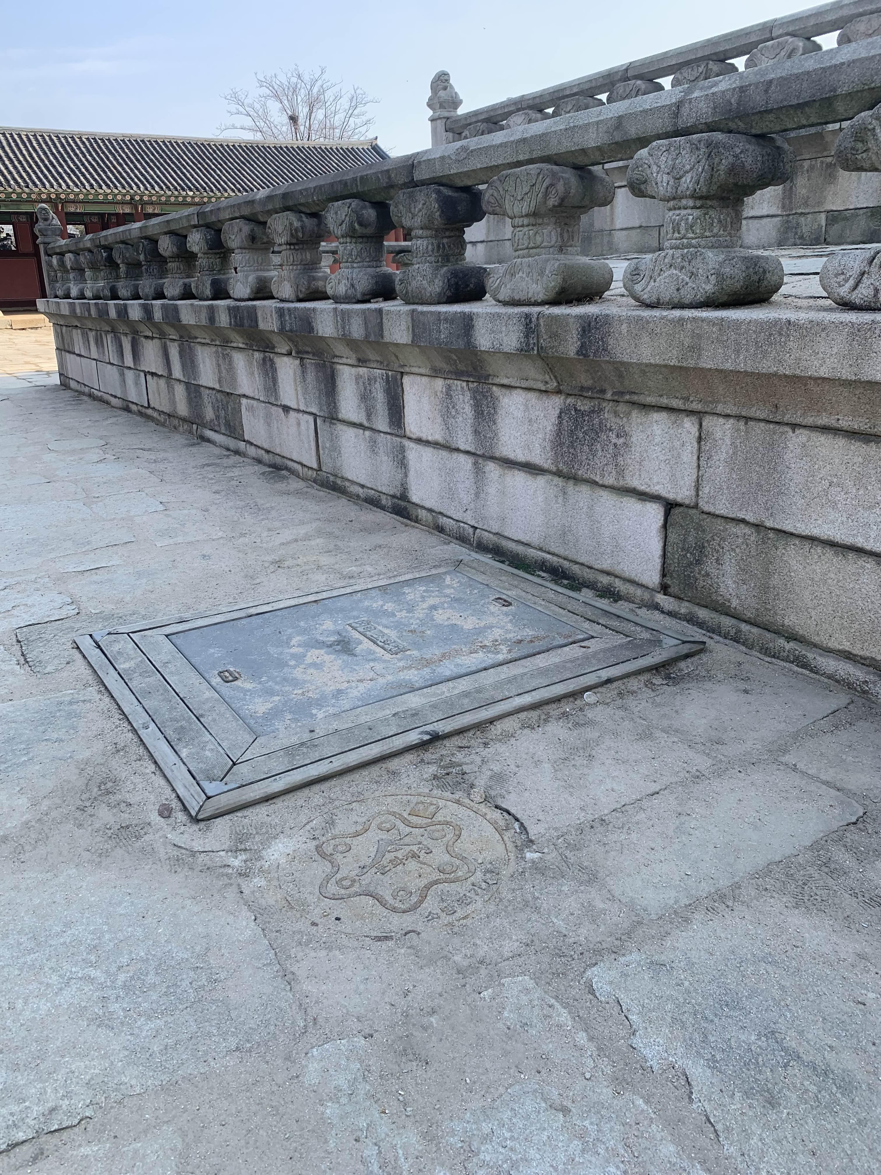 근정전은... 화재를 대비하기 위해 소화설비(근정전 내부의 스프링클러)가 지하여 설치되어 있다. 근정전의 후면이 지하시설물이 보이는데, 지하도면이 있으면... 어떤 식으로 연결되었는지 찾아보는데... 도면이 없다.ㅎㅎ