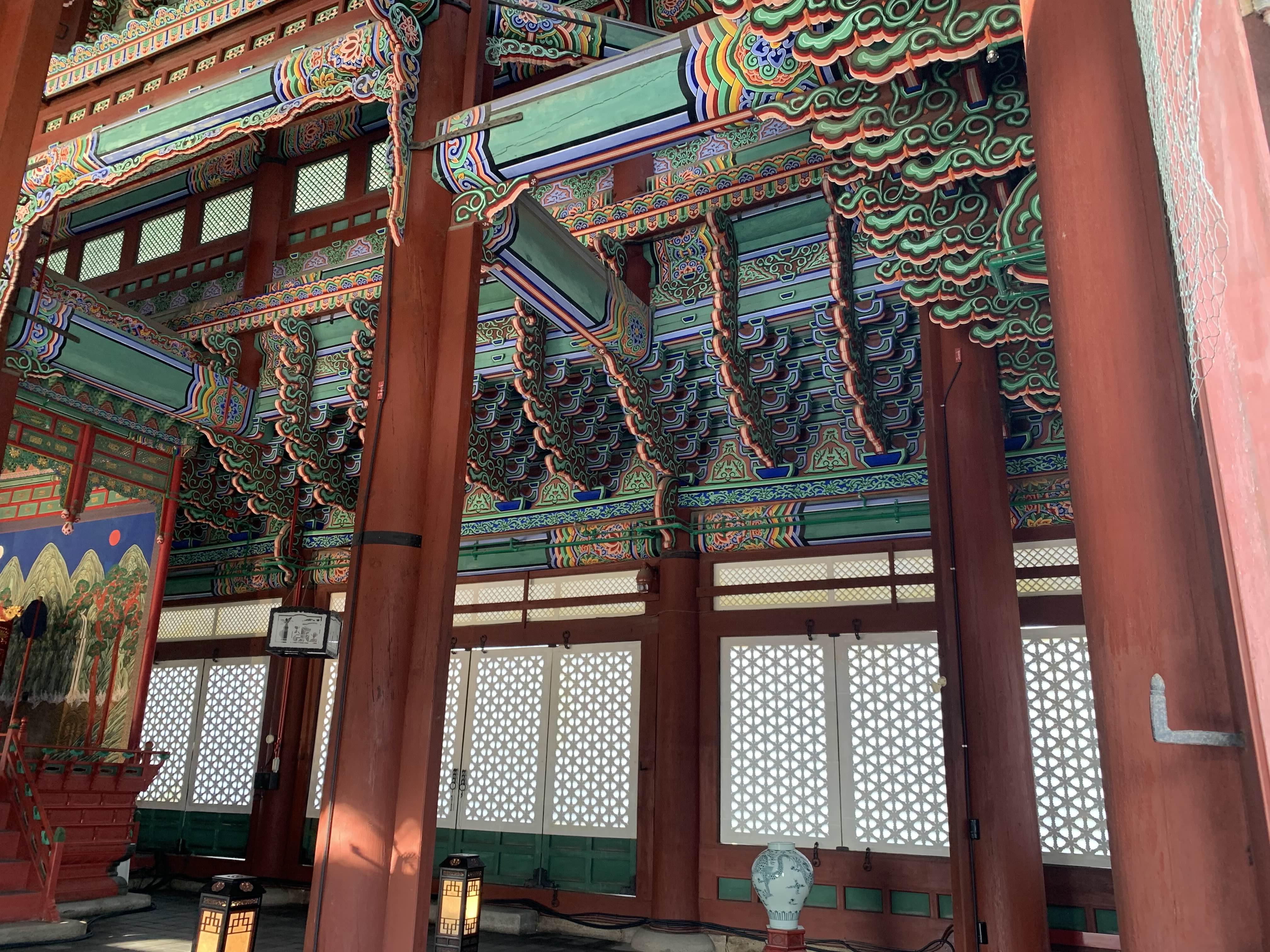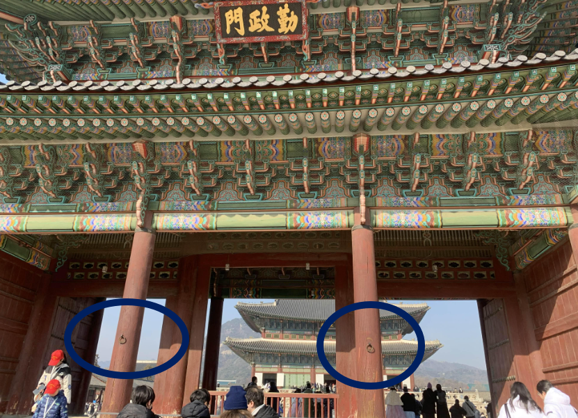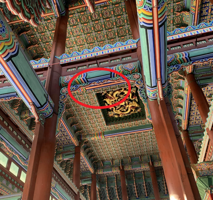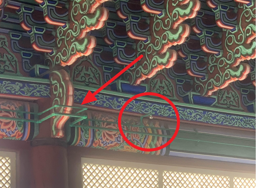 소화배관의 색상이 근정전내부 색상에 맞추어 도색되어... 배관이 눈에 잘 들어오지는 않지만! 유심히 찾아보면 그리 어렵지 않게 보인다.