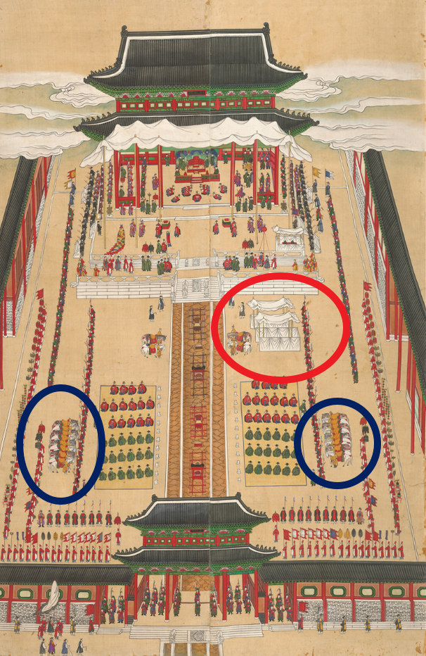 근정전진화도의 천막설치! 행사를 위한 천막뿐만 아니라.... 주변의 말?을 고정하는 용도로도 사용했을 거 같기도 한데^^