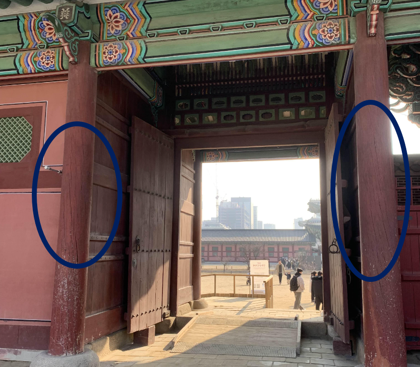 그리고, 출입문 기둥에 설치된 동그란 고리도 차일고리와 유사한 기능을 한다. 이 동그란 고리는 남쪽방향(햇볕)으로 설치되어 있고... 북쪽방향에는 설치되어 있지 않다. 장식이라기 보도는 다양한 기능을 위해 설치한 고리!