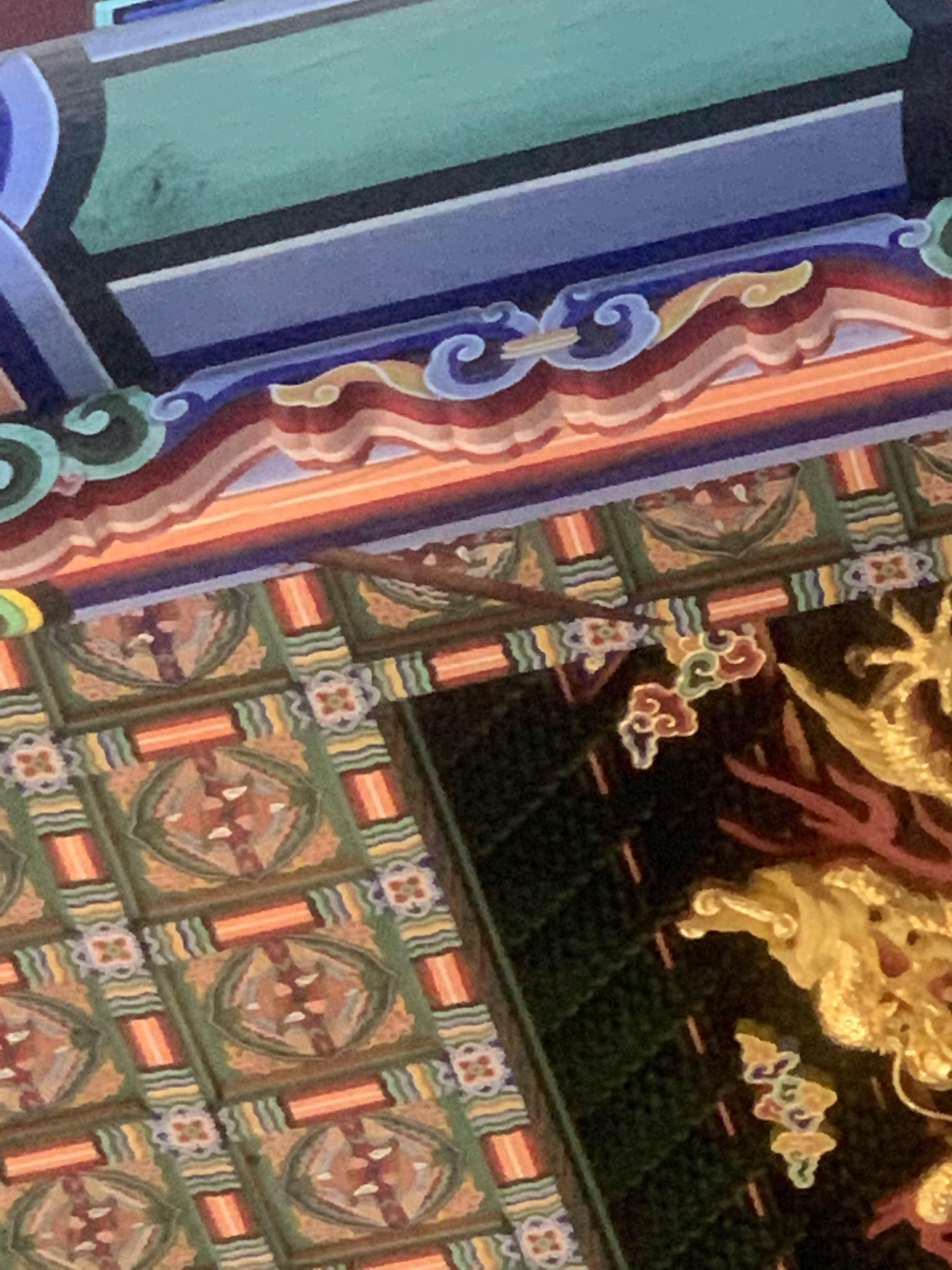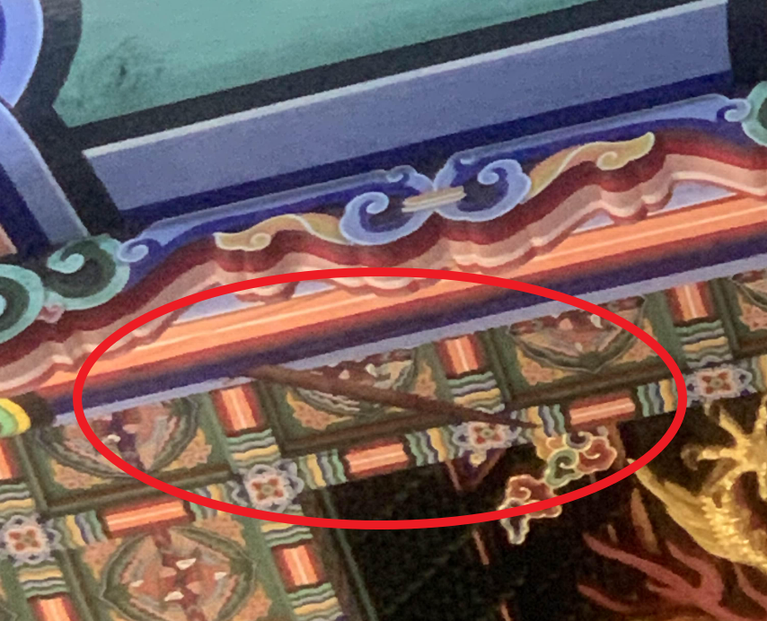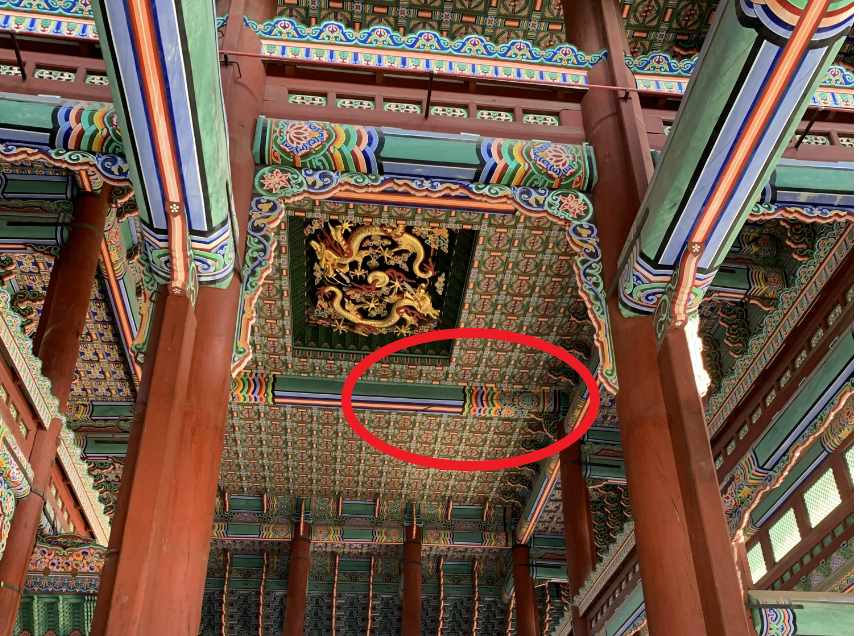 근정전 내부 천장을 유심히 보고 있는데... 이상하게 대들보가 갈라진듯한 모습이 보인다.