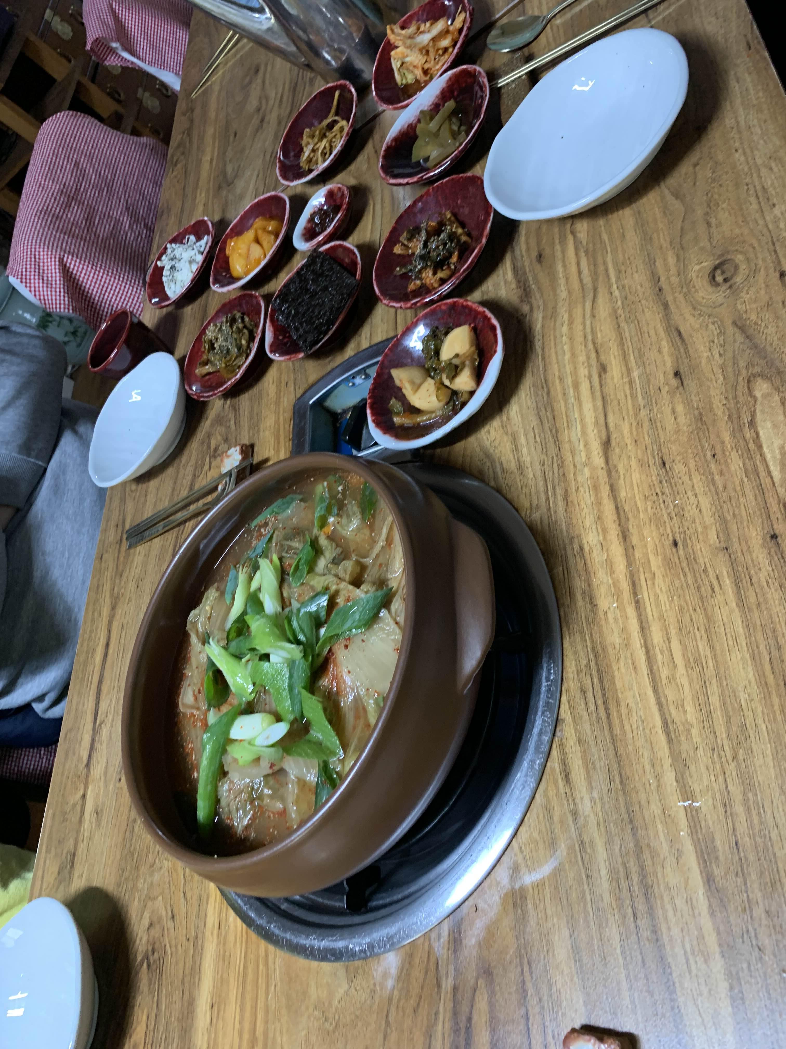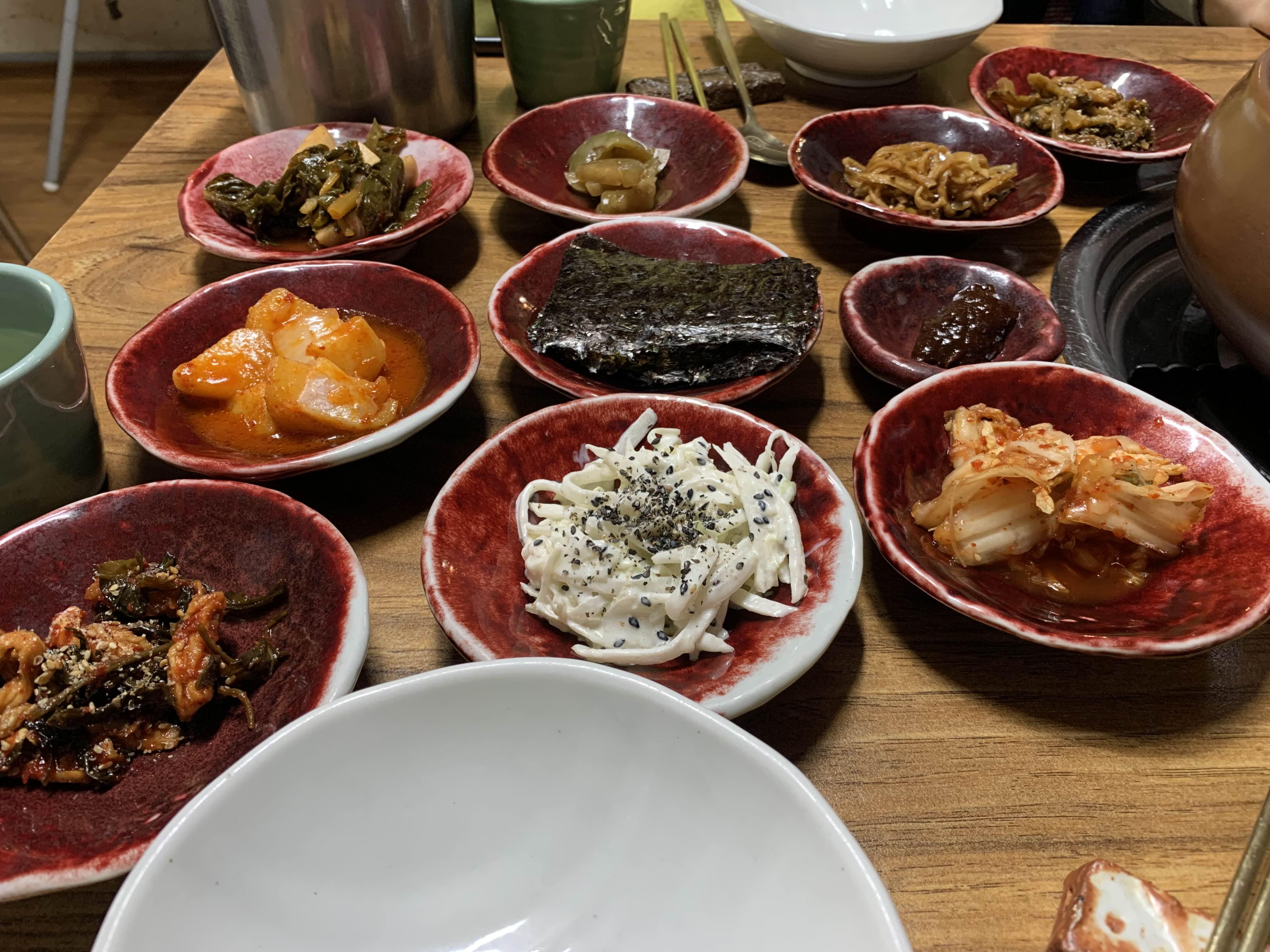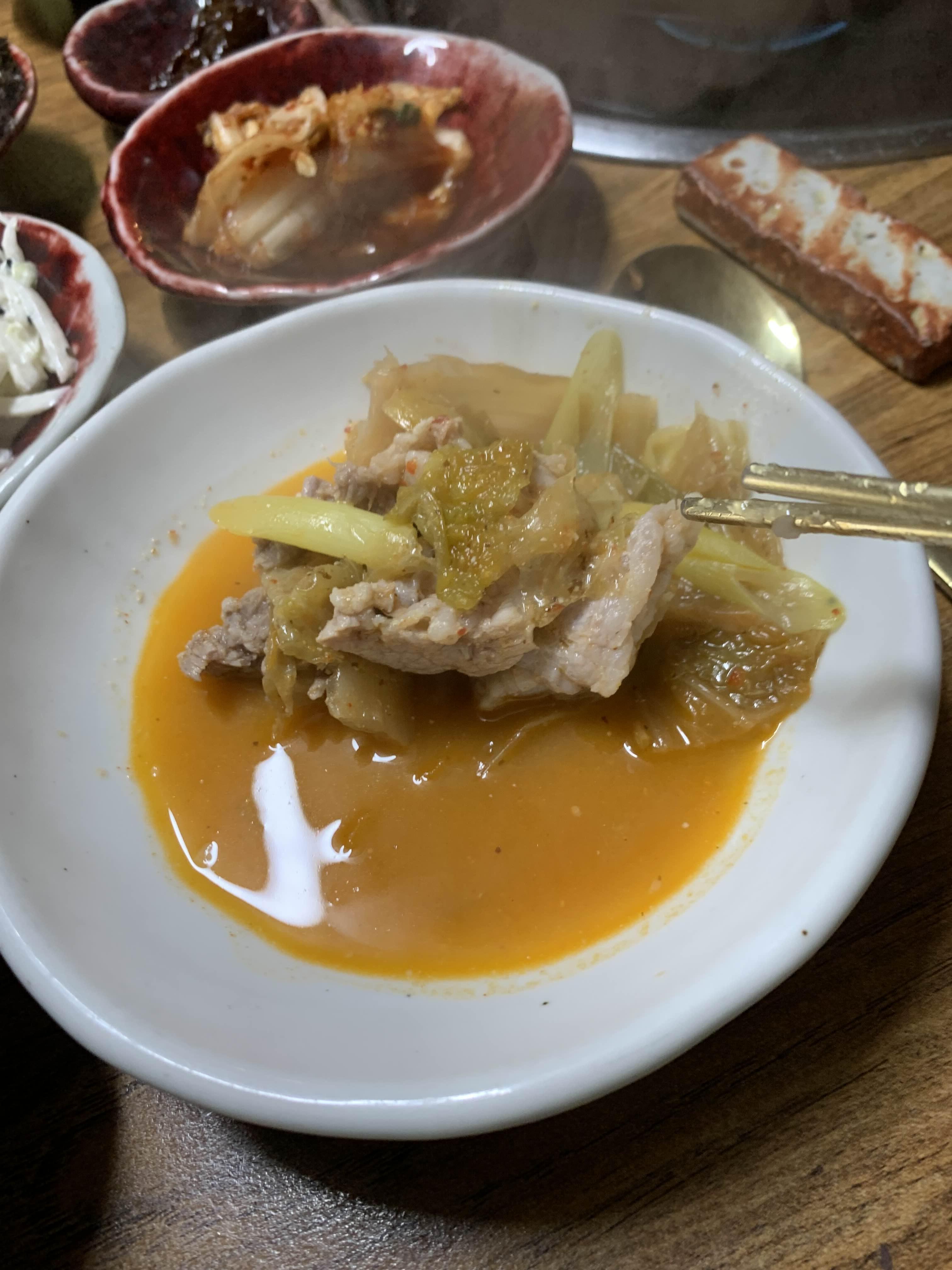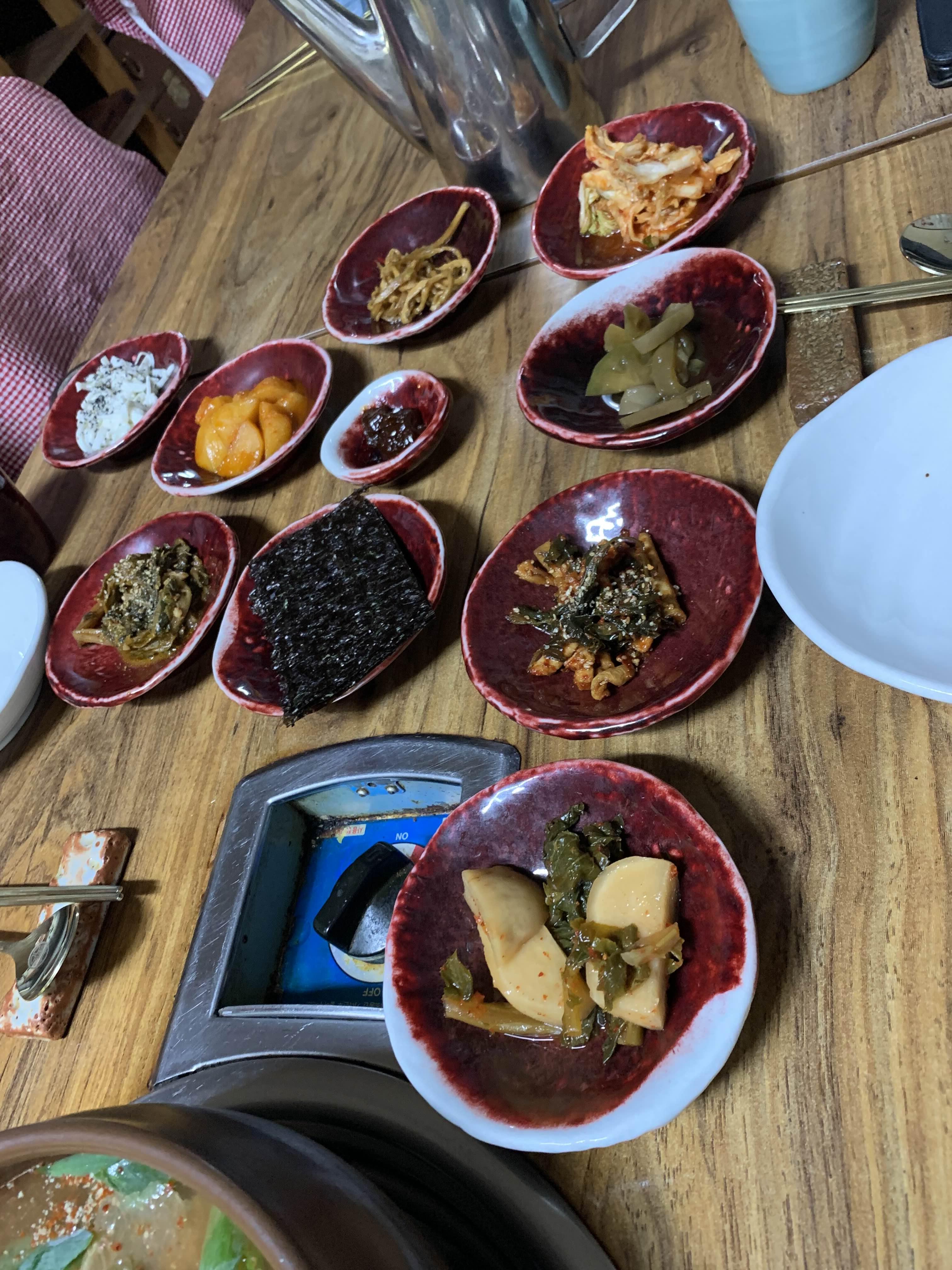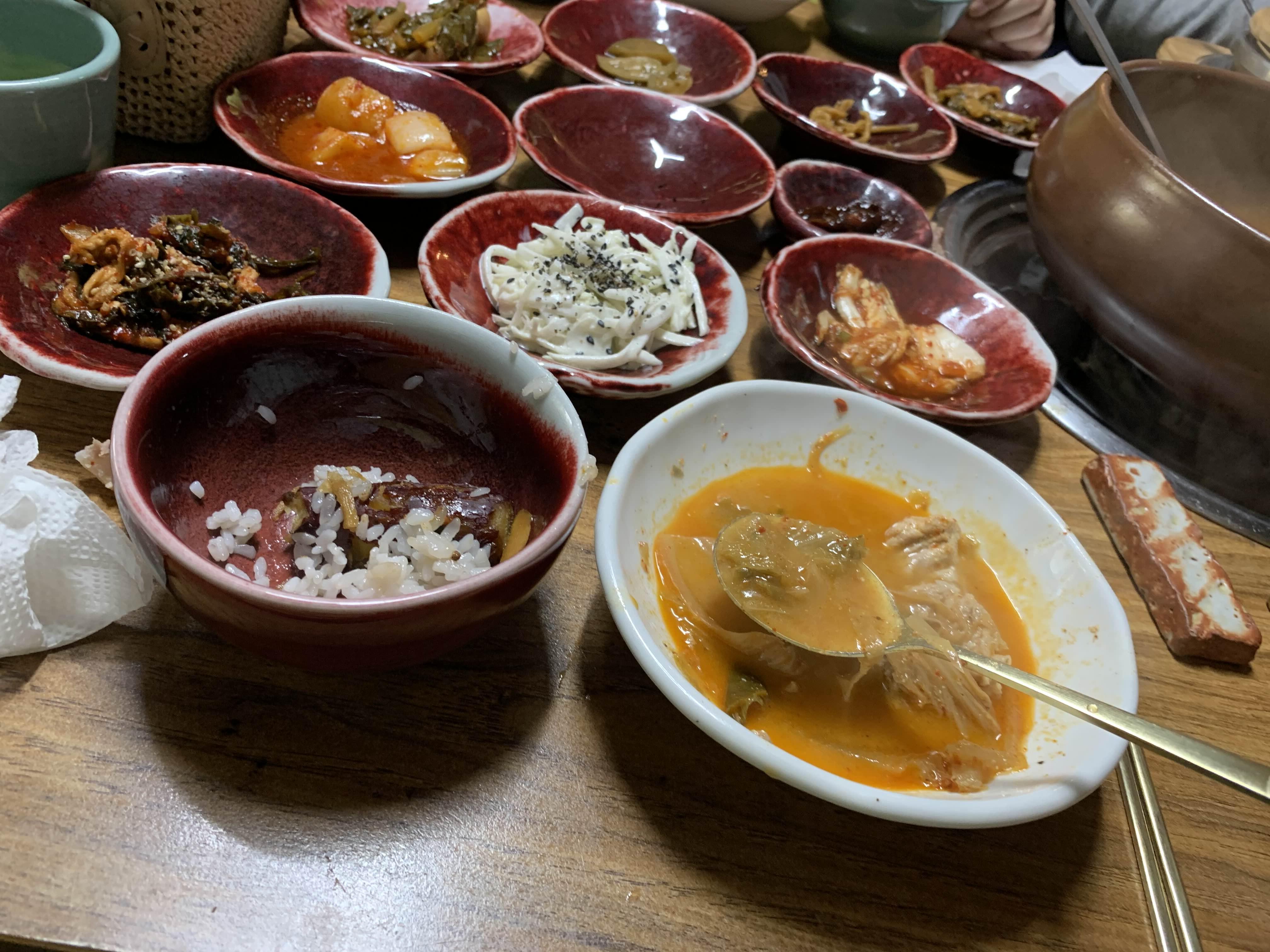 묵은지 갈비전골의 비주얼이... 묵은지가 상당히 많이 묵은 거 같더군요. 묵은지에 뭍은 양념을 제거하고... 약간의 맹탕의 느낌의 비주얼이더군요. 밑반찬은 정갈하게 9가지.... 김치 위주로 나오더군요.