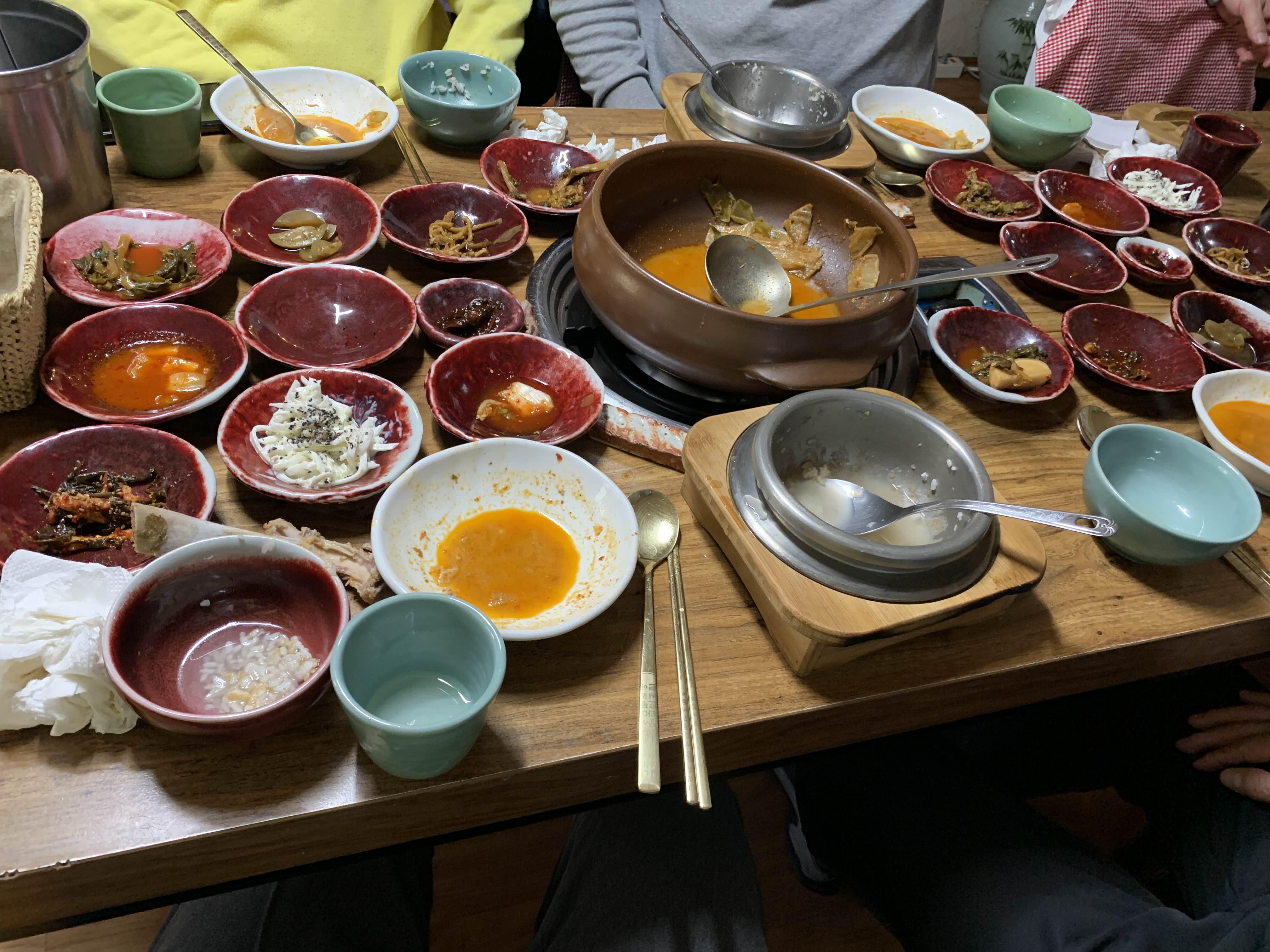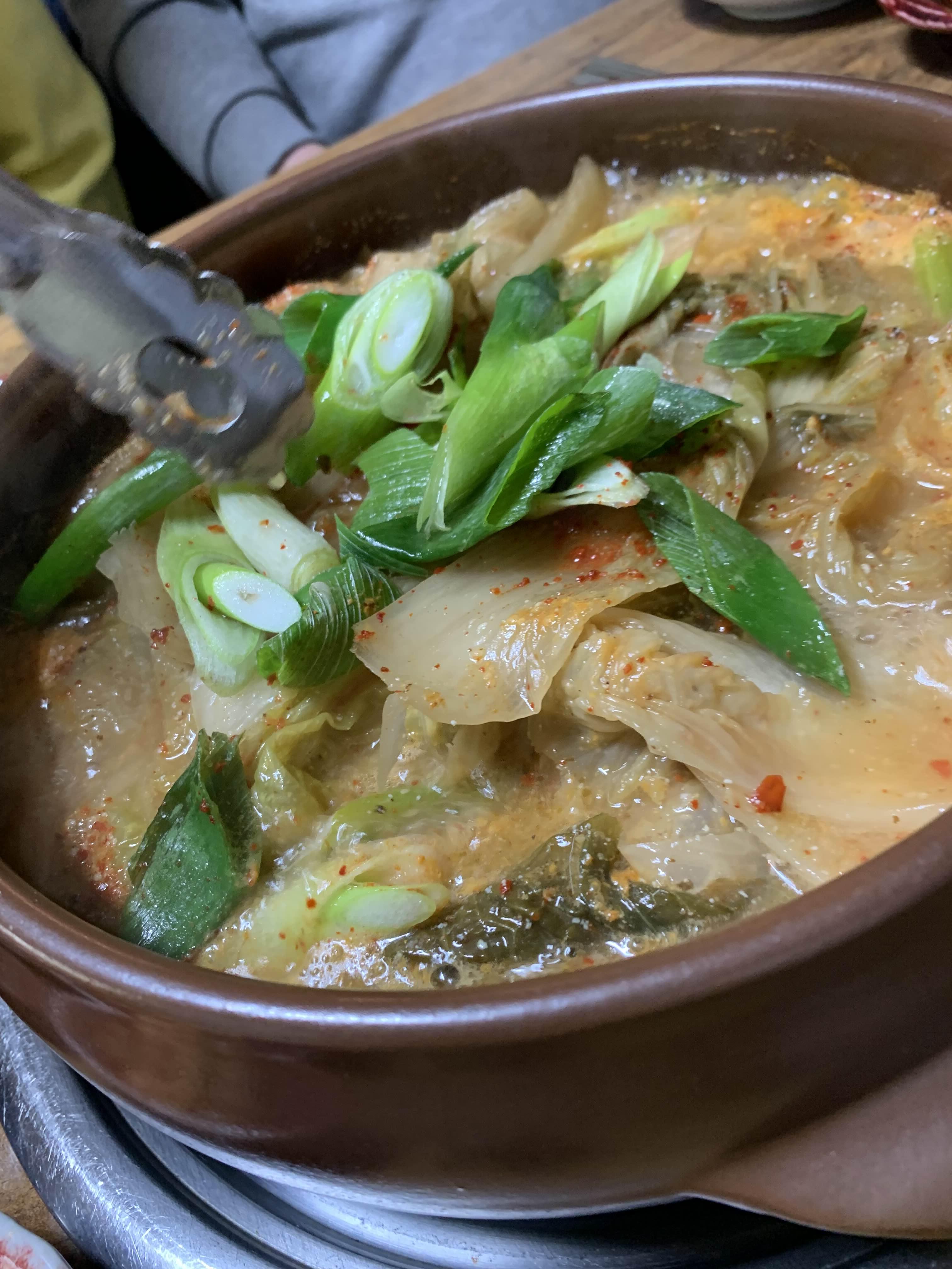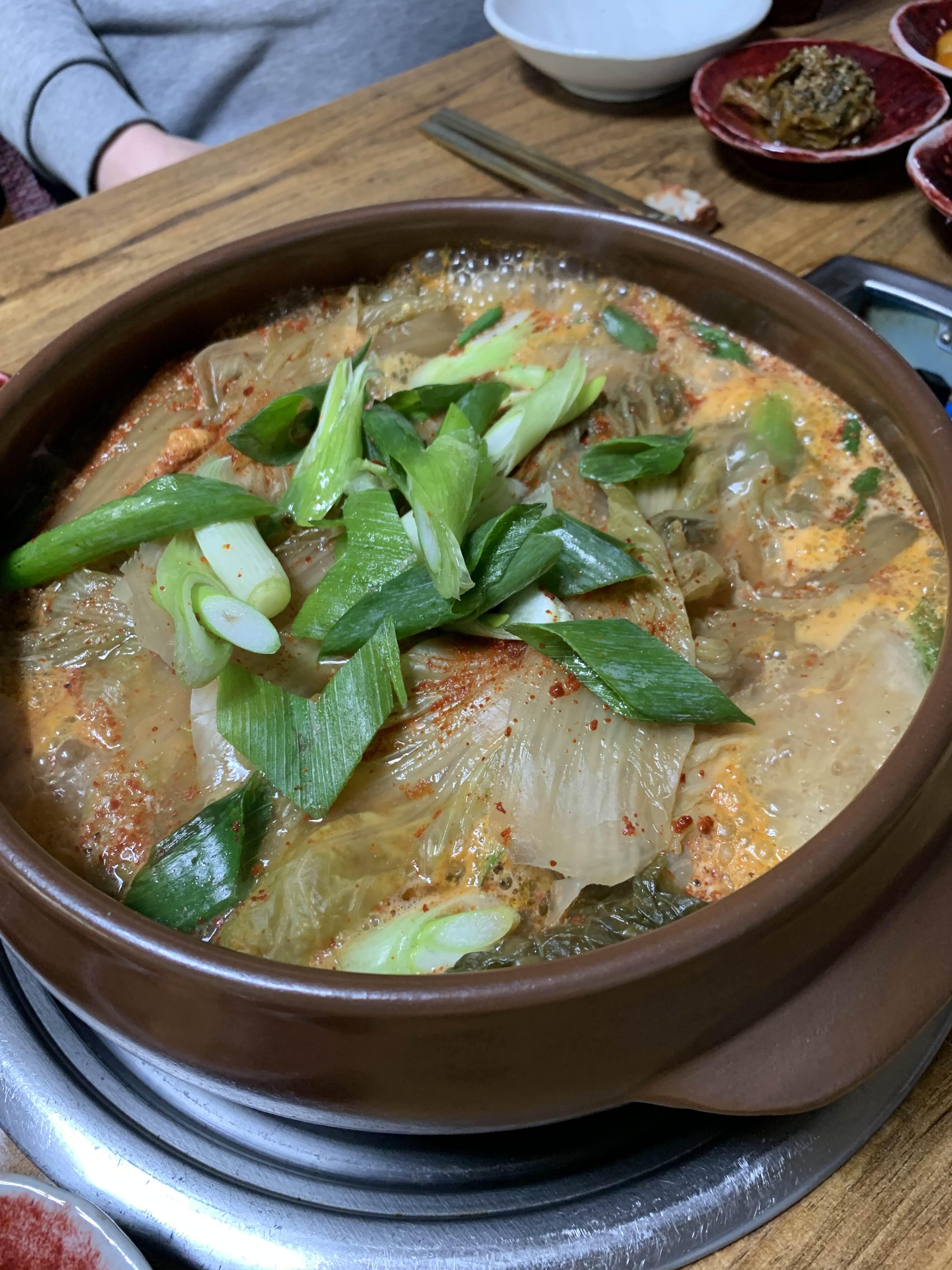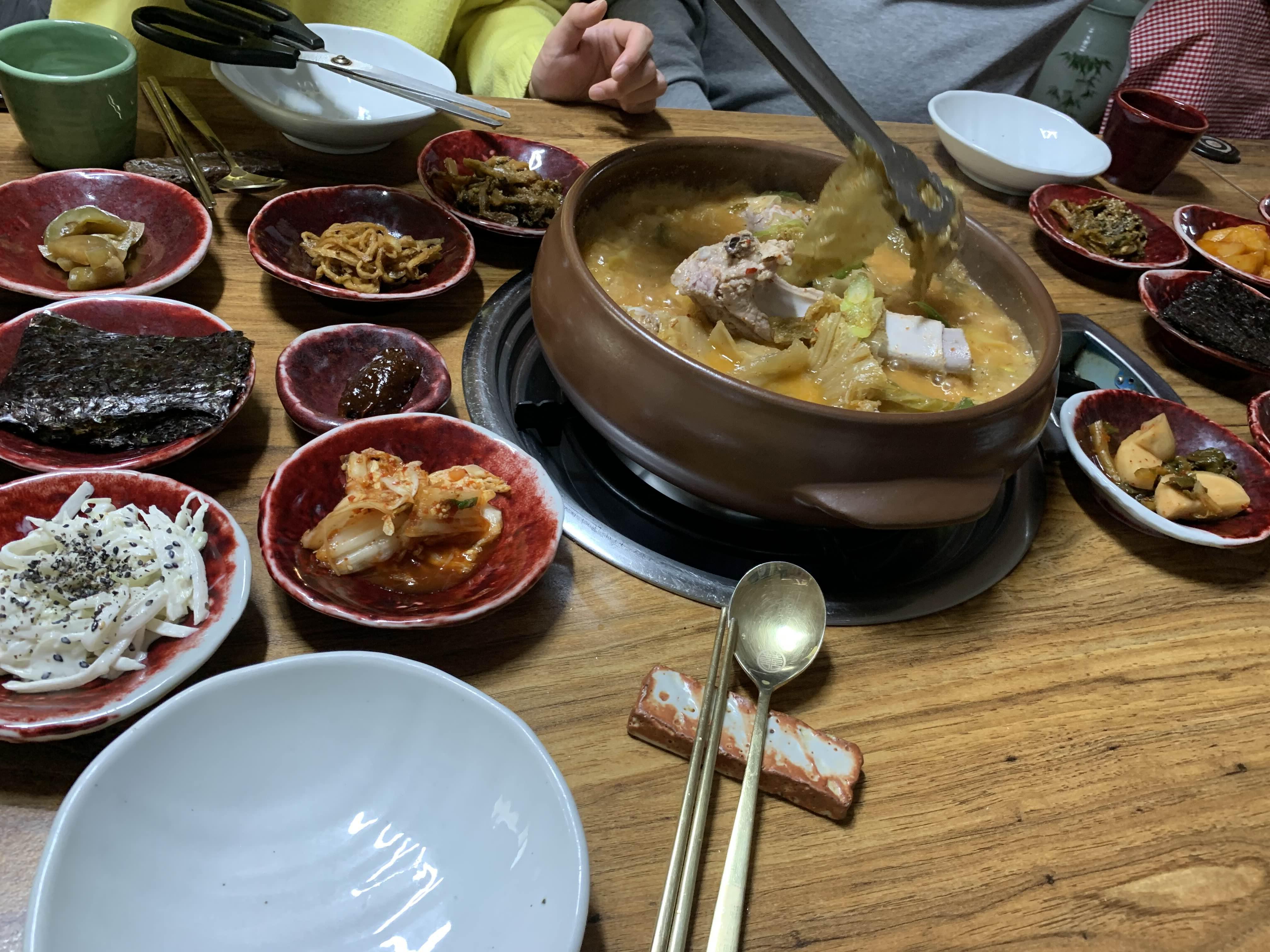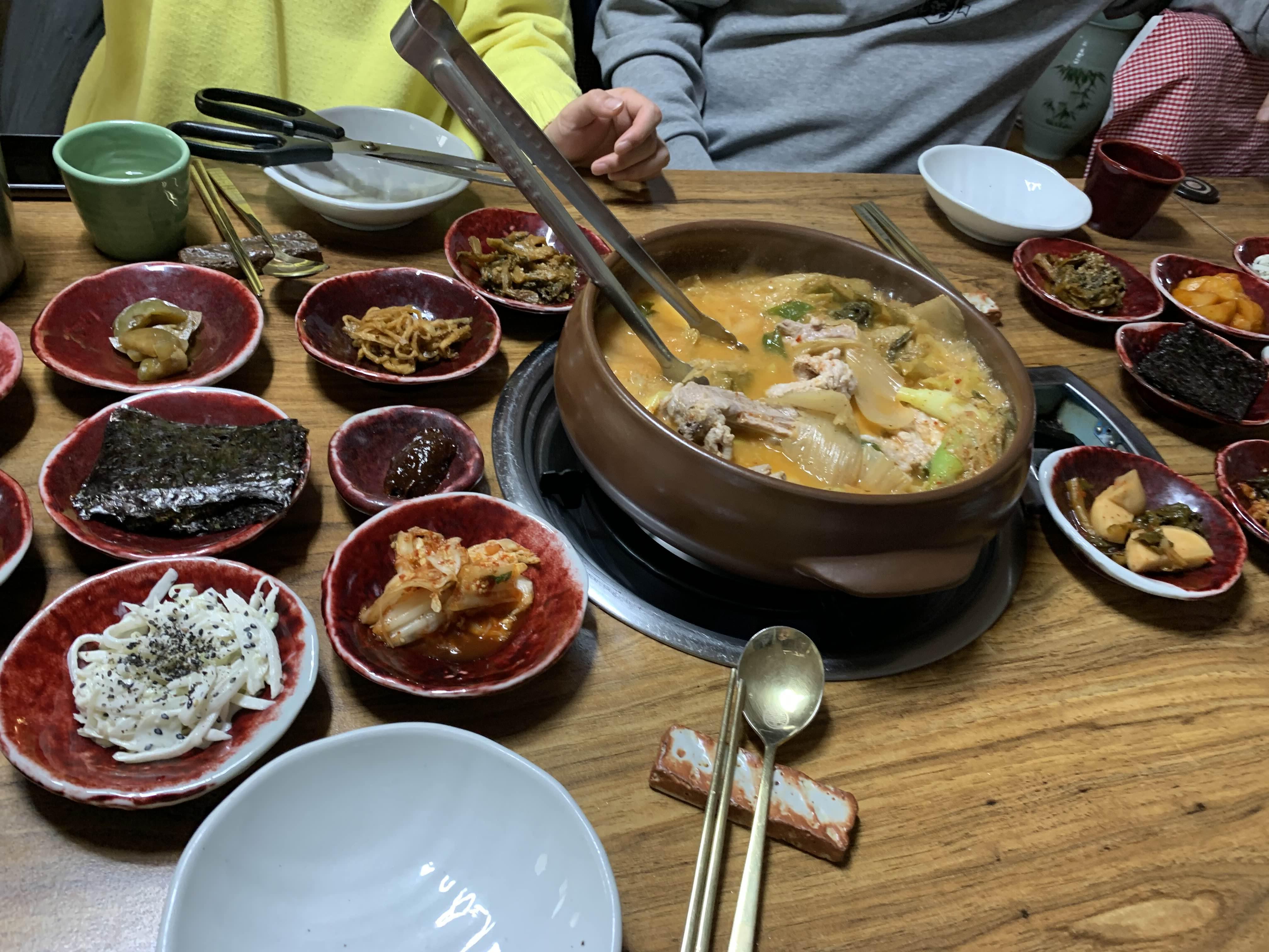 묵은지 갈비전골의 비주얼이... 묵은지가 상당히 많이 묵은 거 같더군요. 묵은지에 뭍은 양념을 제거하고... 약간의 맹탕의 느낌의 비주얼이더군요. 밑반찬은 정갈하게 9가지.... 김치 위주로 나오더군요.