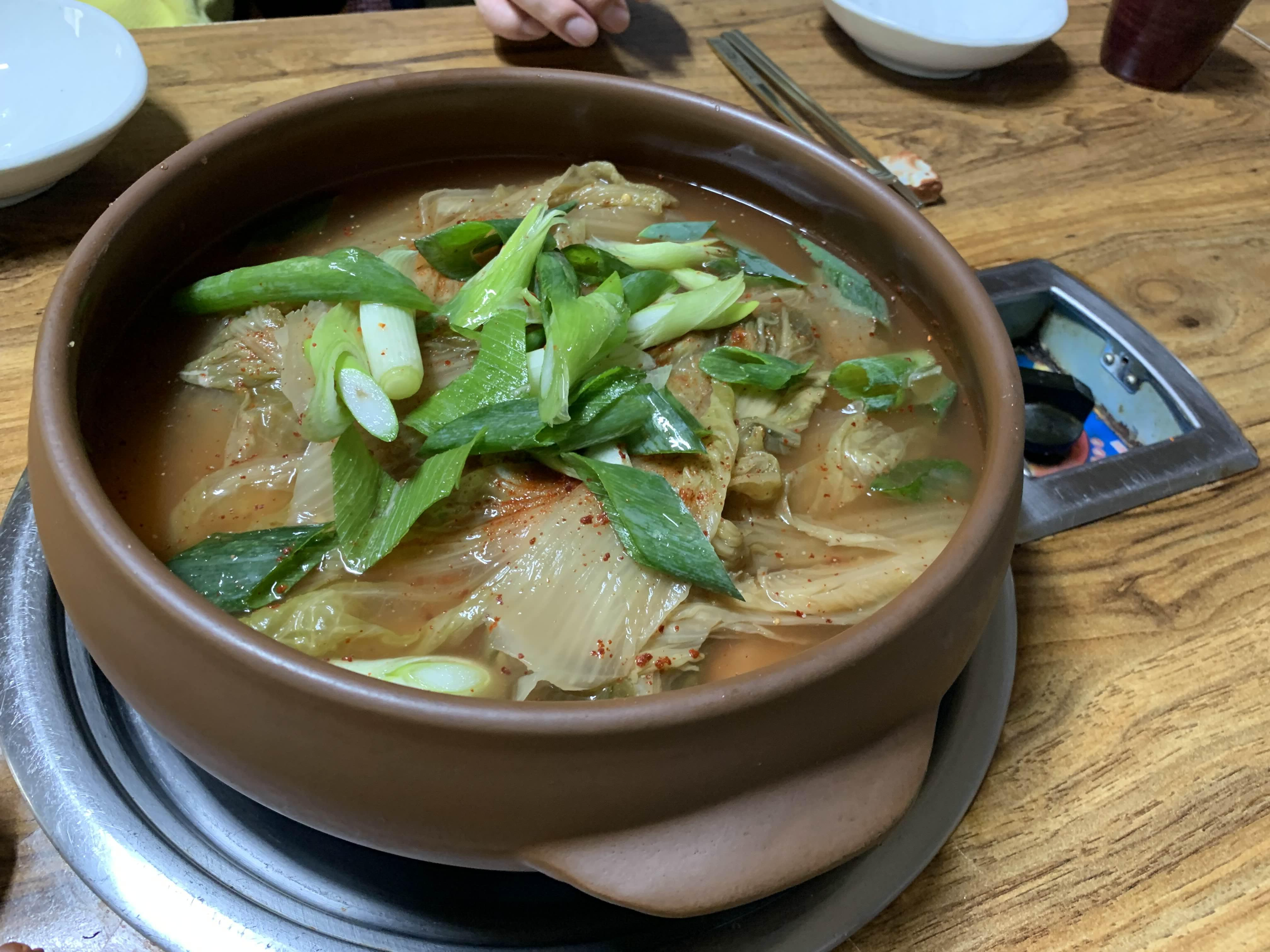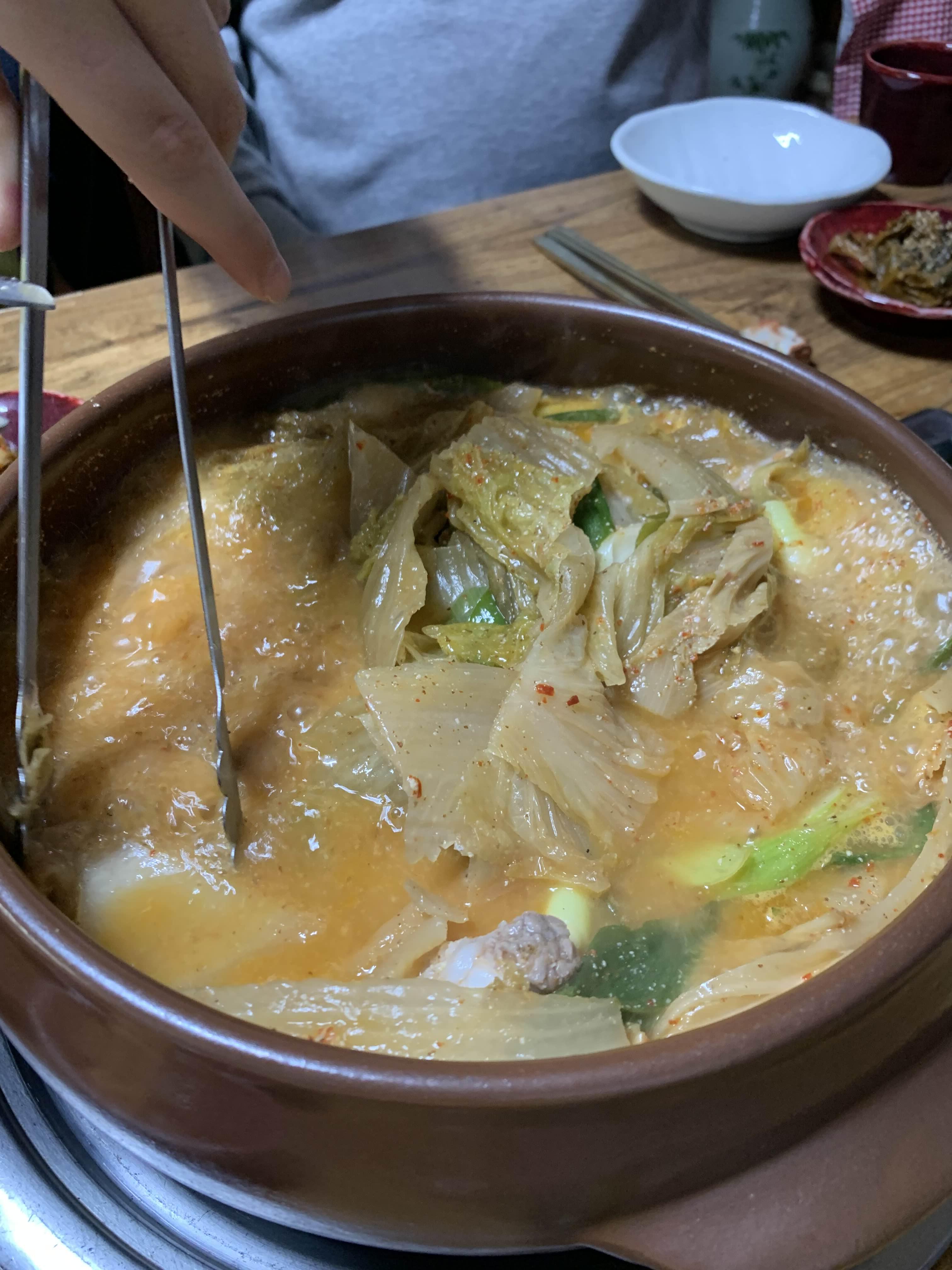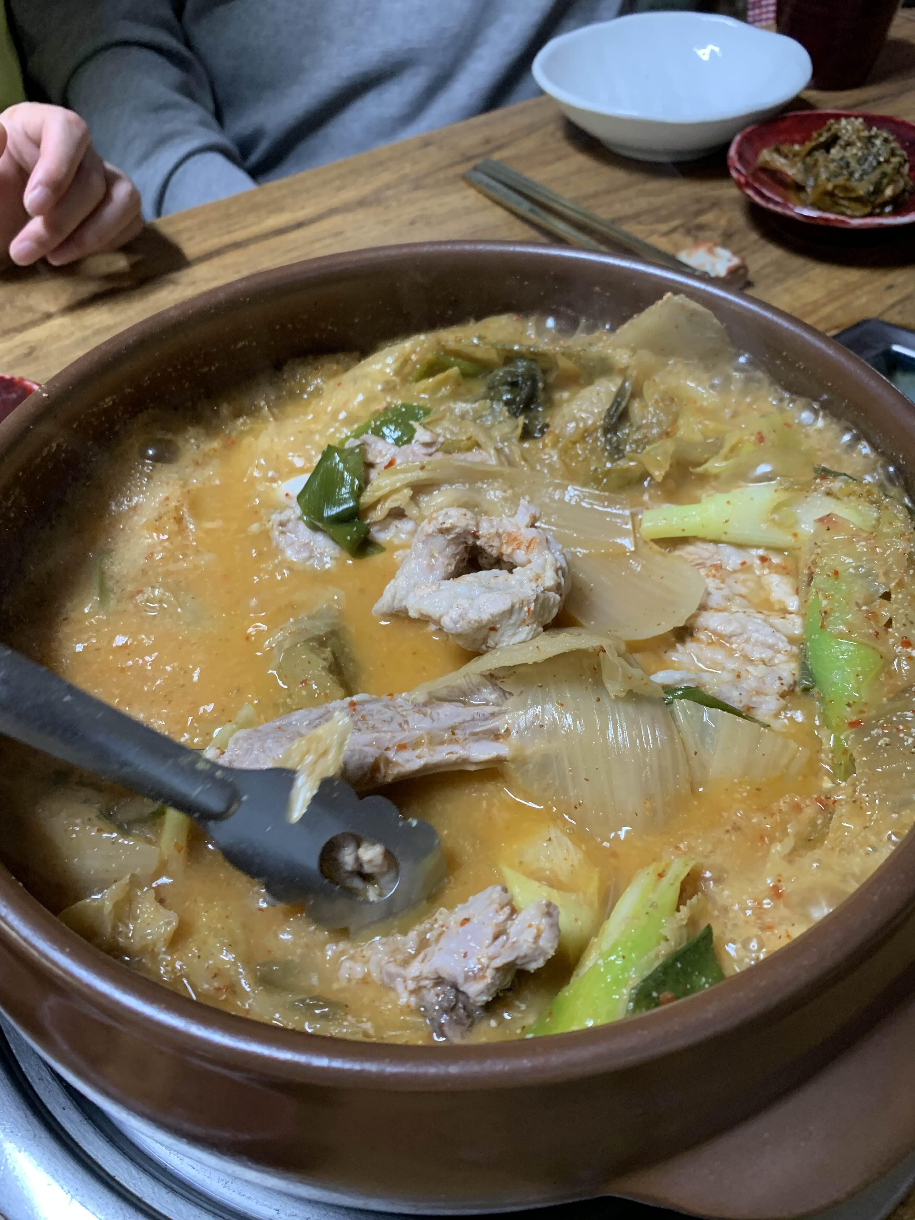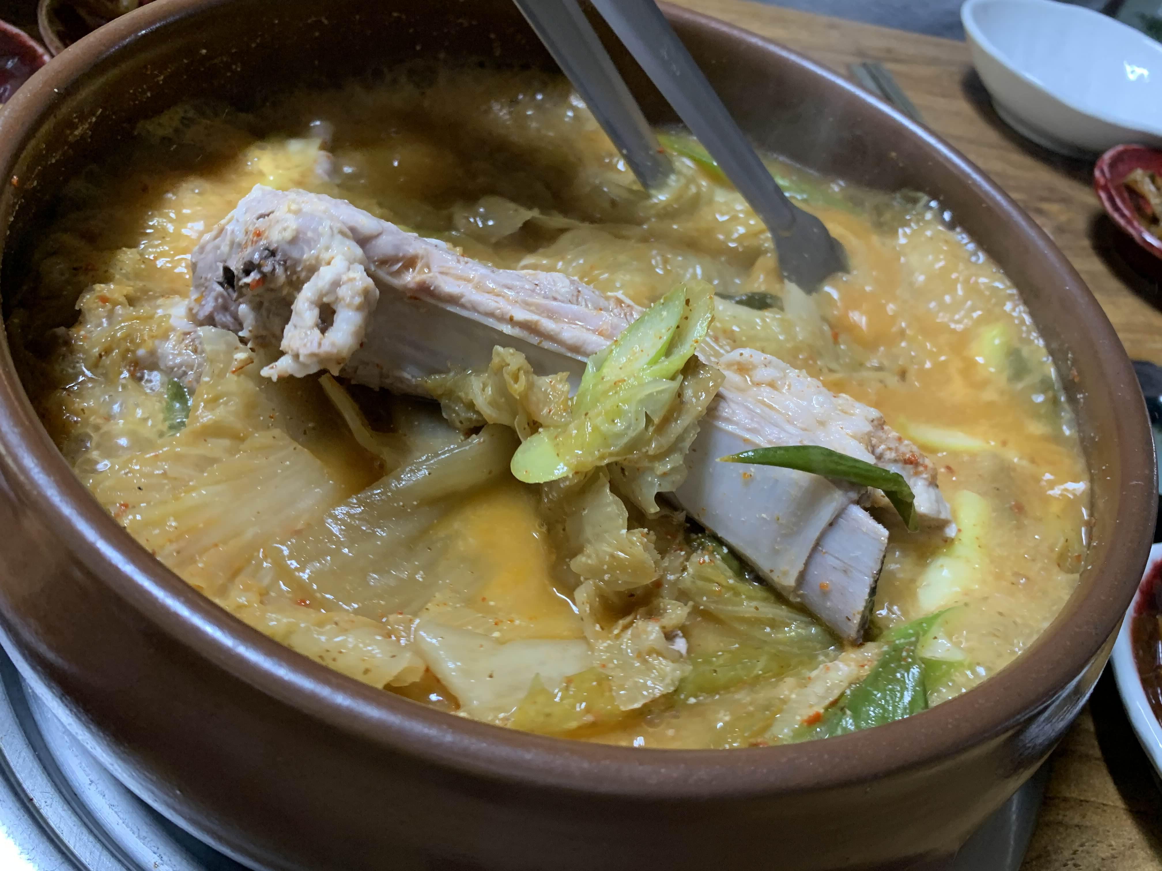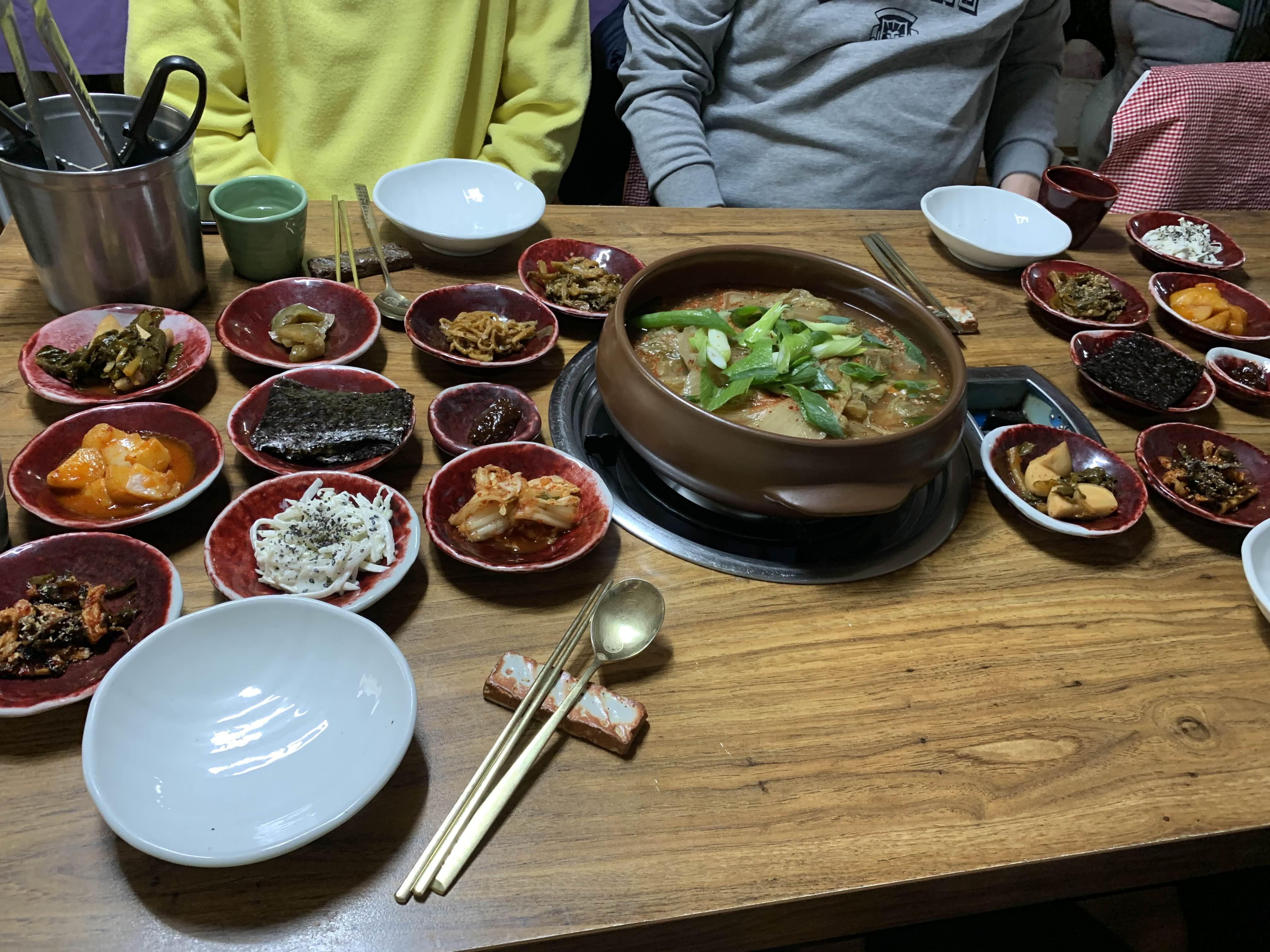 묵은지 갈비전골의 비주얼이... 묵은지가 상당히 많이 묵은 거 같더군요. 묵은지에 뭍은 양념을 제거하고... 약간의 맹탕의 느낌의 비주얼이더군요. 밑반찬은 정갈하게 9가지.... 김치 위주로 나오더군요.