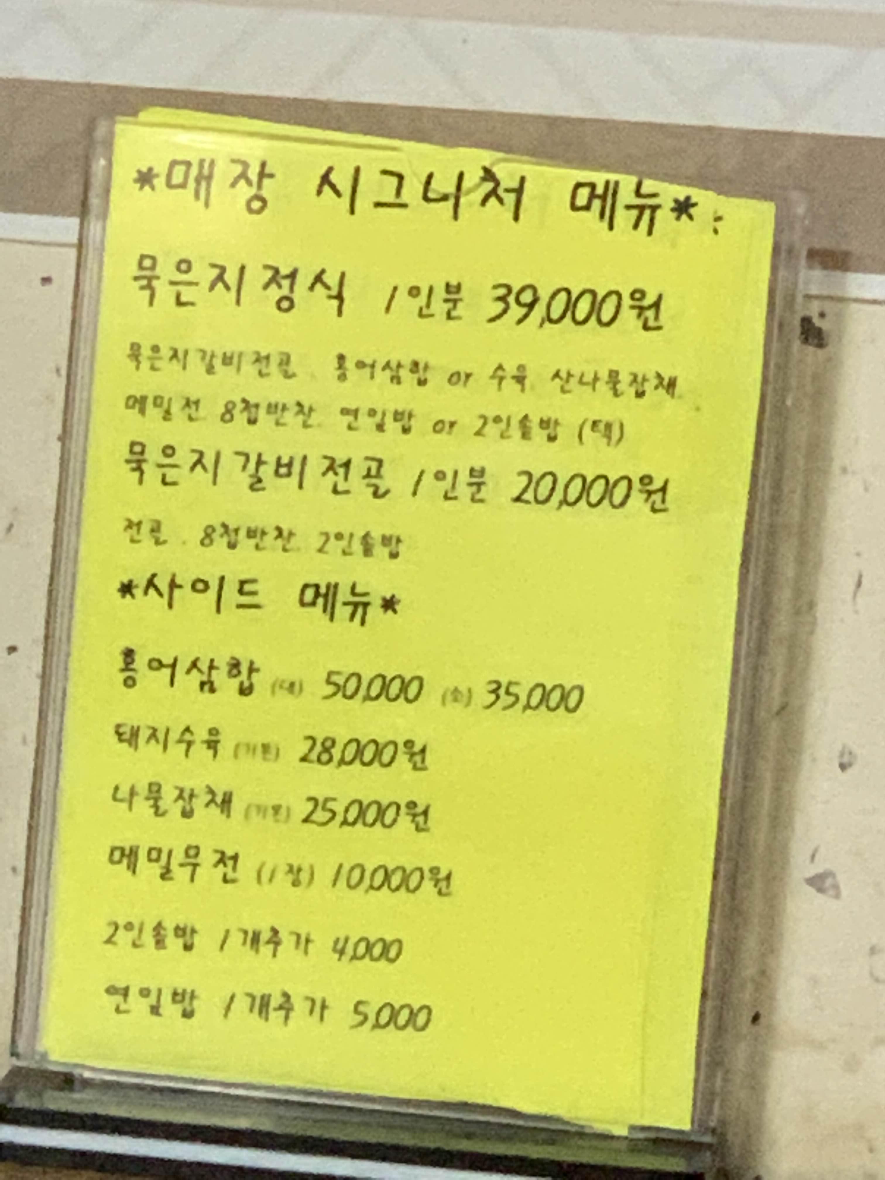 음식 가격은 상당히 나가더군요. 매장 시그니처 메뉴!!! 묵은지 정식 1인분.... 39,000원..... ㅎㄷㄷ 하더군요.ㅎㅎ