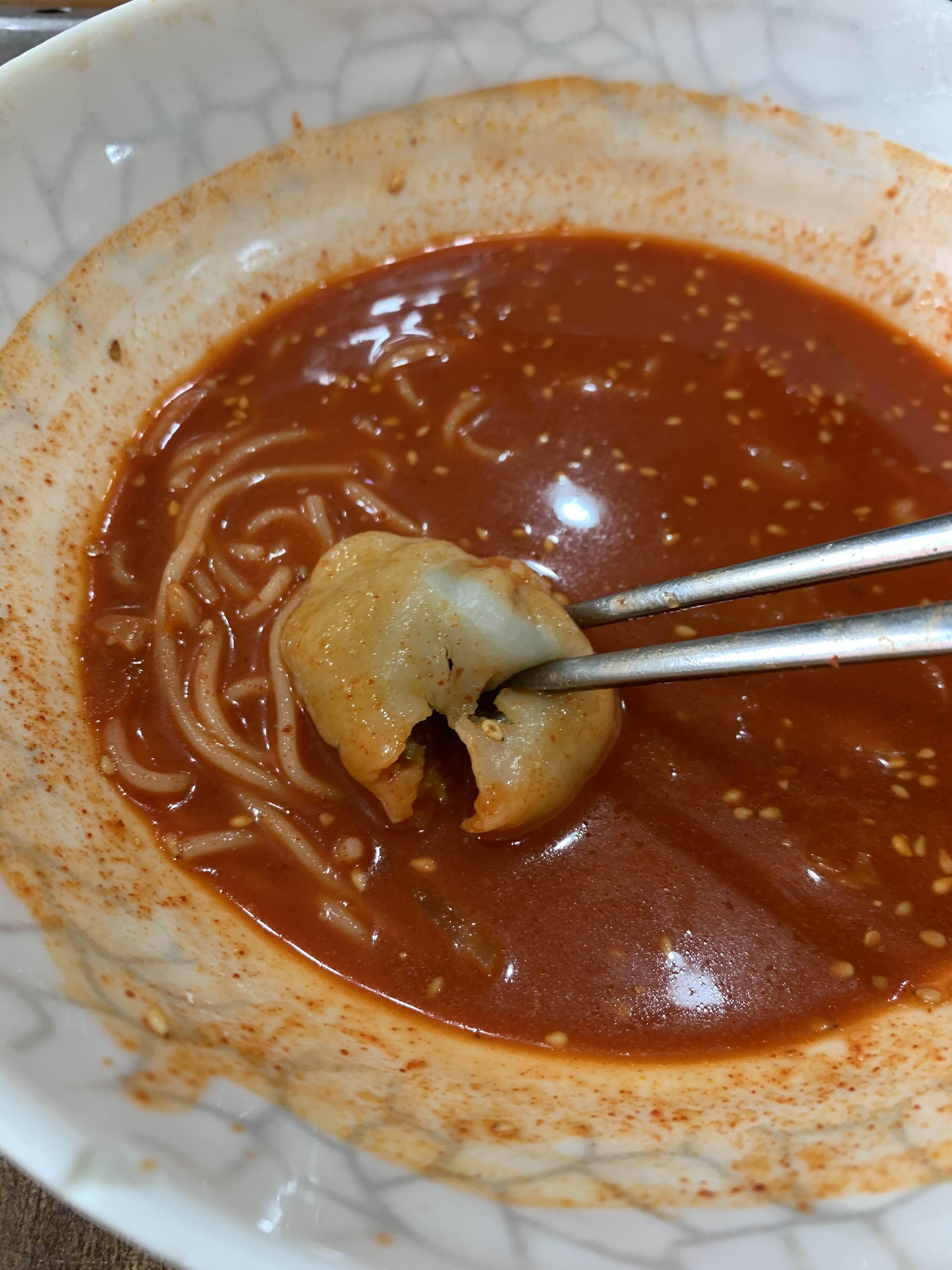 요 감자만두를 비빔국수의 양념을 푹 찍어서 먹으니 맛이 괜찮다. ㅎㅎ