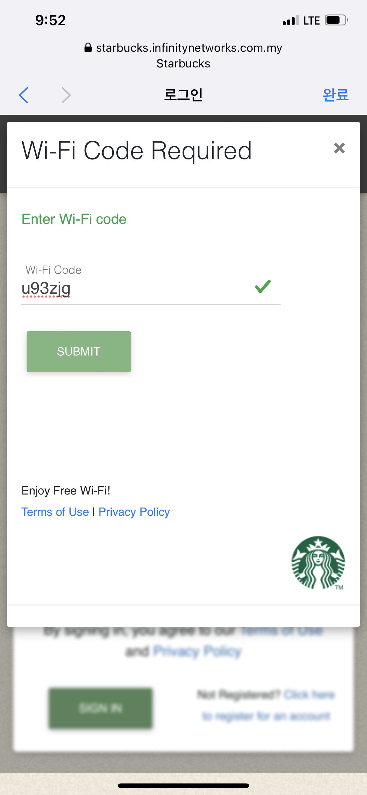 스타벅스의 와이파이를 연결하려면 회원가입... 코드를 입력하려면 조금 귀찮기는 하지만!!