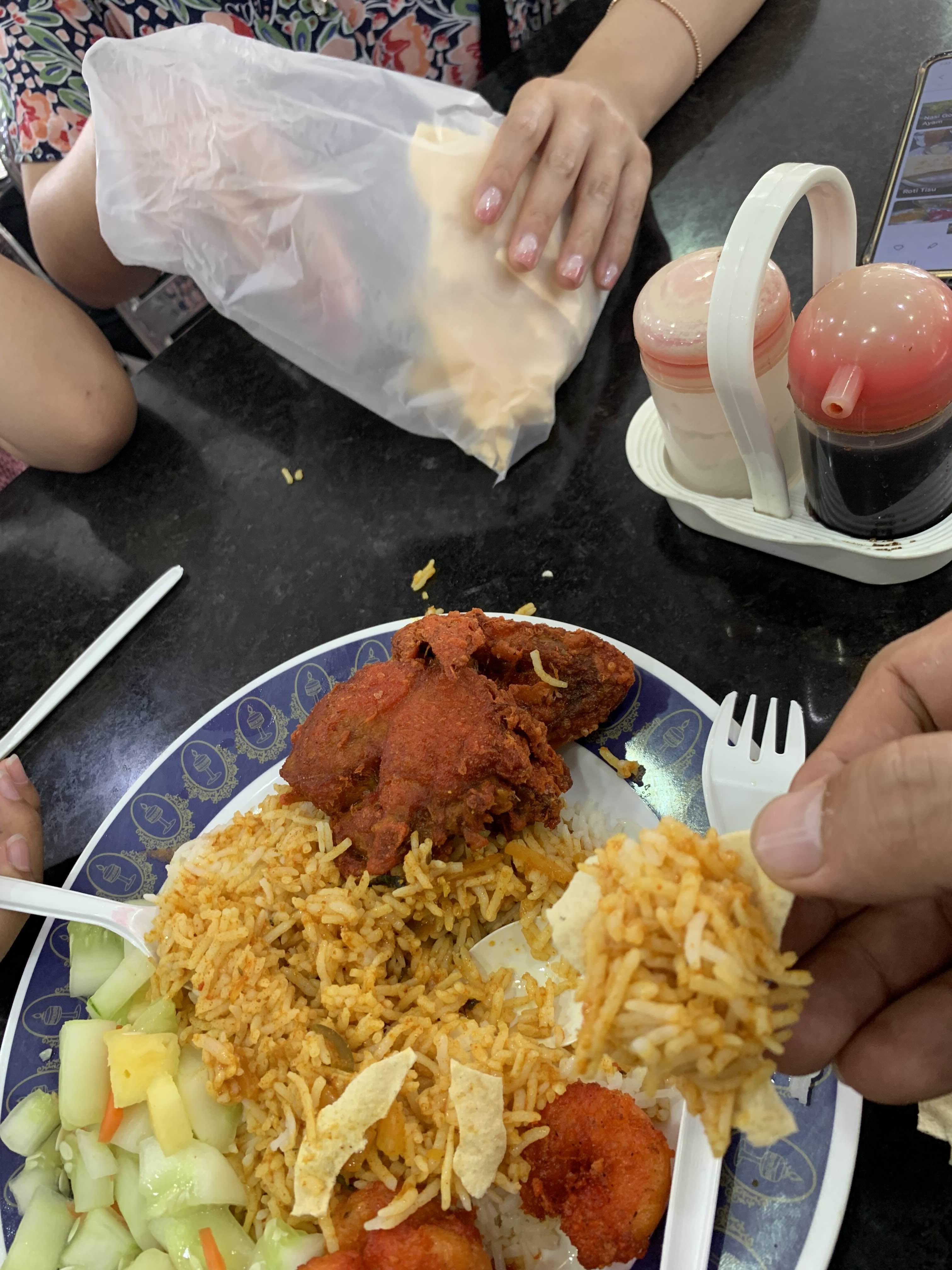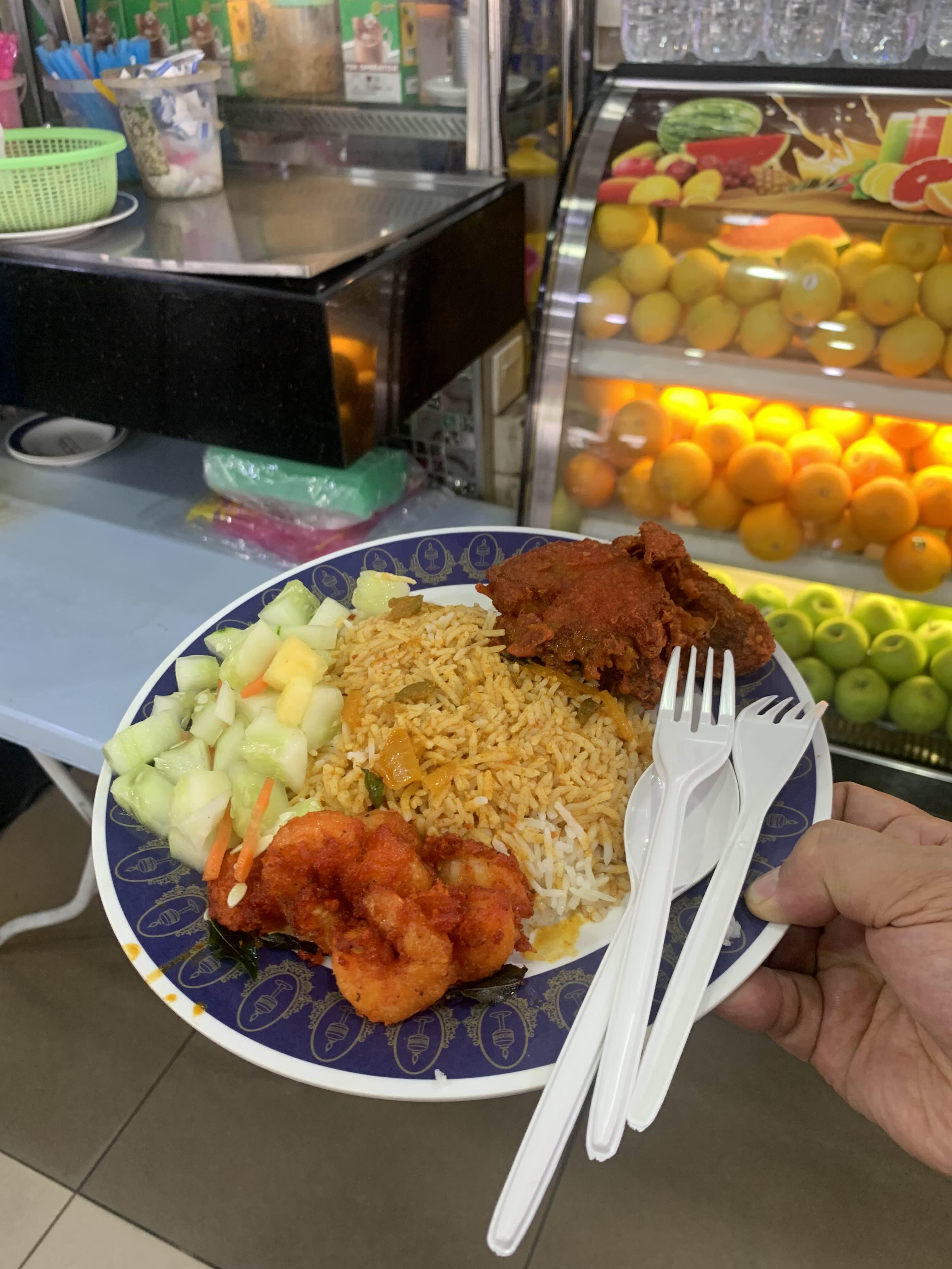 주문내역 : 밥(나 시민약 3.8링깃), 닭튀김(아얌고렝 5.6링깃), 새우튀김(우당 케이실 8.5링깃), 오이지(티문 에이카 1.6링깃)