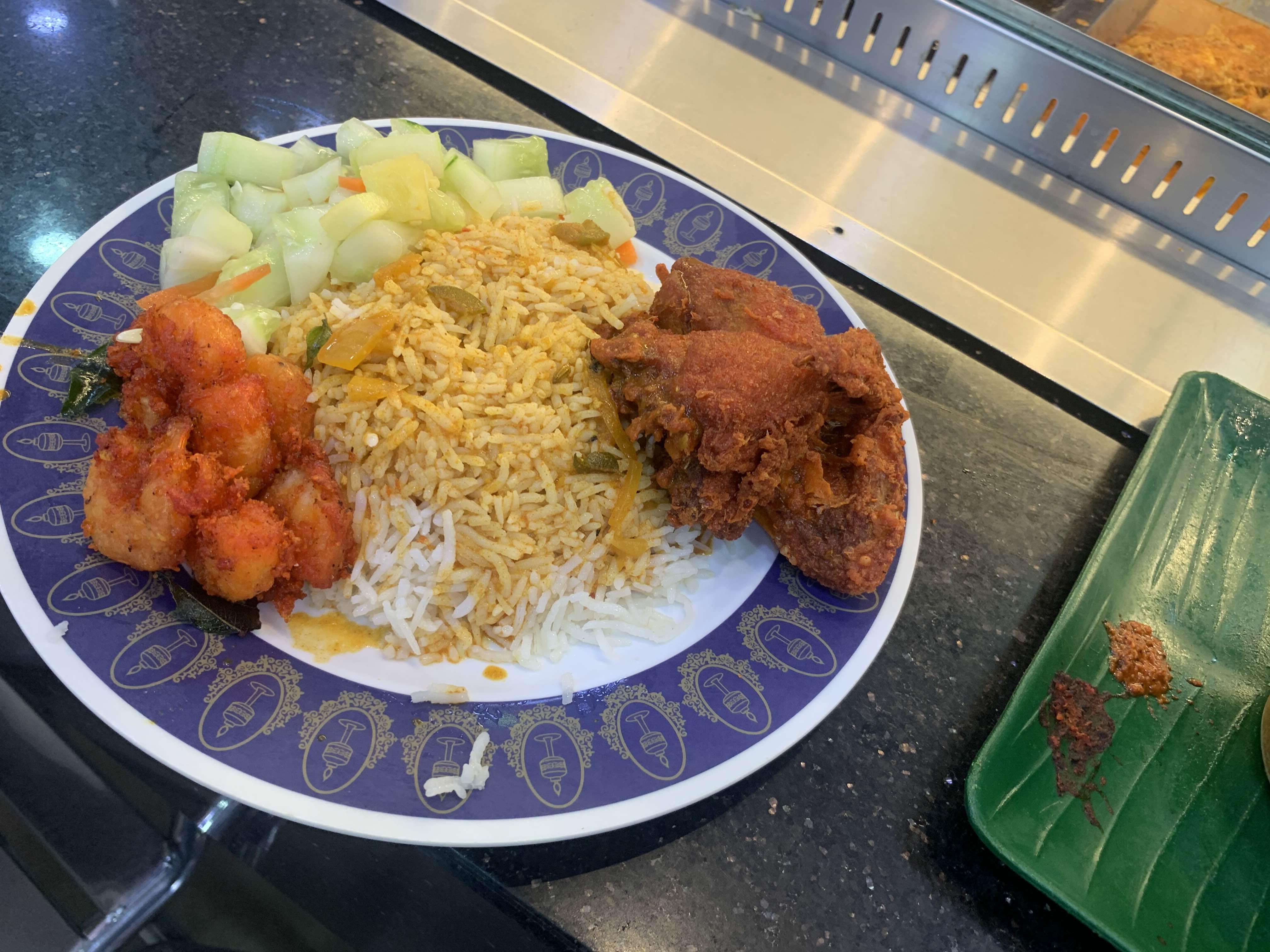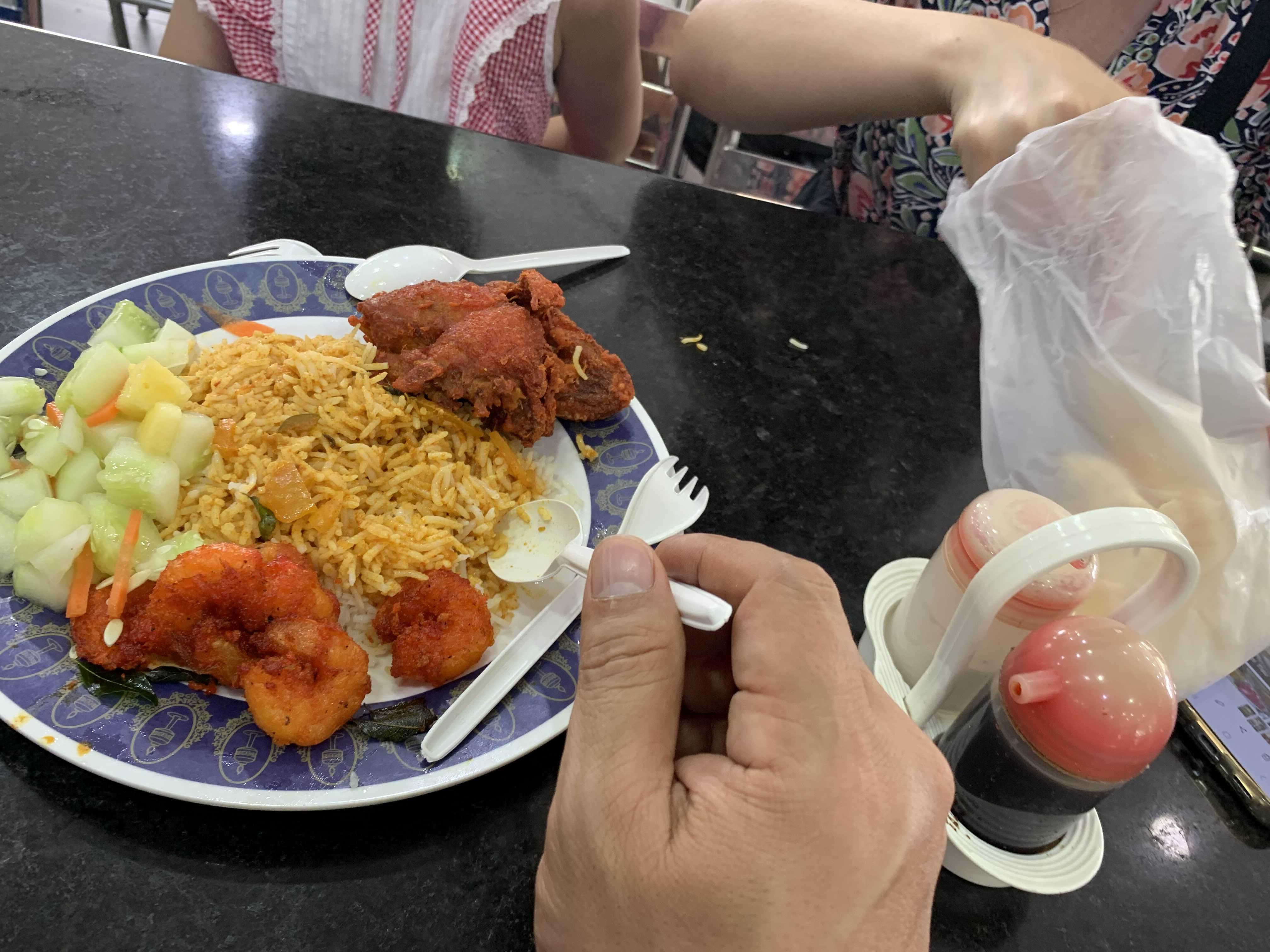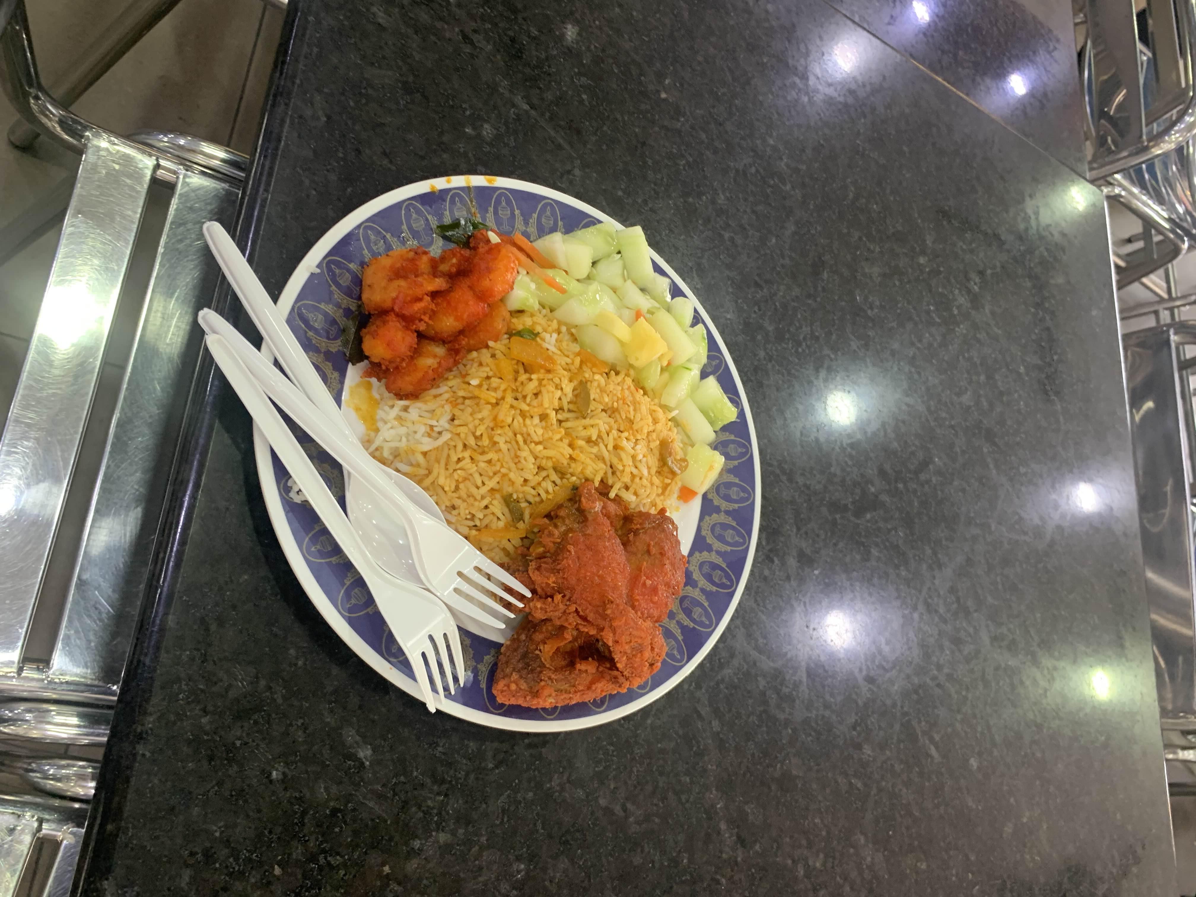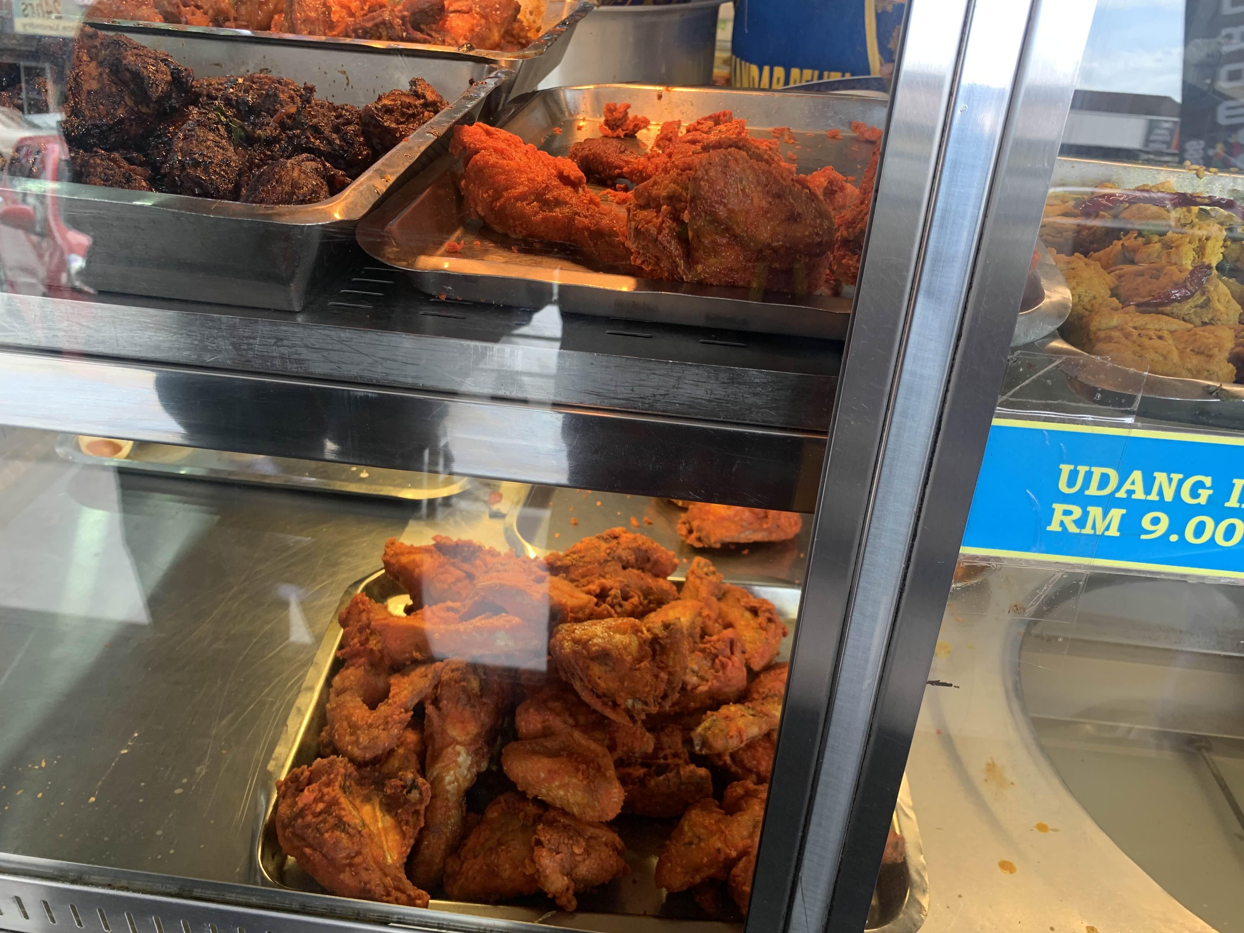 주문내역 : 밥(나 시민약 3.8링깃), 닭튀김(아얌고렝 5.6링깃), 새우튀김(우당 케이실 8.5링깃), 오이지(티문 에이카 1.6링깃)