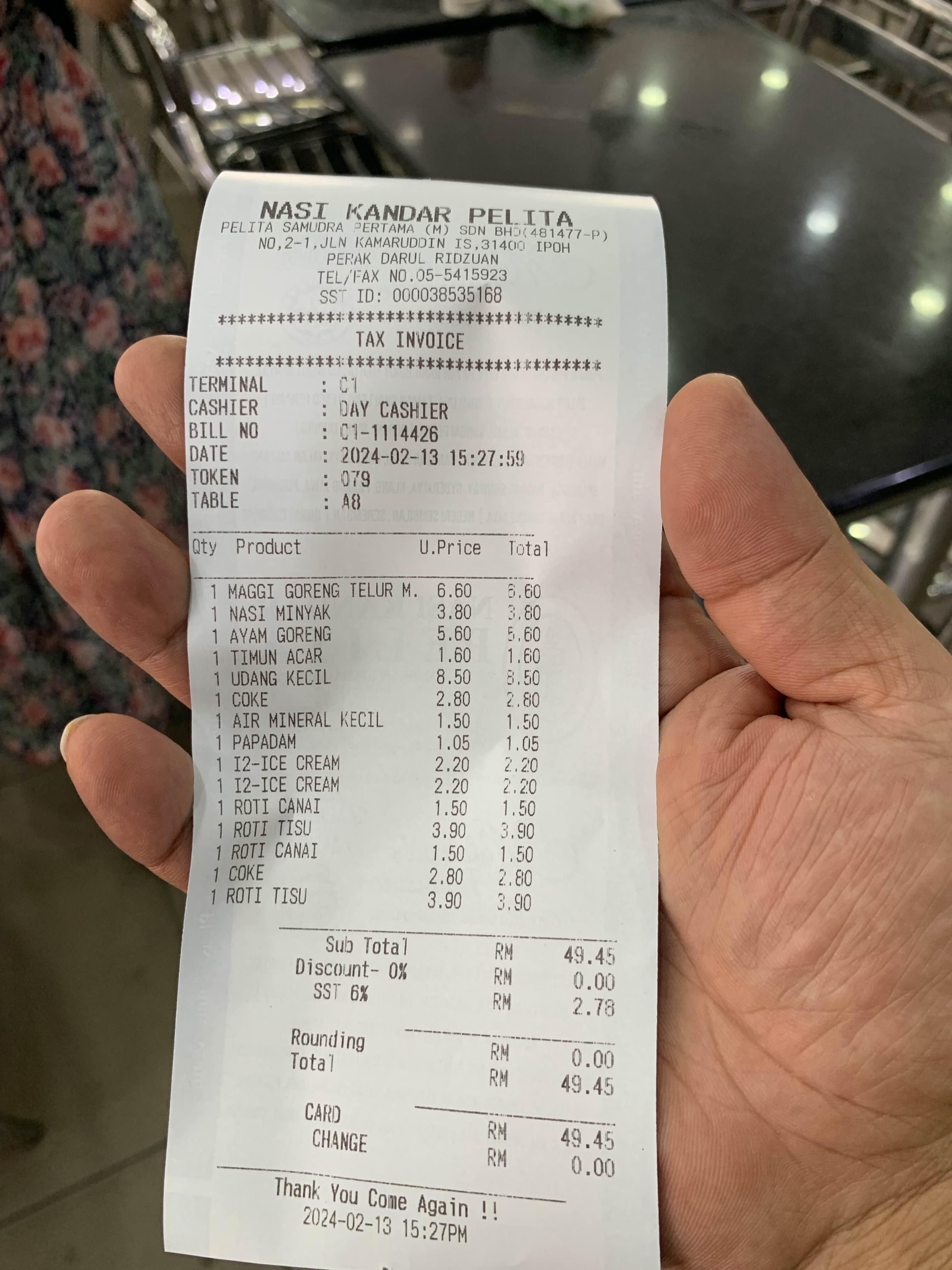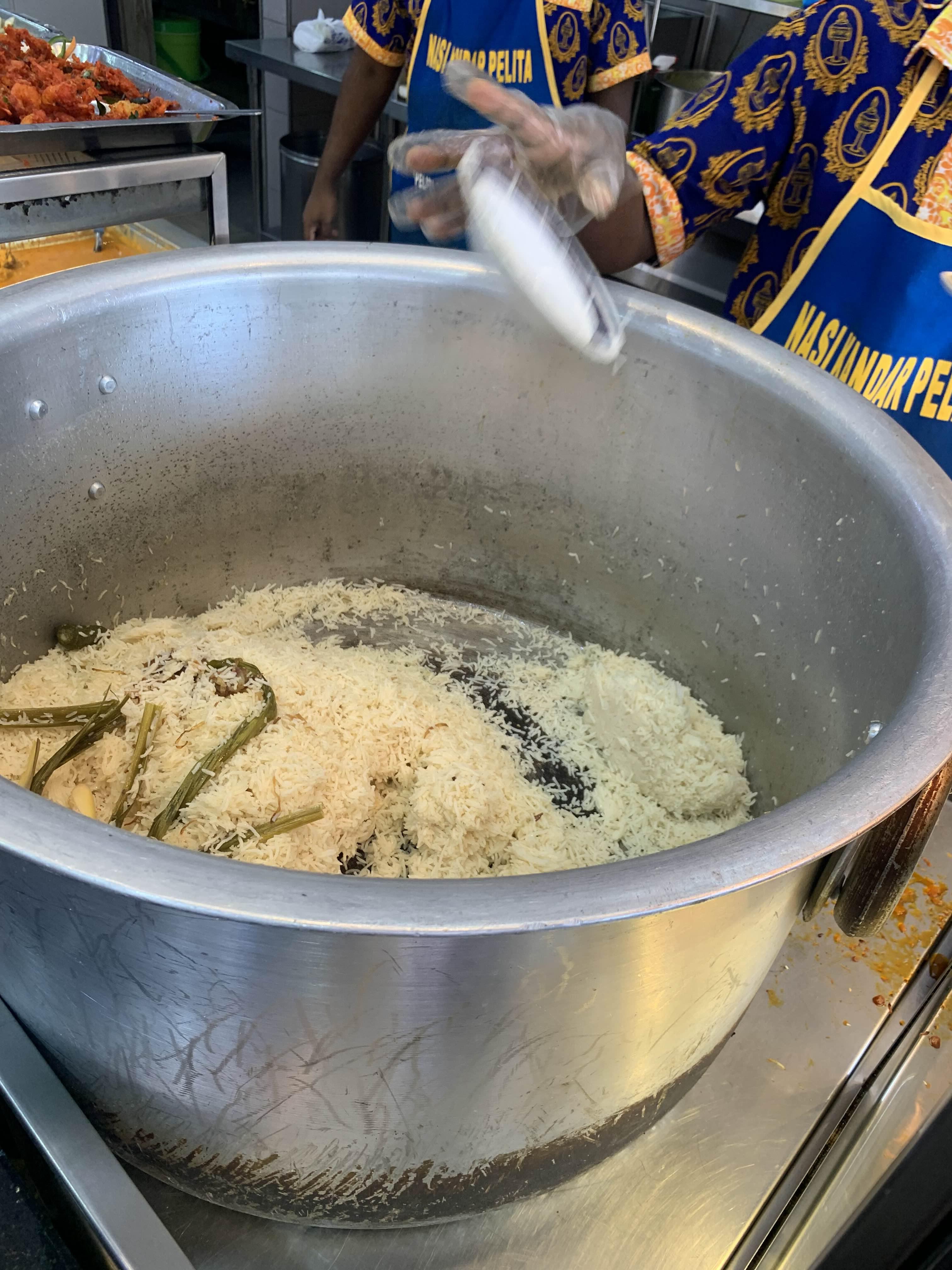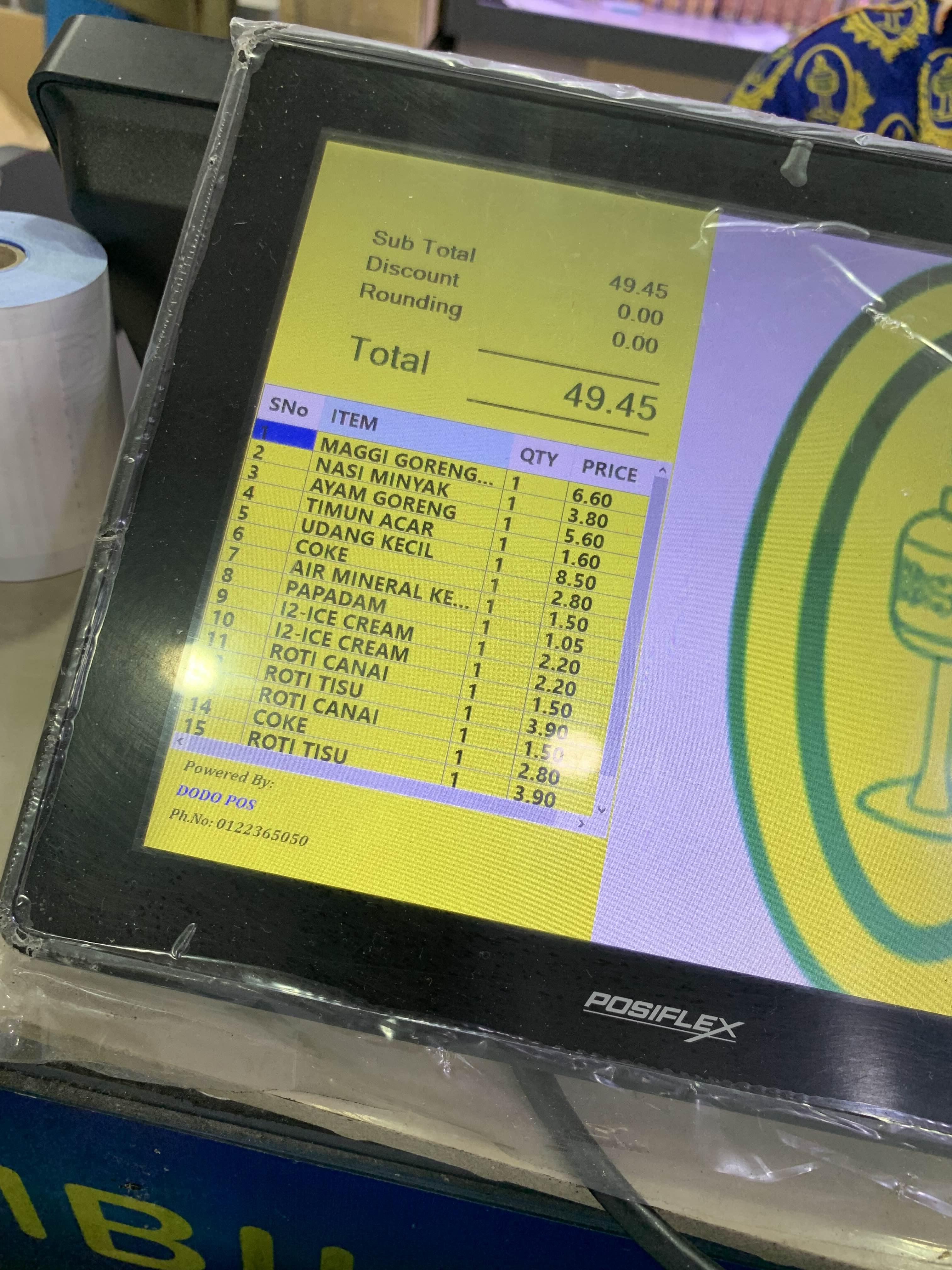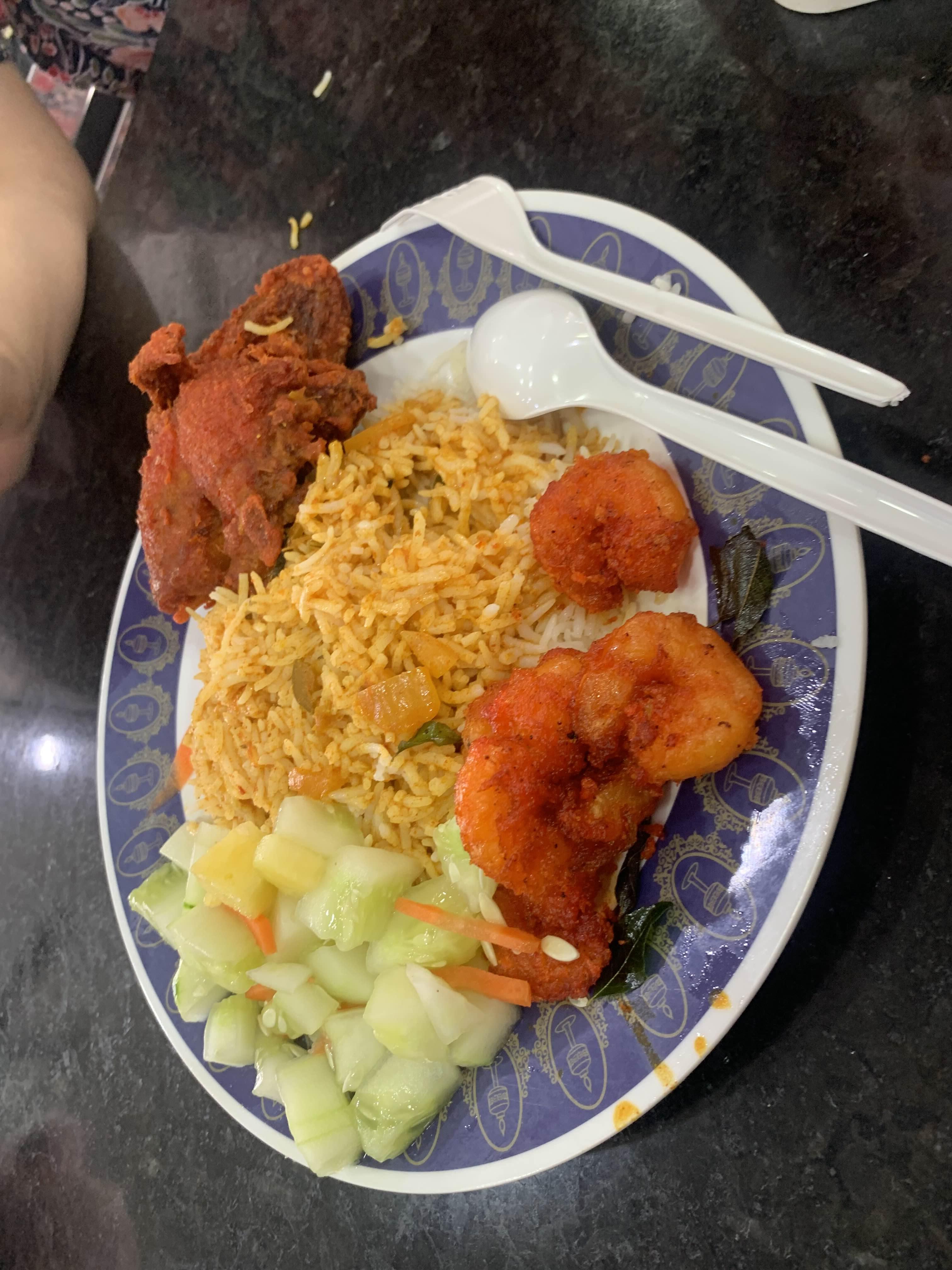 주문내역 : 밥(나 시민약 3.8링깃), 닭튀김(아얌고렝 5.6링깃), 새우튀김(우당 케이실 8.5링깃), 오이지(티문 에이카 1.6링깃)