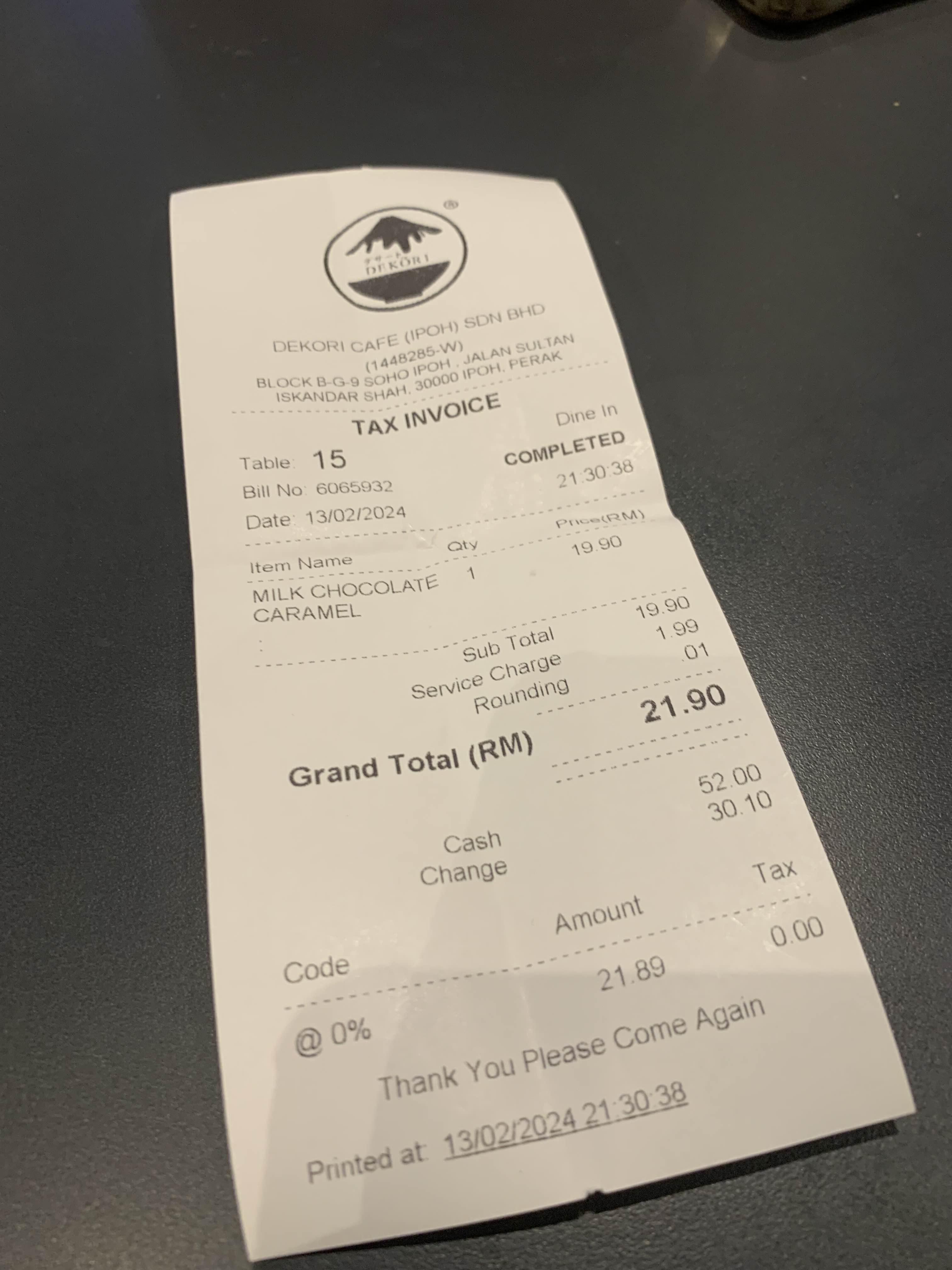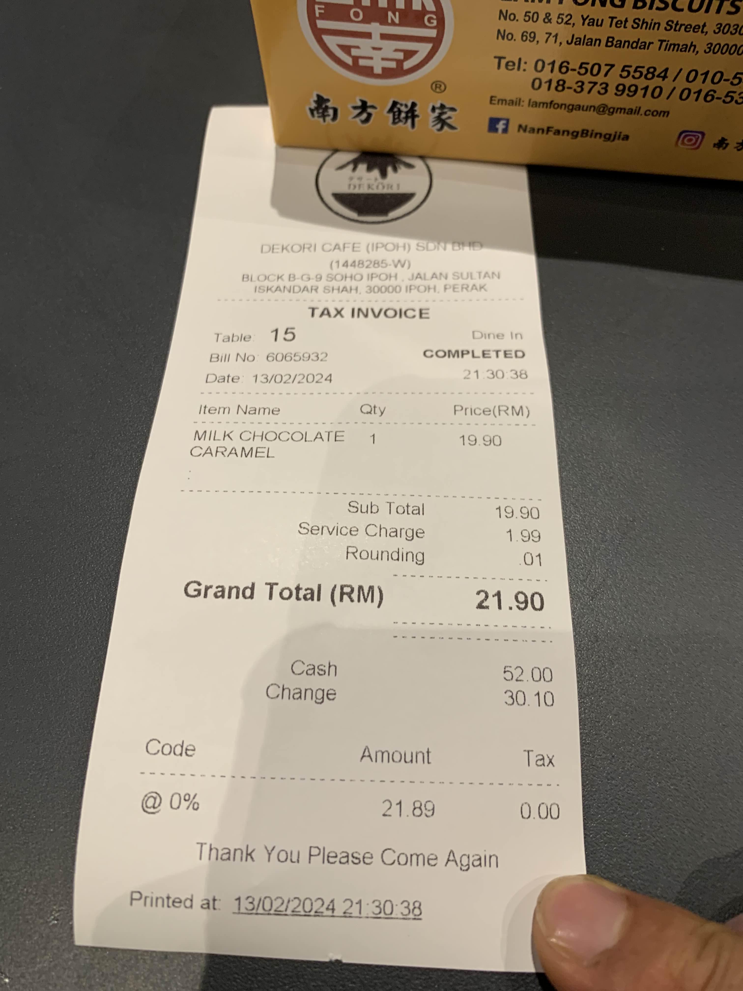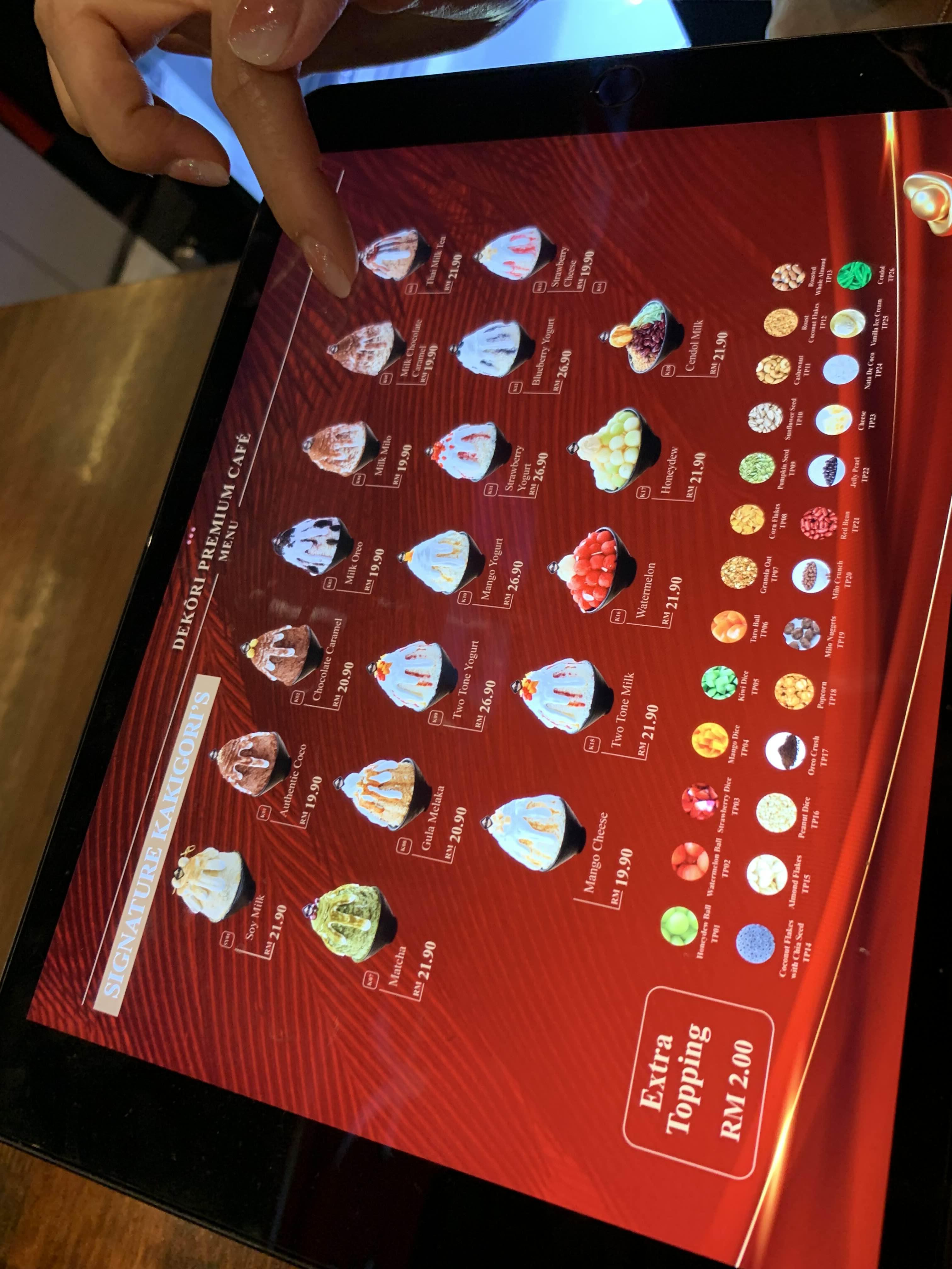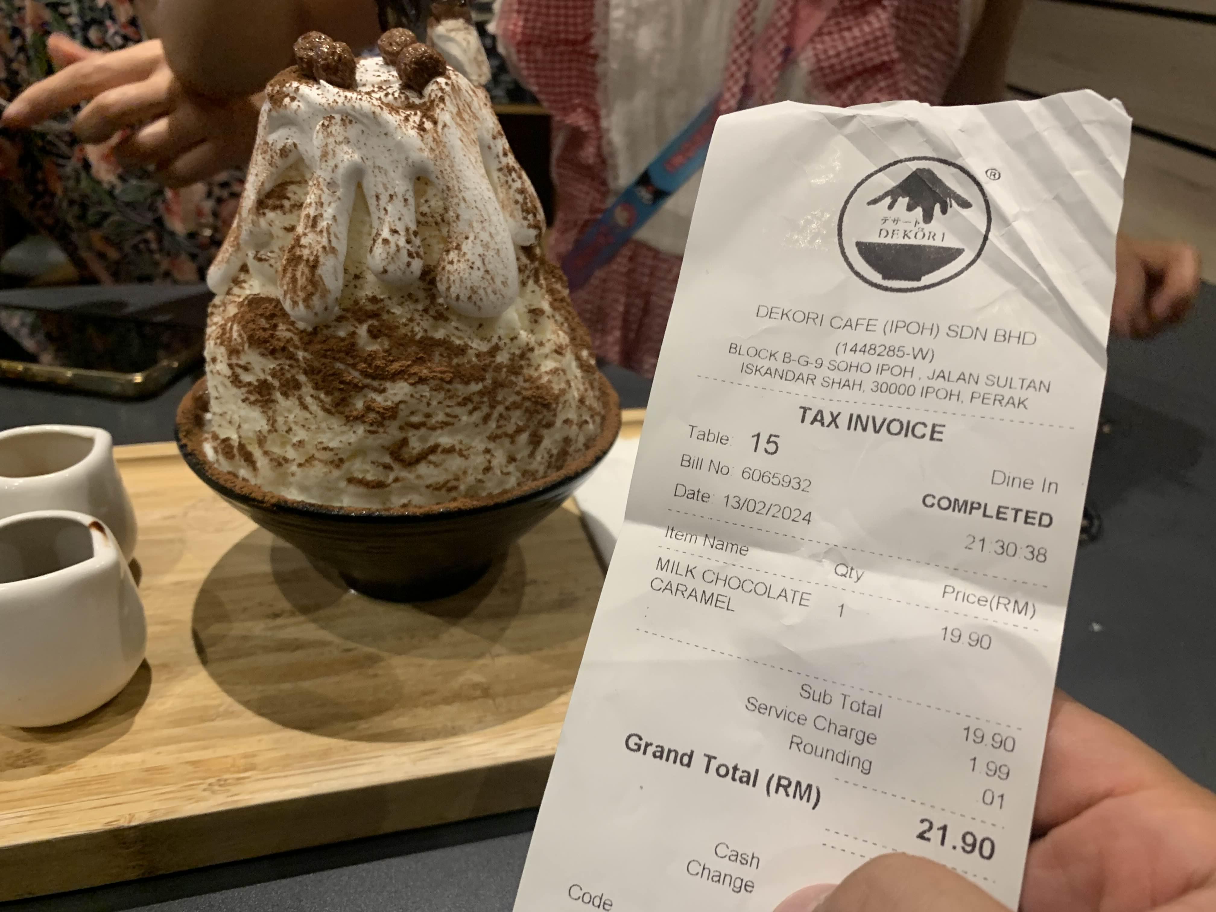빙수는 밀크초콜릿 빙수... 가격은 19.9링깃, 서비스 차지는 1.99링깃... 그리고 단수정리(라운딩) 0.01링깃이 올라가... 21.9링깃(약 6,600원)으로 한국에서 먹었던 빙수 가격보다는 저렴!
