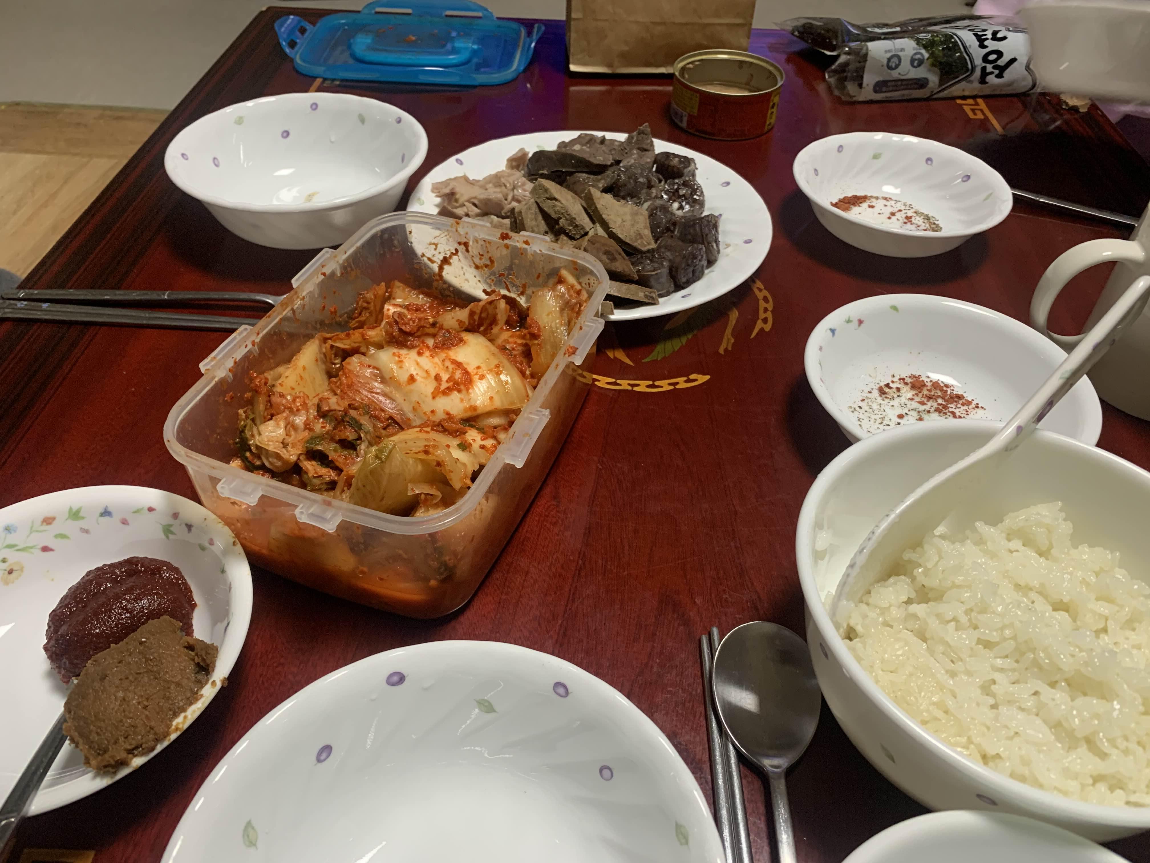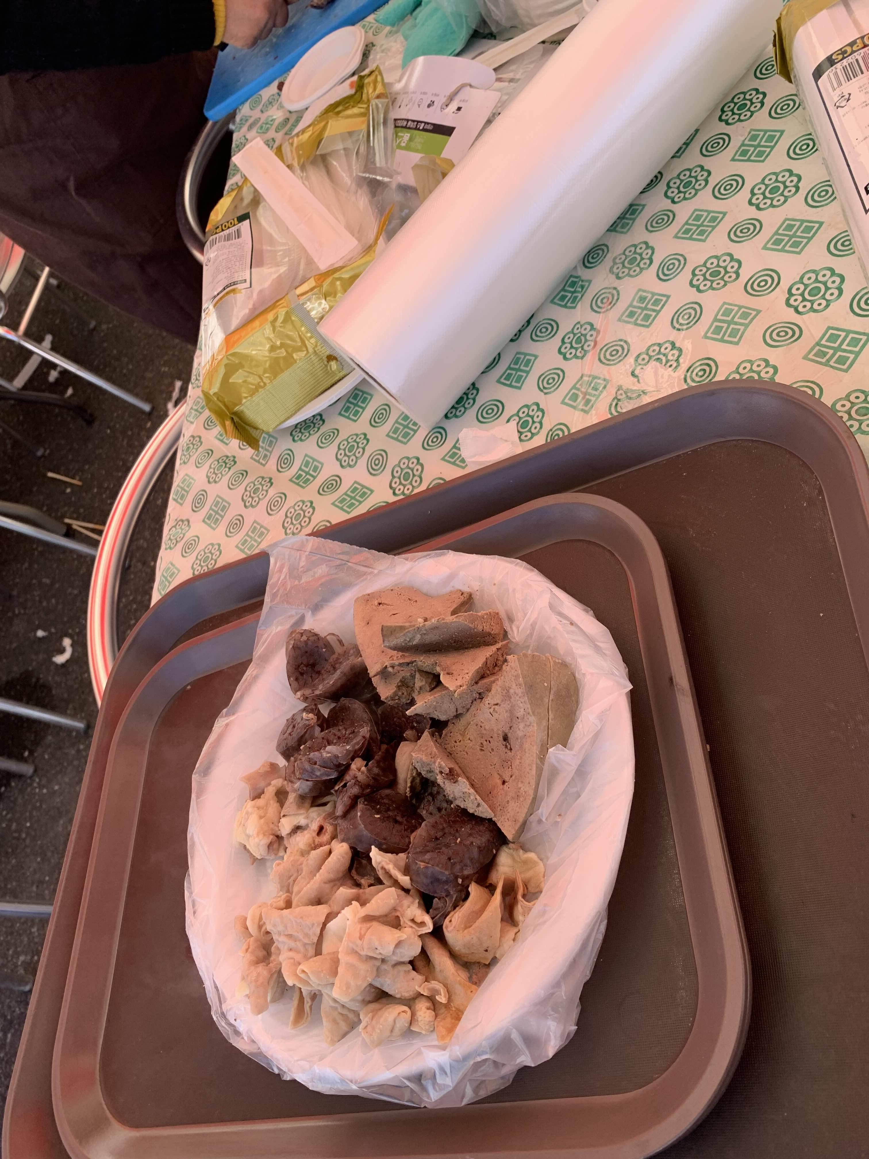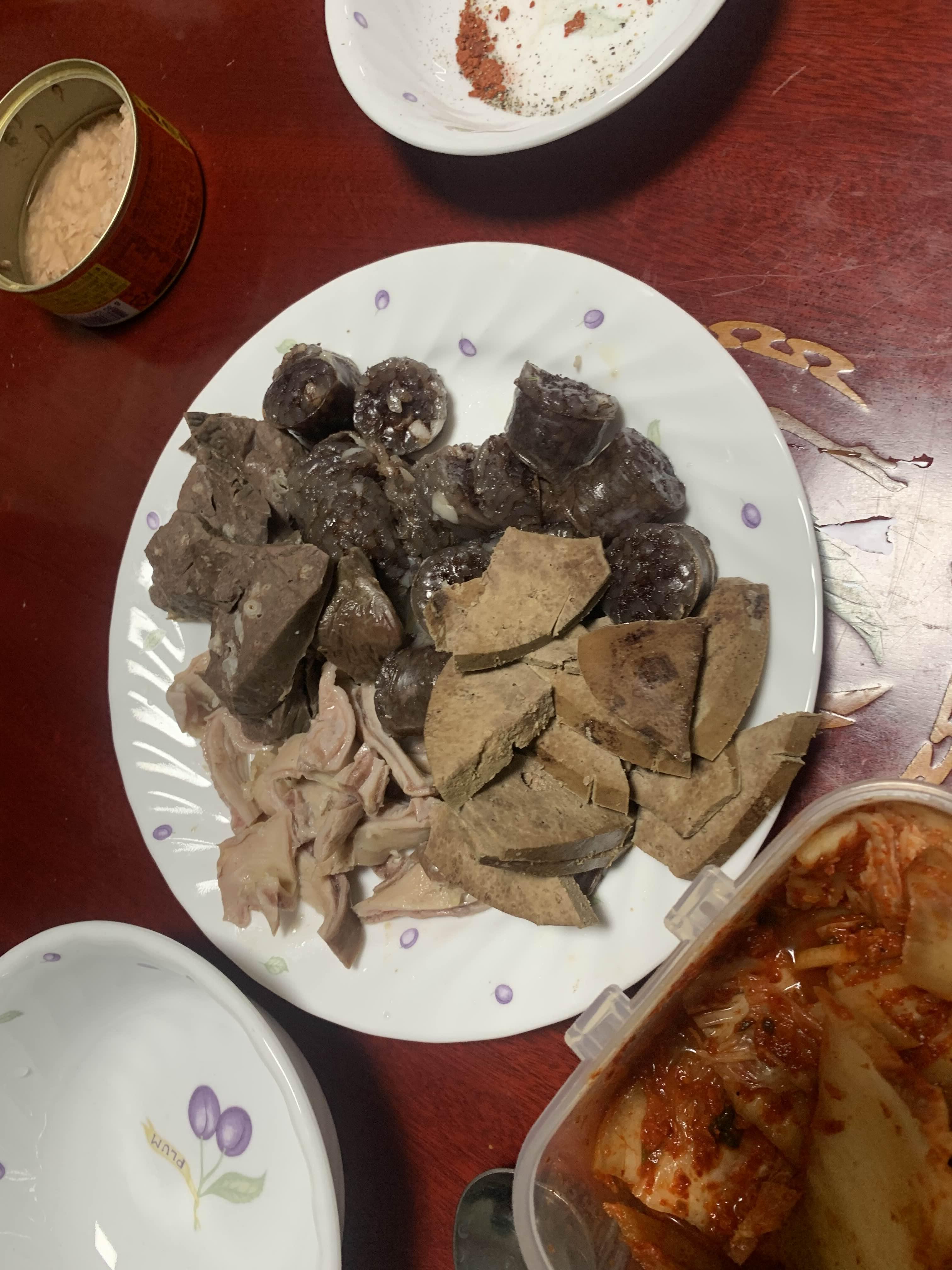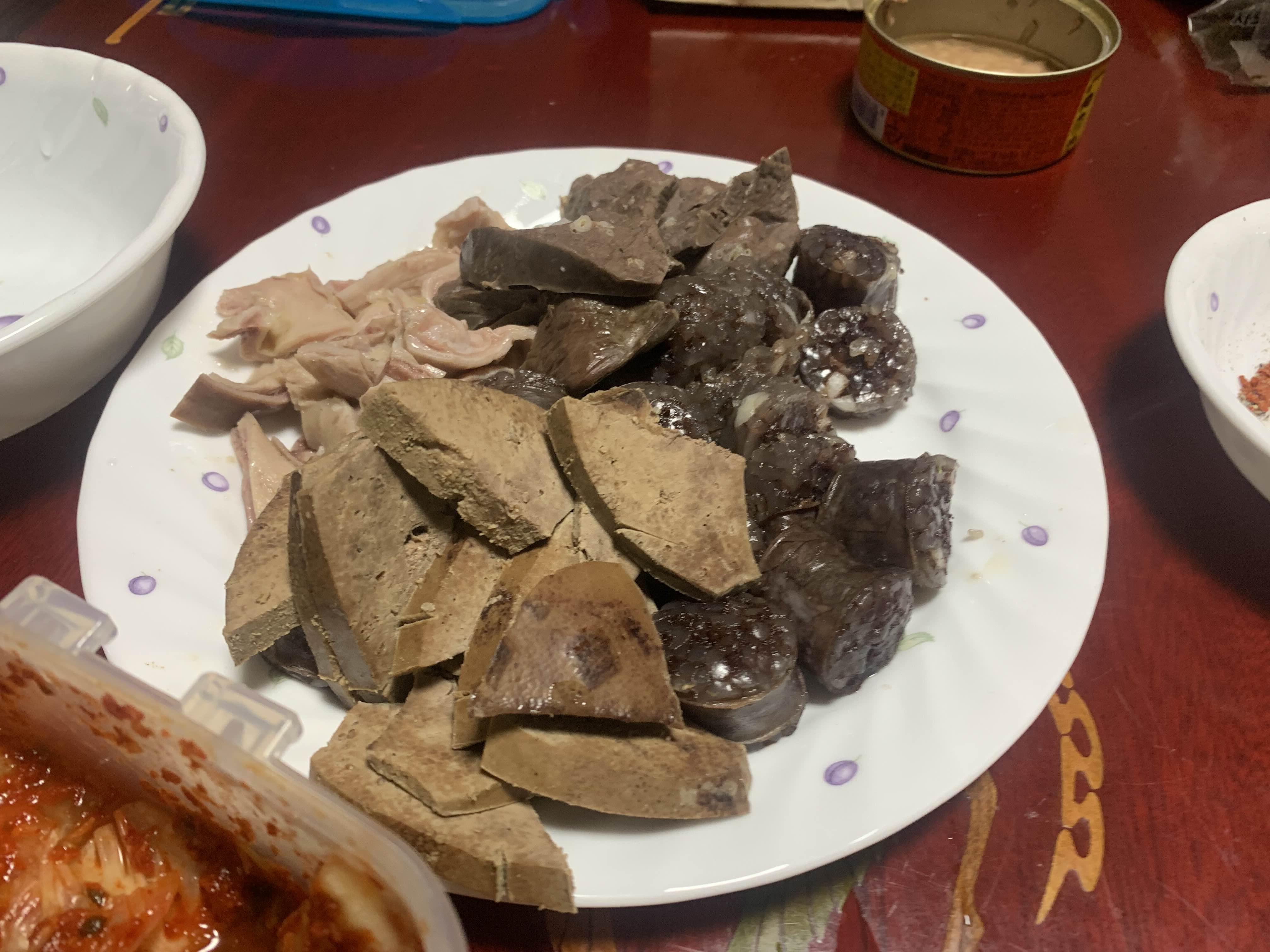 집에서 순대를 데워서 막걸리와 맛본다.