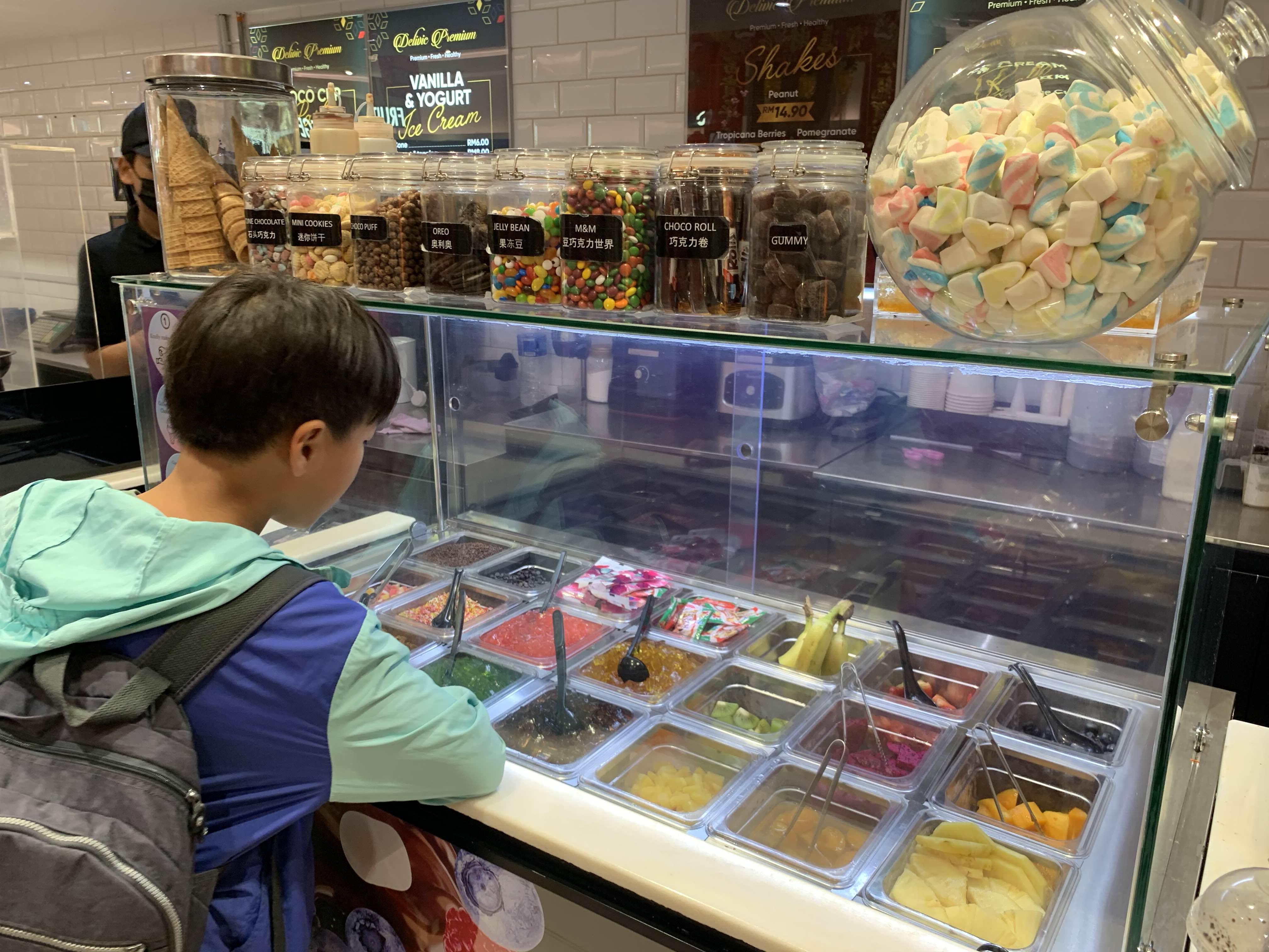 트윈타워 아래쪽 쇼핑몰에서 아이들은 철판 아이스크림 하나씩 맛본다.