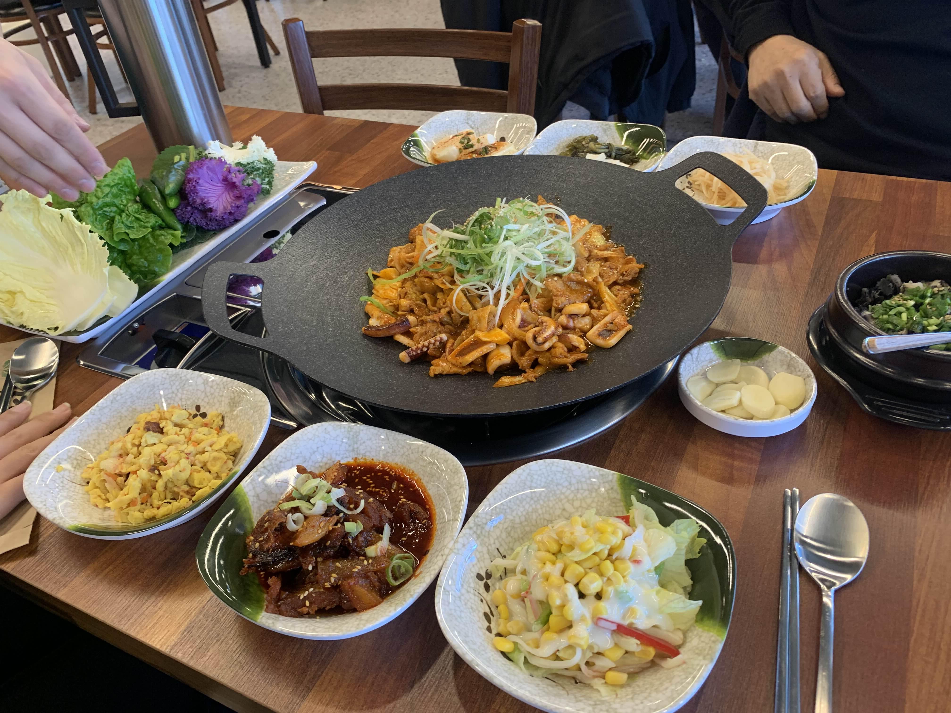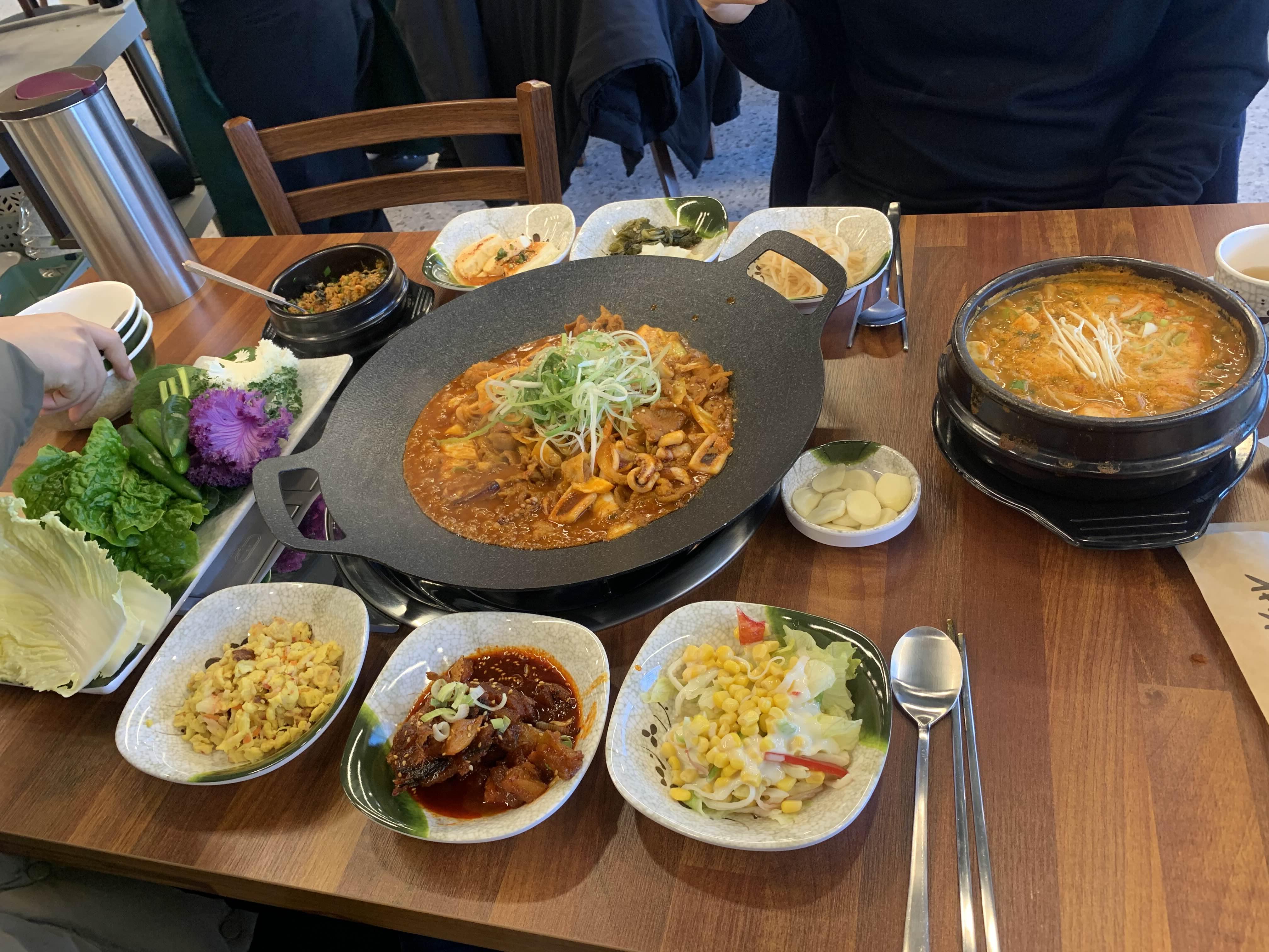 청국장과 오삼불고기의 조합! 그리고 다양한 쌈채소와 우렁쌈장!