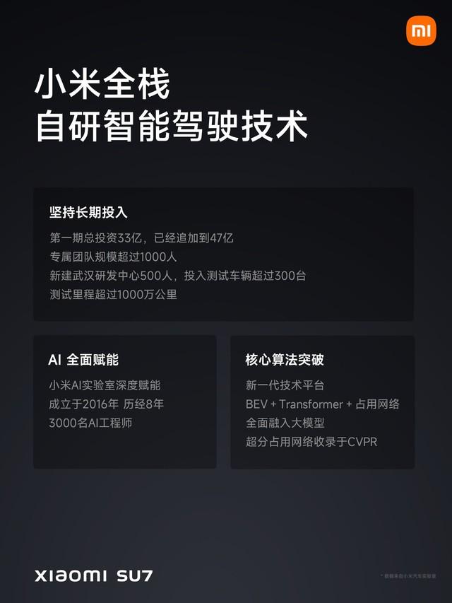 실제 차량 도로 테스트가 1천만 킬로미터에 달하는 샤오미의 스마트 드라이빙도 매우 강력합니다! 풀스택 자체 개발, 하이 및 로우 구성 기술은 동일한 소스에서 나옵니다! 모든 시리즈는 발레파킹과 초협소 주차공간을 지원하며, 고속 파일럿은 출시와 동시에 납품되며, 시티 파일럿은 8월 전국 출시될 예정이다. 2024년에는 지능형 운전업계 1차 진영 진입을 목표로 하고 있다.