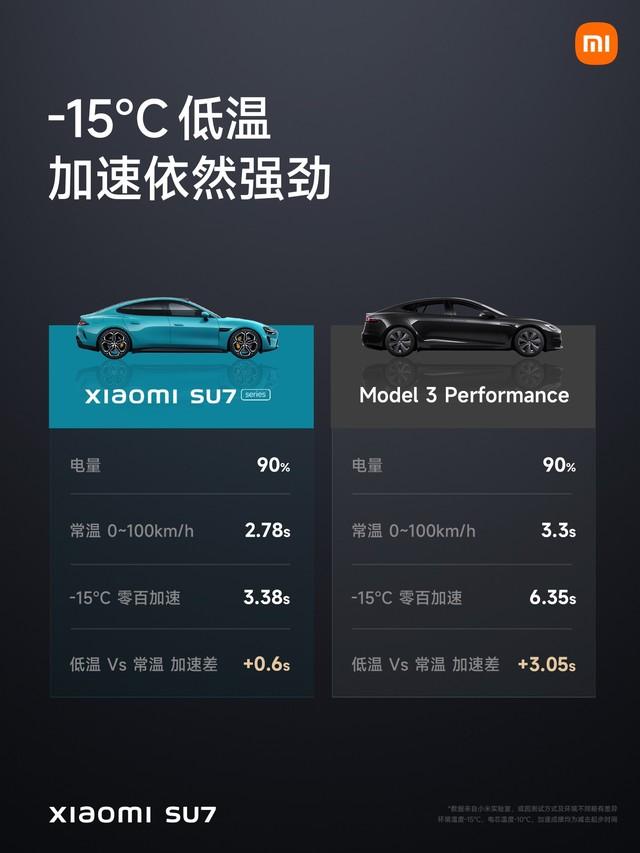 샤오미 SU7의 성능은 2.78초 만에 0에서 0까지 가속하고 최고 속도 265km/h로 매우 강력하며, 샤오미 슈퍼 모터 V6s로 구동되는 강력한 듀얼 모터, 혁신적인 저온 고출력 배터리 기술, -15°C에서도 가속력은 여전히 강하다.