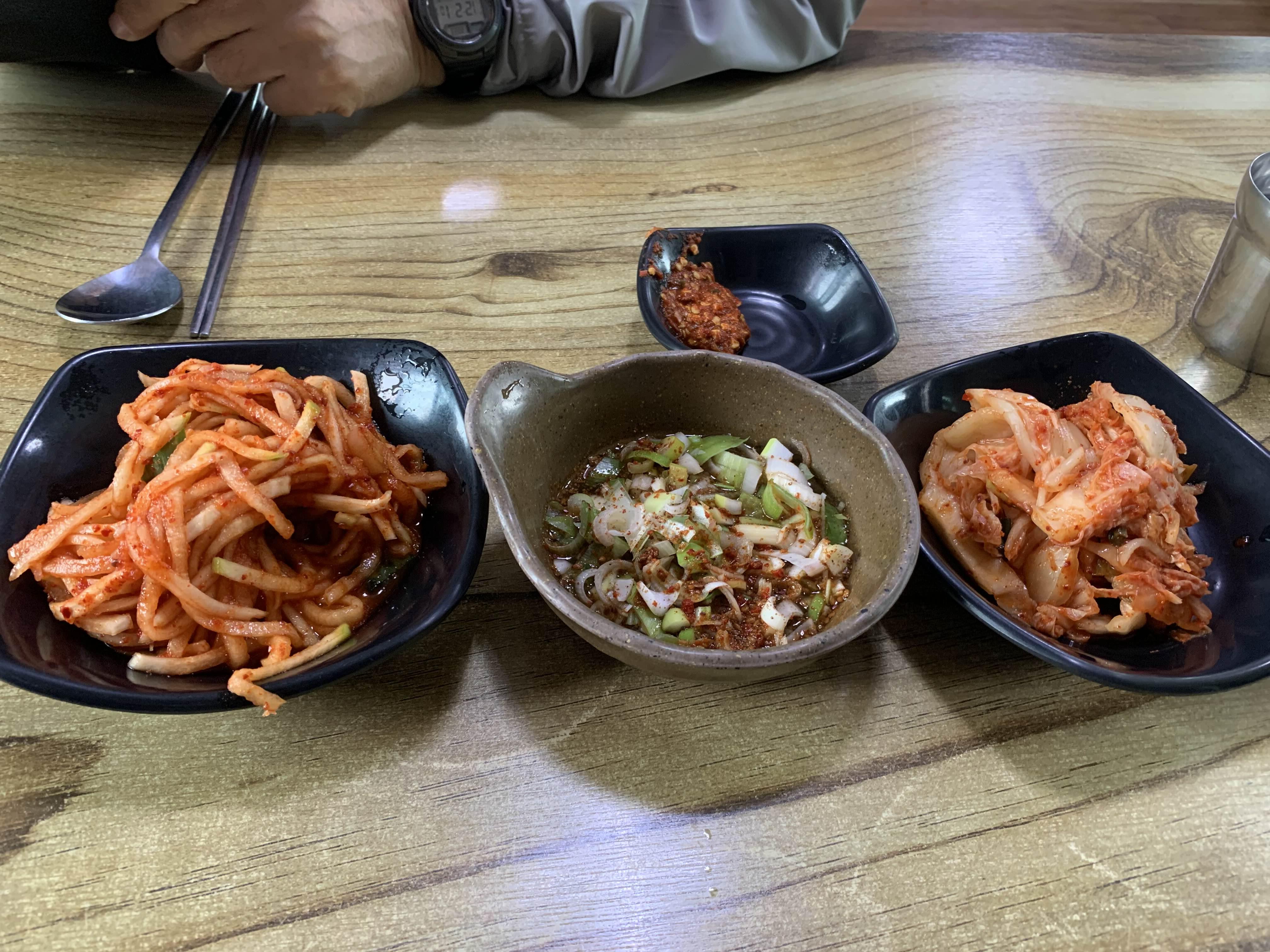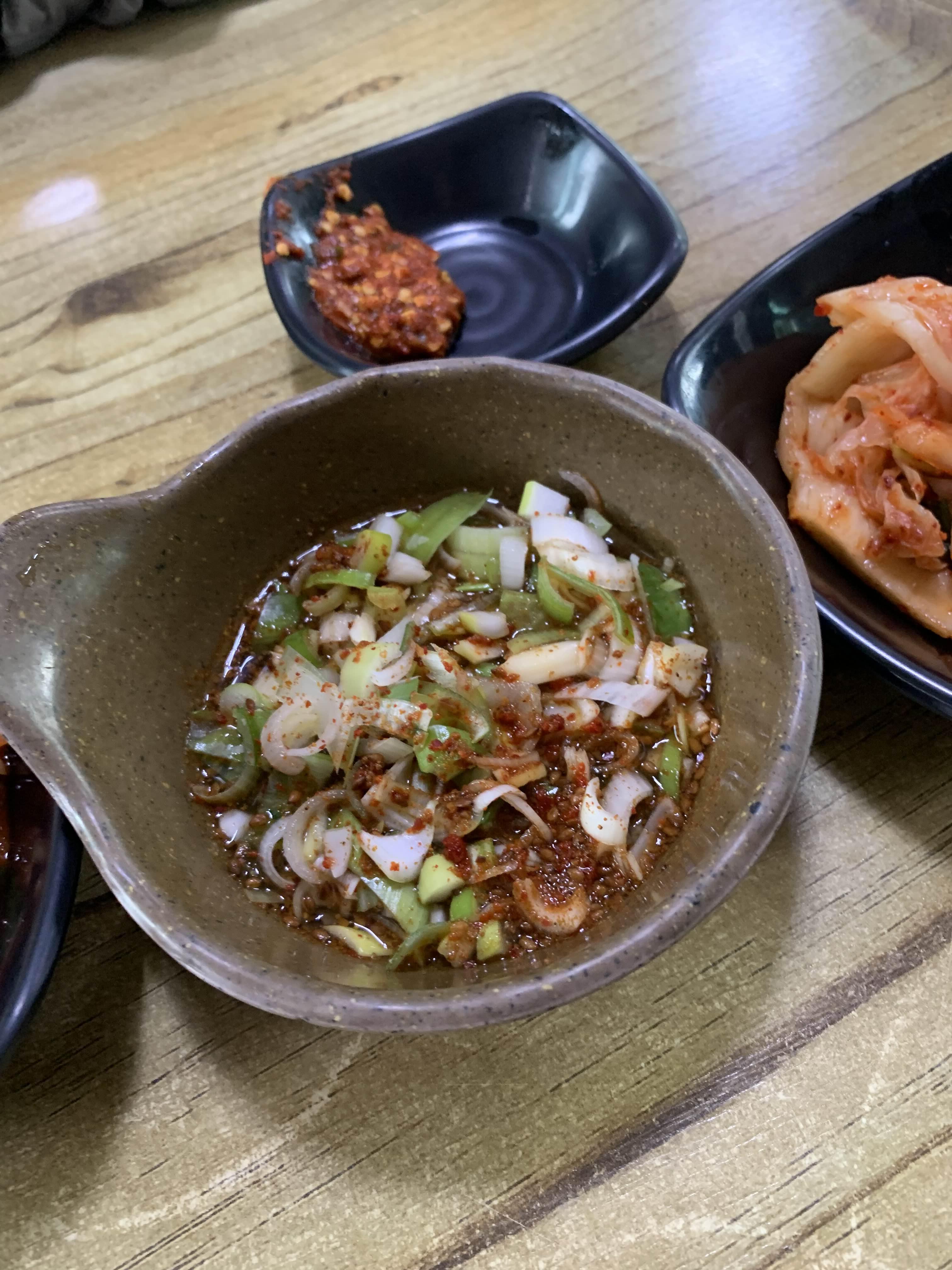 기본상으로 무생채와 배추김이 양념장은 간장과 고추장 배이스의 2가지 양념장이 나오더군요.