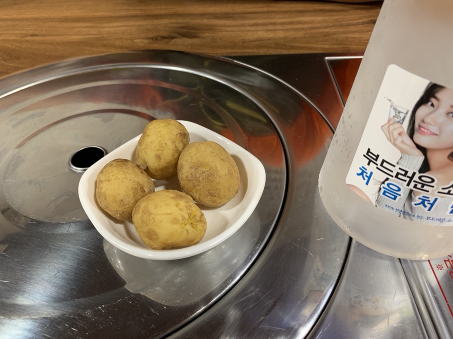 식당 간판이.... 시골밥상 보리밥이라... 보리밥만 있을 줄 알았는데, 메뉴가 상당히 많이 있네요. 제육덮밥, 된장찌개, 김치찌개, 갈치조림, 제육볶음, 우렁이 회 무침, 골뱅이 소면, 가오리 찜? 오리주물럭, 닭볶음탕, 삼겹살, 무뼈닭발, 김치부침개, 부추 부침개..... 참 많은 메뉴가 있네요. 우선 보리밥 전문점?이라 7,000원 보리밥을 친구는 7,000원 제육덮밥을 주문했습니다. 가격이 저렴하지는 않네요. 7,000원이면, 밑반찬이 잘 나올 거라는 생각이 들어서 기대해 봅니다. 주문하고 잠시 후 감자가 나오네요. 입가심으로 가볍게 감자 시식^^