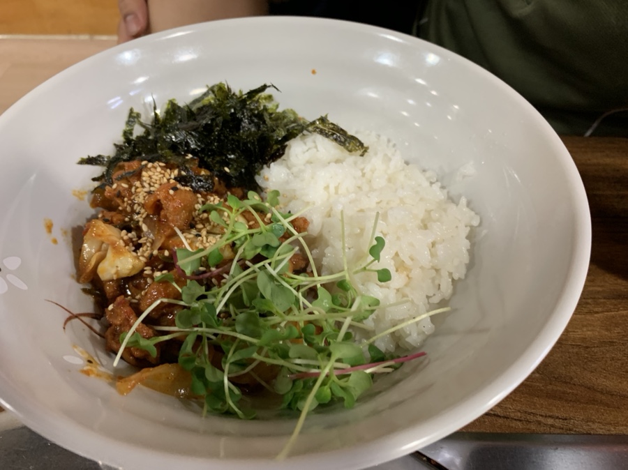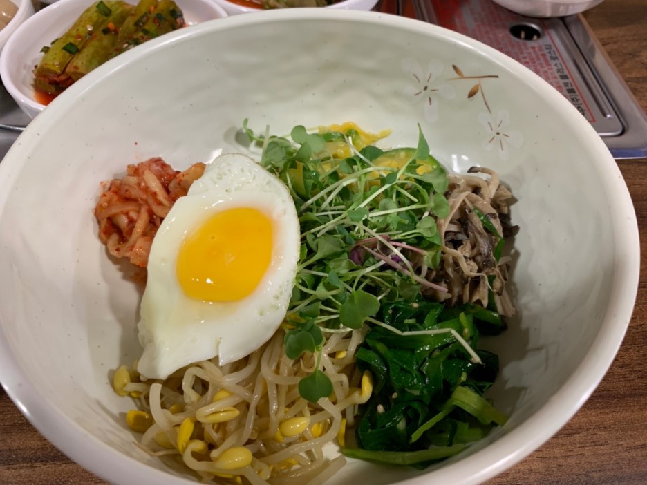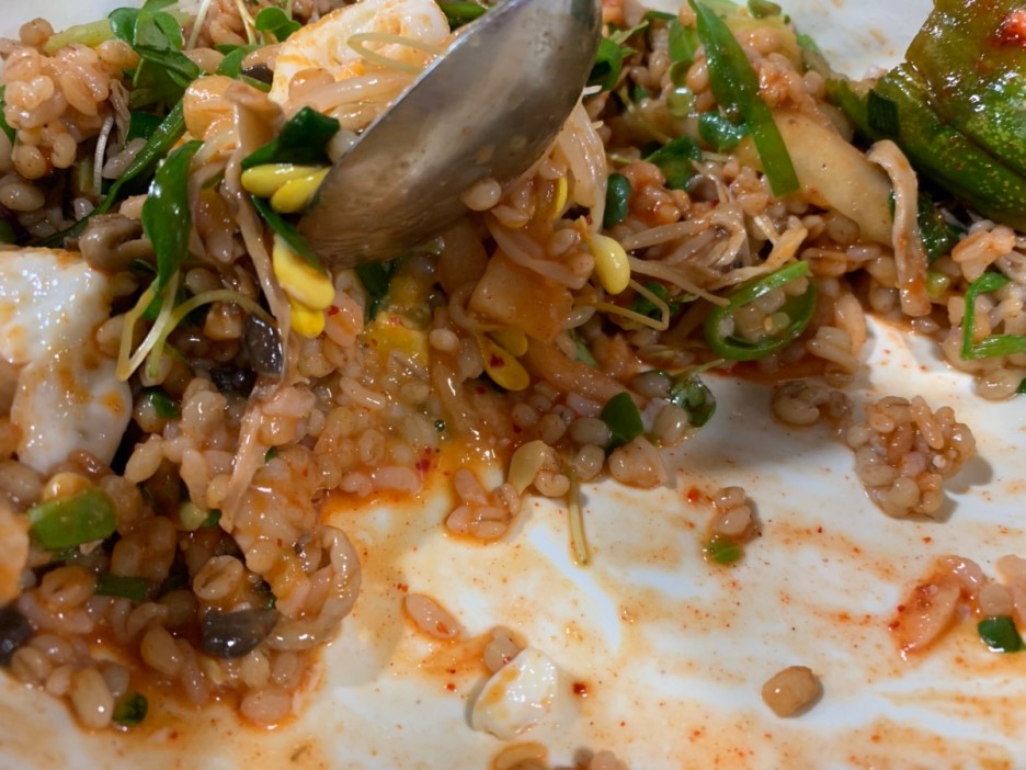 보리밥은 계란 반숙, 시금치, 콩나물, 새싹?(새싹비빔밥 느낌이 들어서 별로임), 버섯, 호박 조림이 들어있었네요. 테이블에 있는 고추장(약간 물기 있는 고추장인데... 초장 느낌)을 넣어서 비벼 먹는데.... 나물에서 너무 물기가 많이 있어서.... 비빔밥에 물 1/5컵 정도 들어있는 느낌이 들었네요. 밑반찬으로 오이소박이와 버섯+메추리 장조림은 좀 오래된 느낌이 들었네요. 반찬을 직접 만드시는 게 아니라.... 반찬가게에서 사온 느낌이 들었습니다. 반찬이 맛이 없다기 보다, 반찬이 오래된 식감이네요. 친구 제육덮밥은.... 미리 만들어두신 제육덮밥을 떠주셔서 빨리 나오는데..... 고기는 바로 만들어야 맛있는데.... 좀 아쉬움이 남음;;