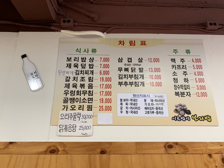 보리밥을 먹어보고 추가 음식을 주문하려고 하였으나 주문하지 않았습니다. 보리밥 양념장은 일반 고추장, 반찬들은 맛이 없다기 보다.... 좀 오래된 느낌이었습니다. 식당에 손님이 없어서 방문할까 말까 고민했었는데.... 보리밥을 먹으며 근처 5,000원 백반집이 여러 번 생각이 났었네요.
