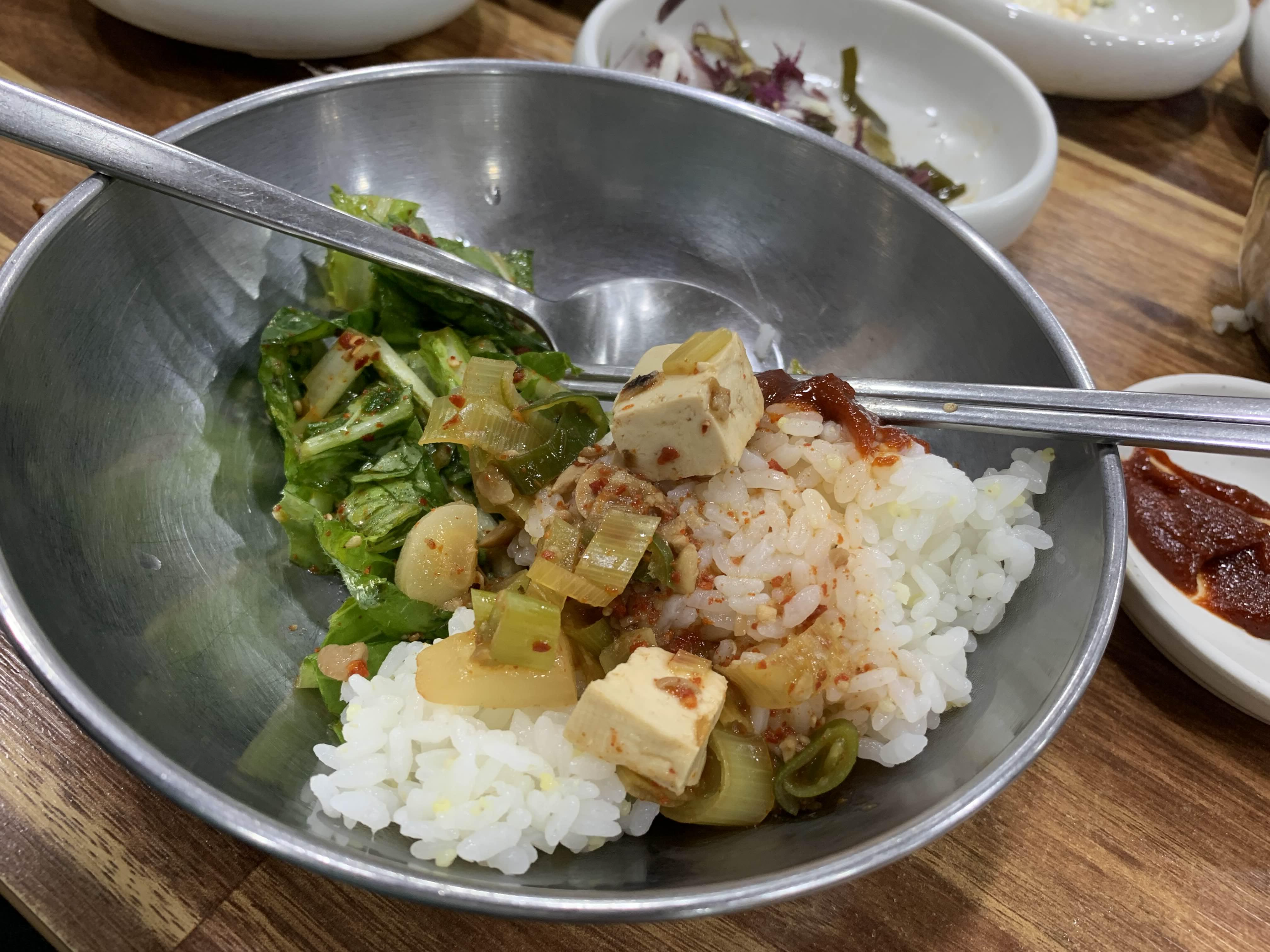 비벼 먹는 그릇에 밥과 된장찌개 그리고 고추장을 넣어서 비비면, 조합이 상당히 좋더군요.