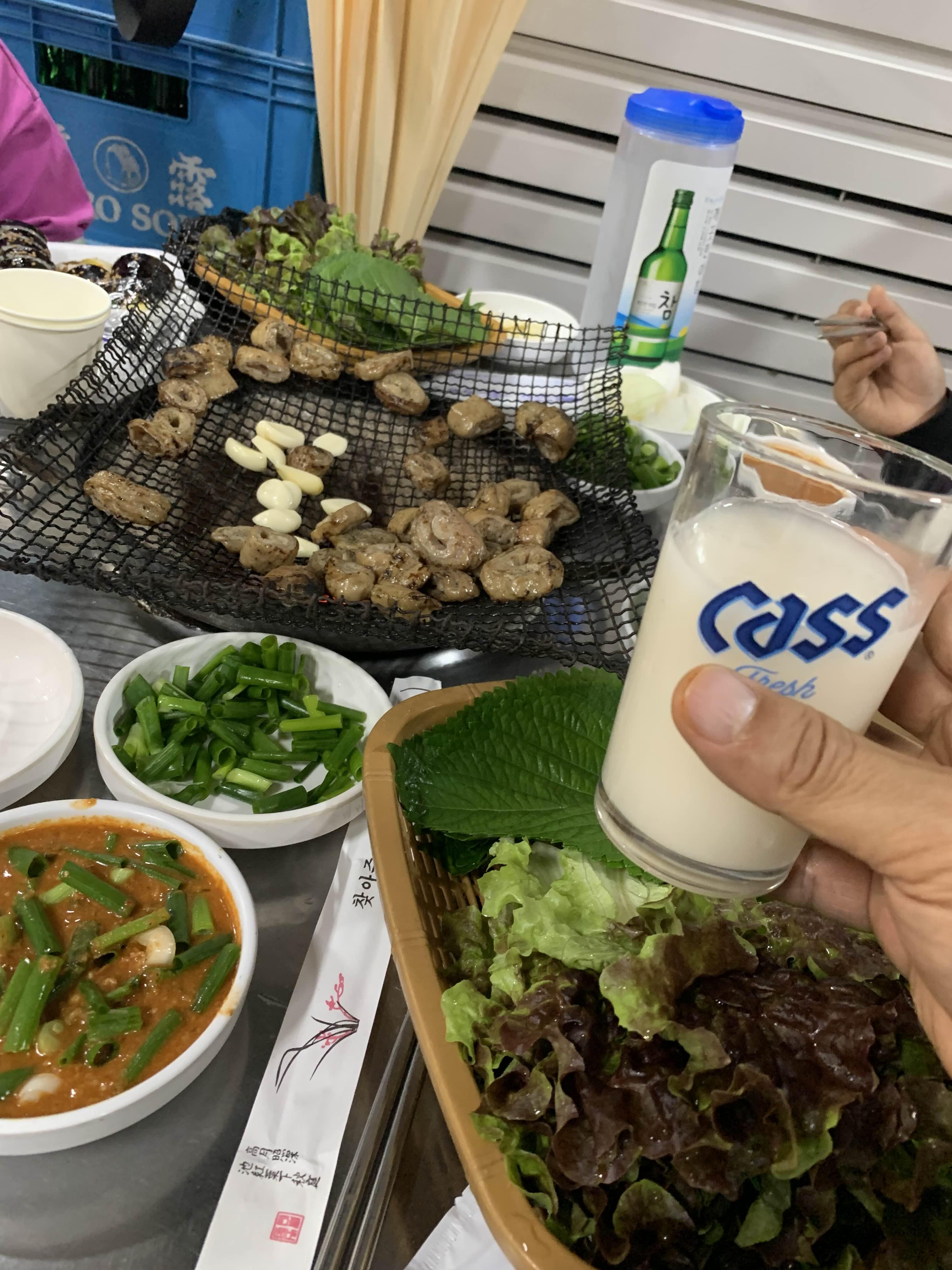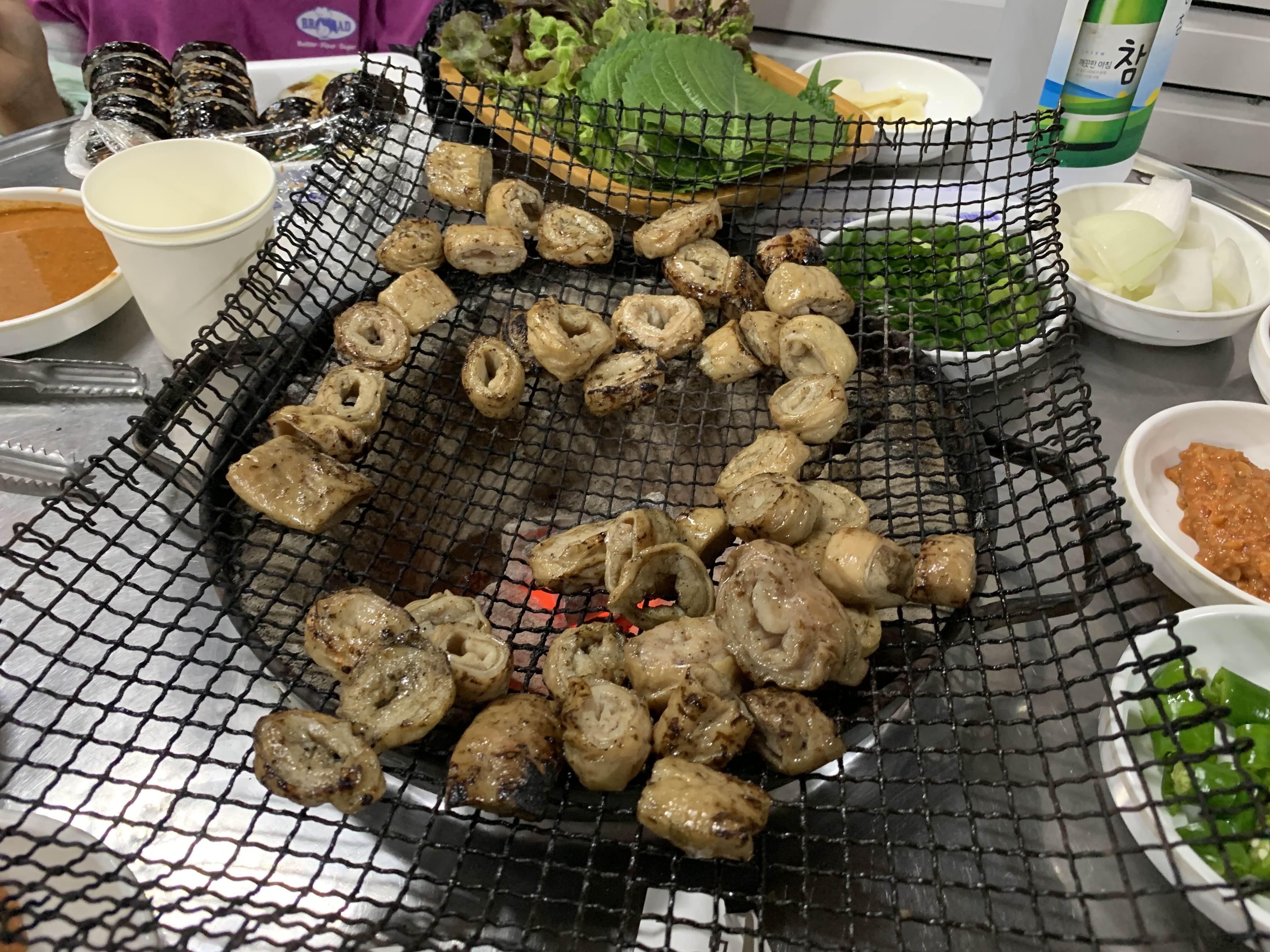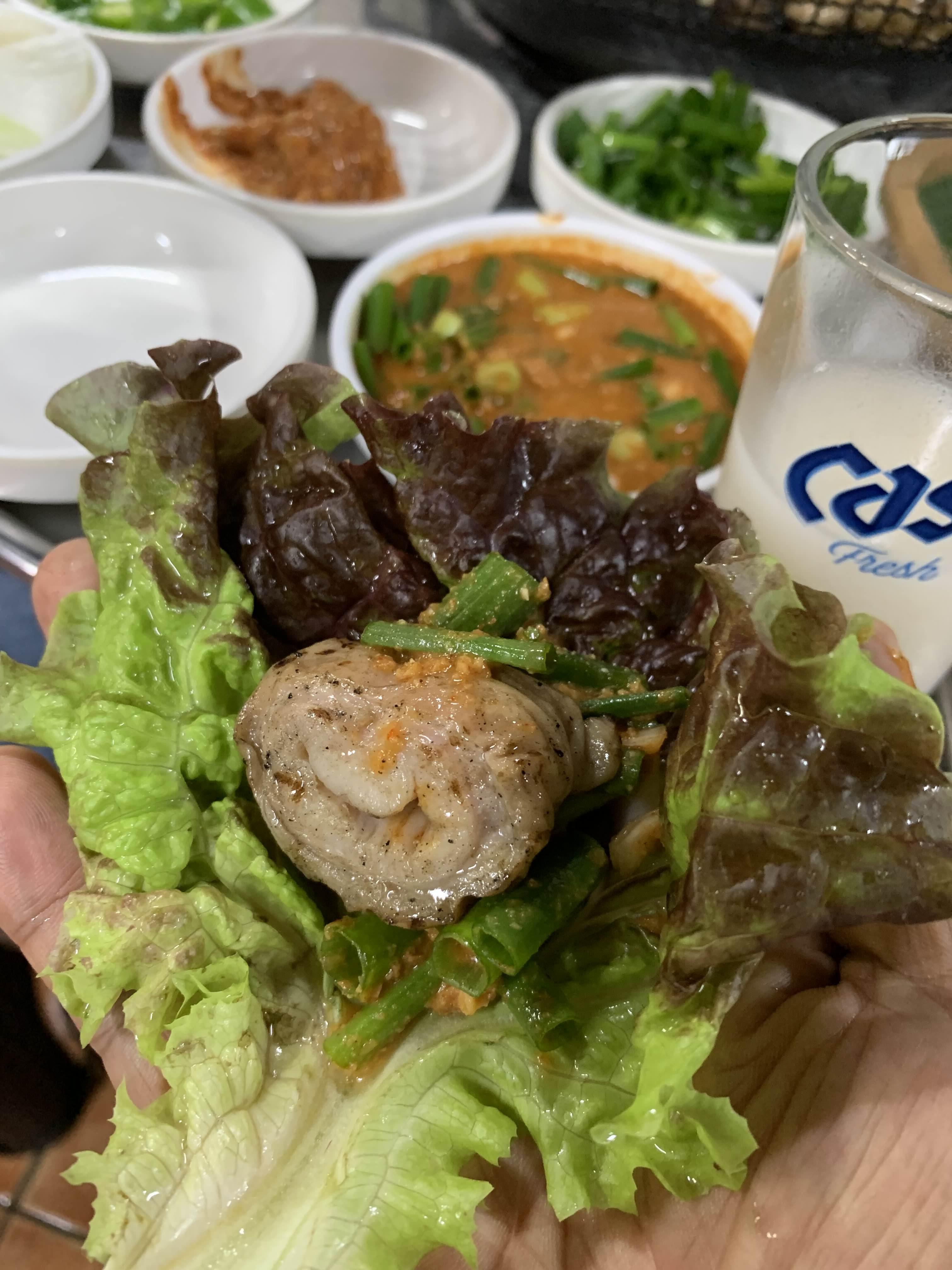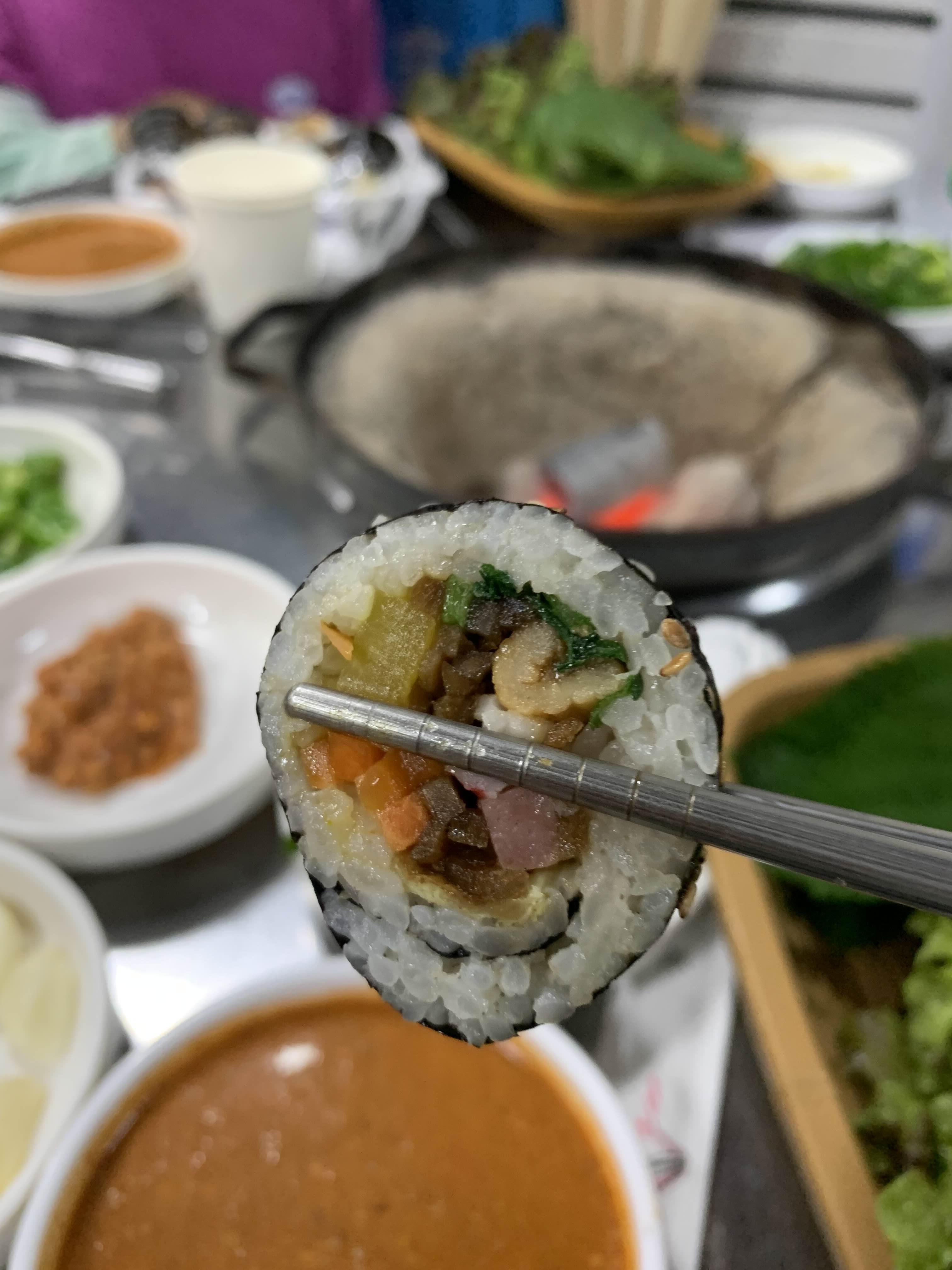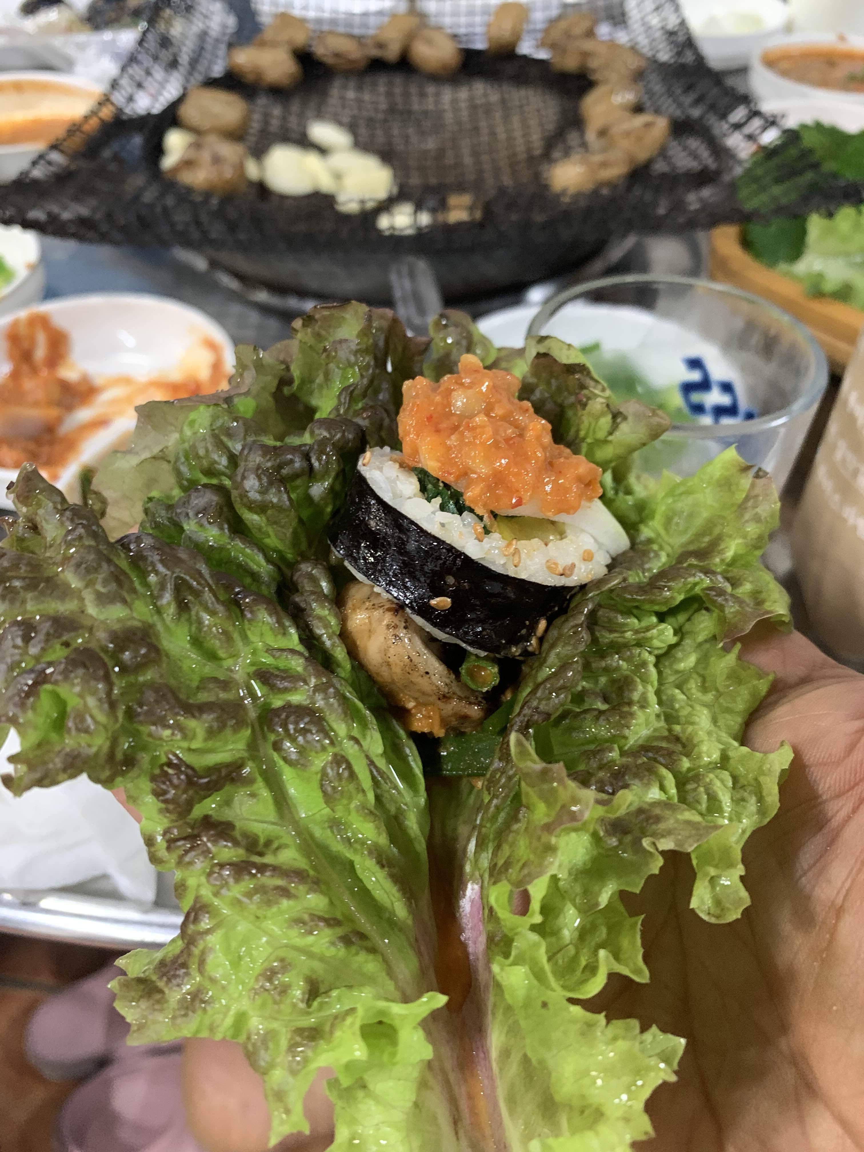 (아이용 김밥을 막창과 쌈 사 먹으니 별미였다.)