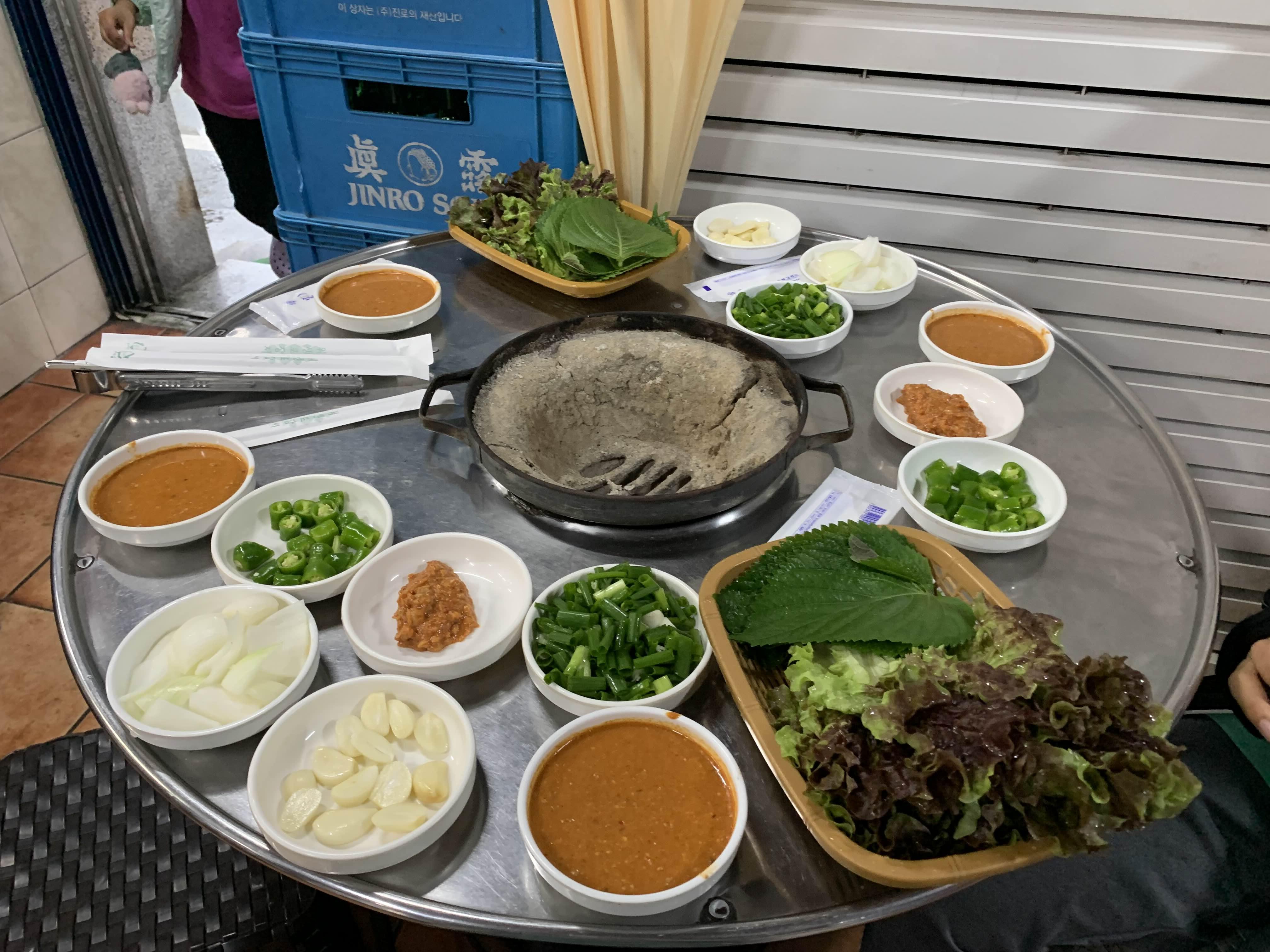 막창을 3개 주문한다. 기본세팅으로... 된장, 고추, 쪽파와 쌈채소 그리고.... 국물 된장인가? 소스가 함께 나온다.