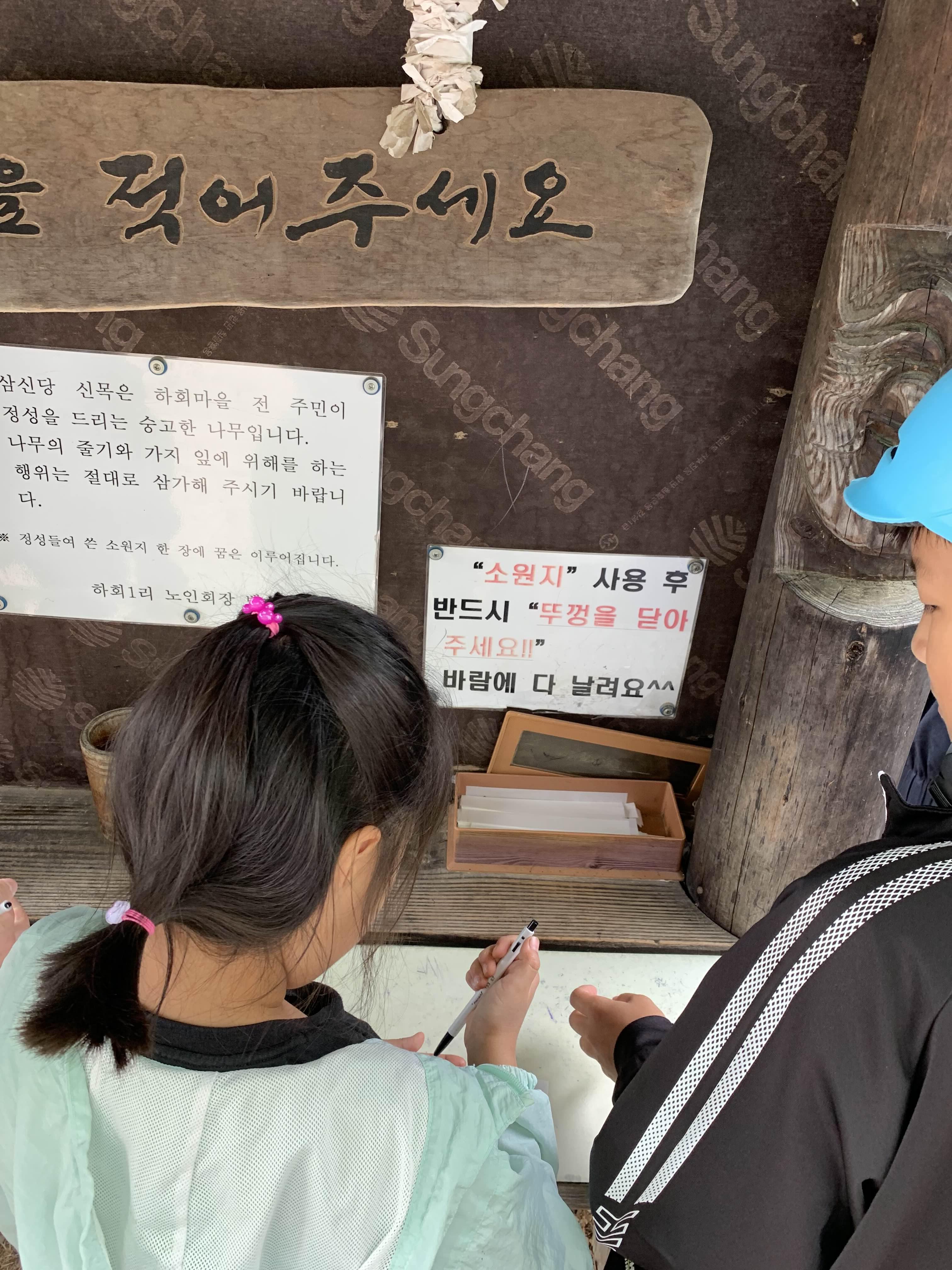 소원지에 소원을 적어서... 나무 주변에 있는 지푸라기 줄에 묶어준다.