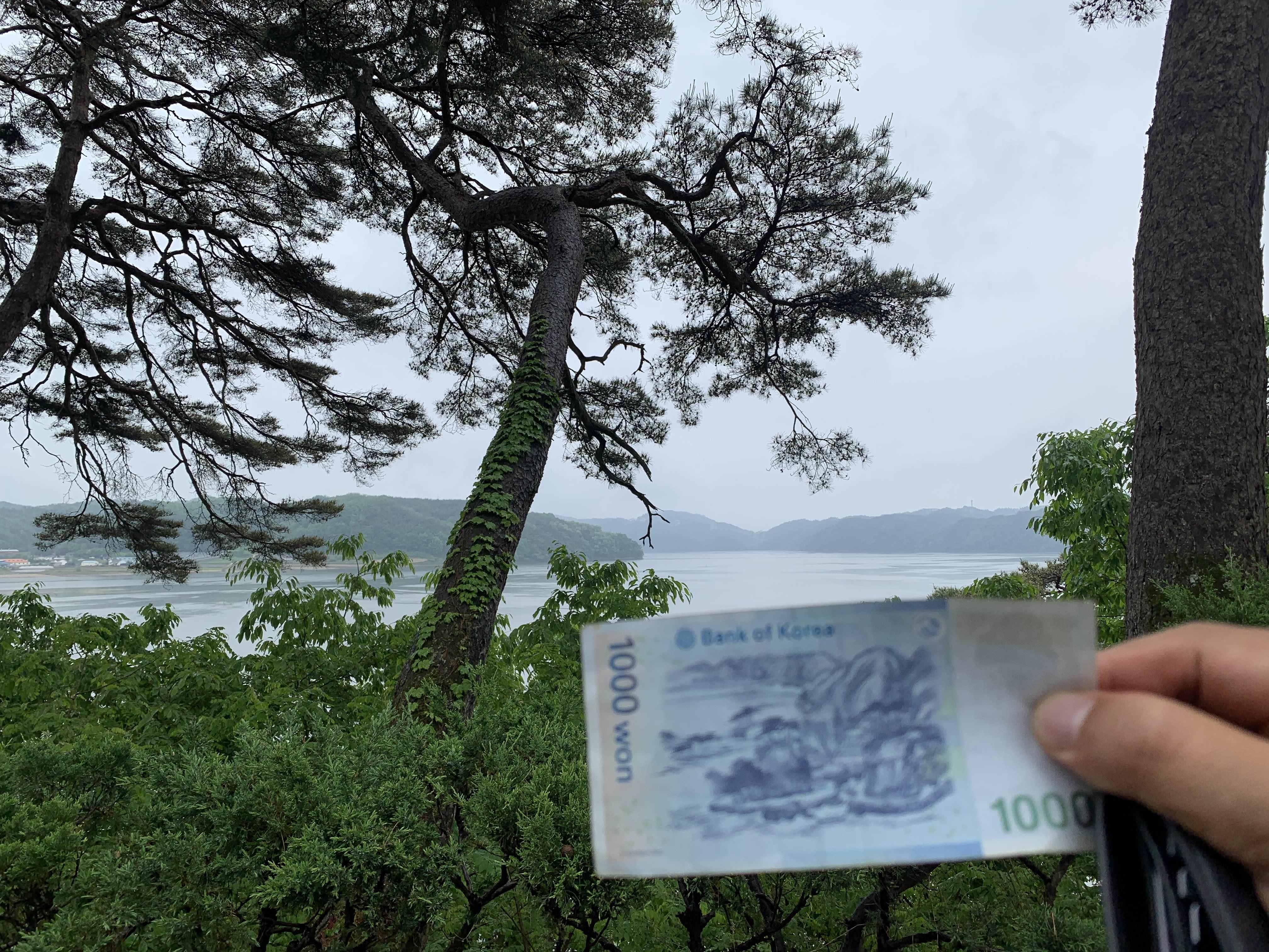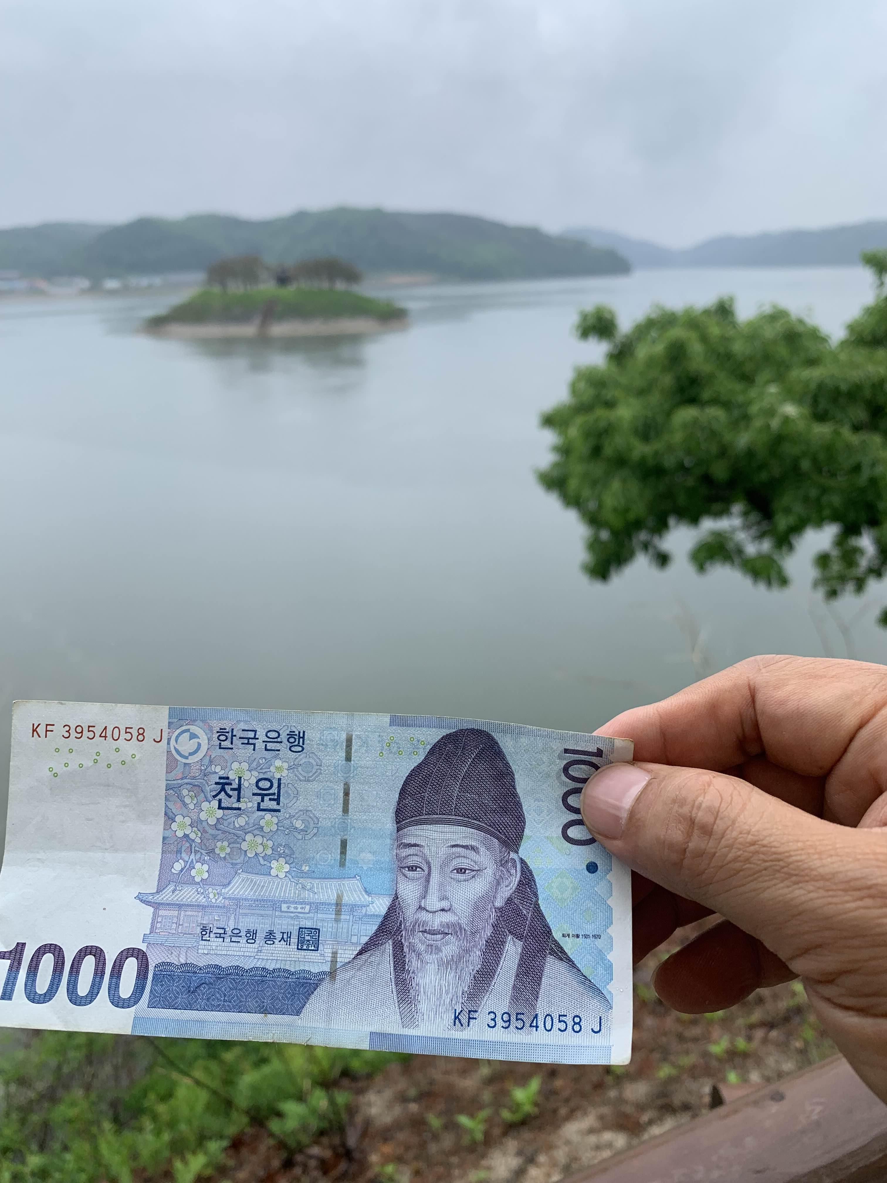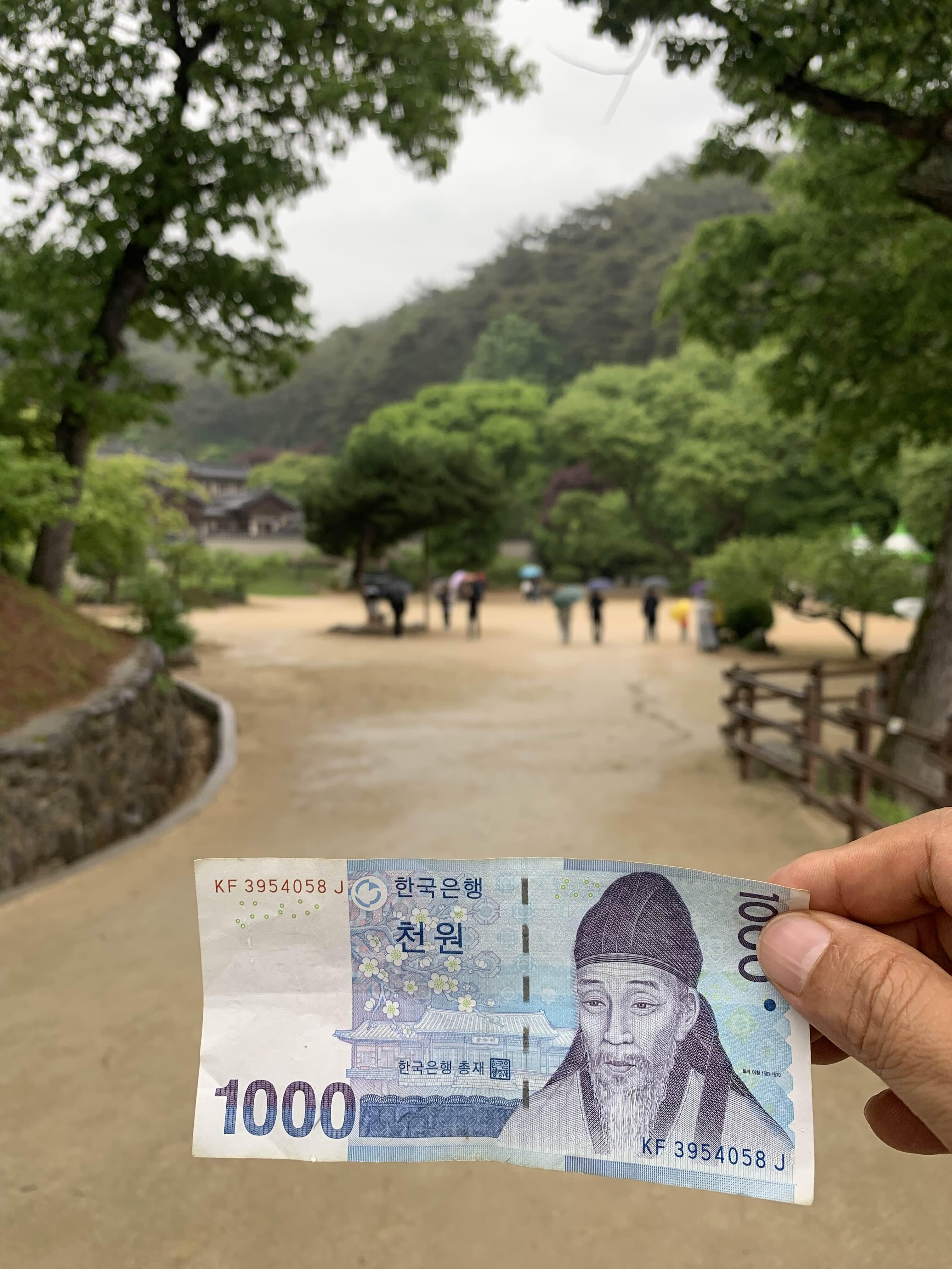 사람들이 천 원권 지폐를 가지고 도산서원과 비교해 본다.